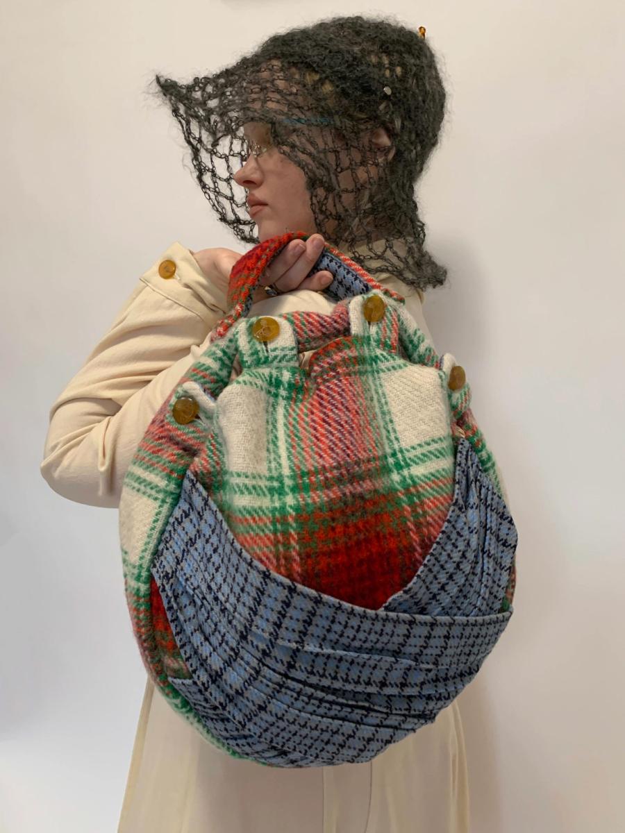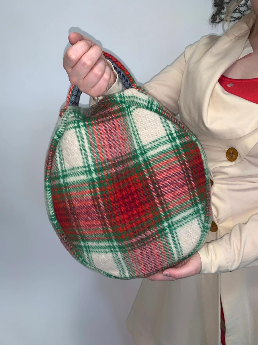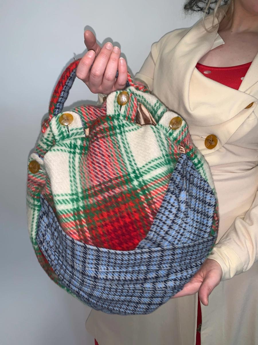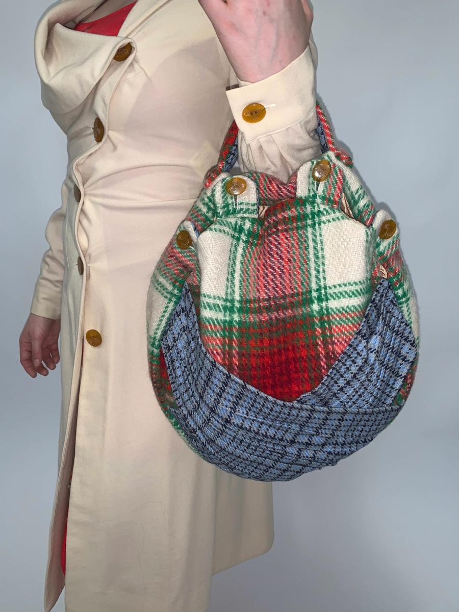 Incredible and rare Vivienne Westwood handbag from the iconic Time Machine/Pagan 1988-89 era, made of a gorgeous assortment of tartan fabrics, lined in flesh toned satin. It's a large circle with a secret inner compartment and orb button tab closures throughout, brilliant design. Westwood herself is pictured sporting the same design.