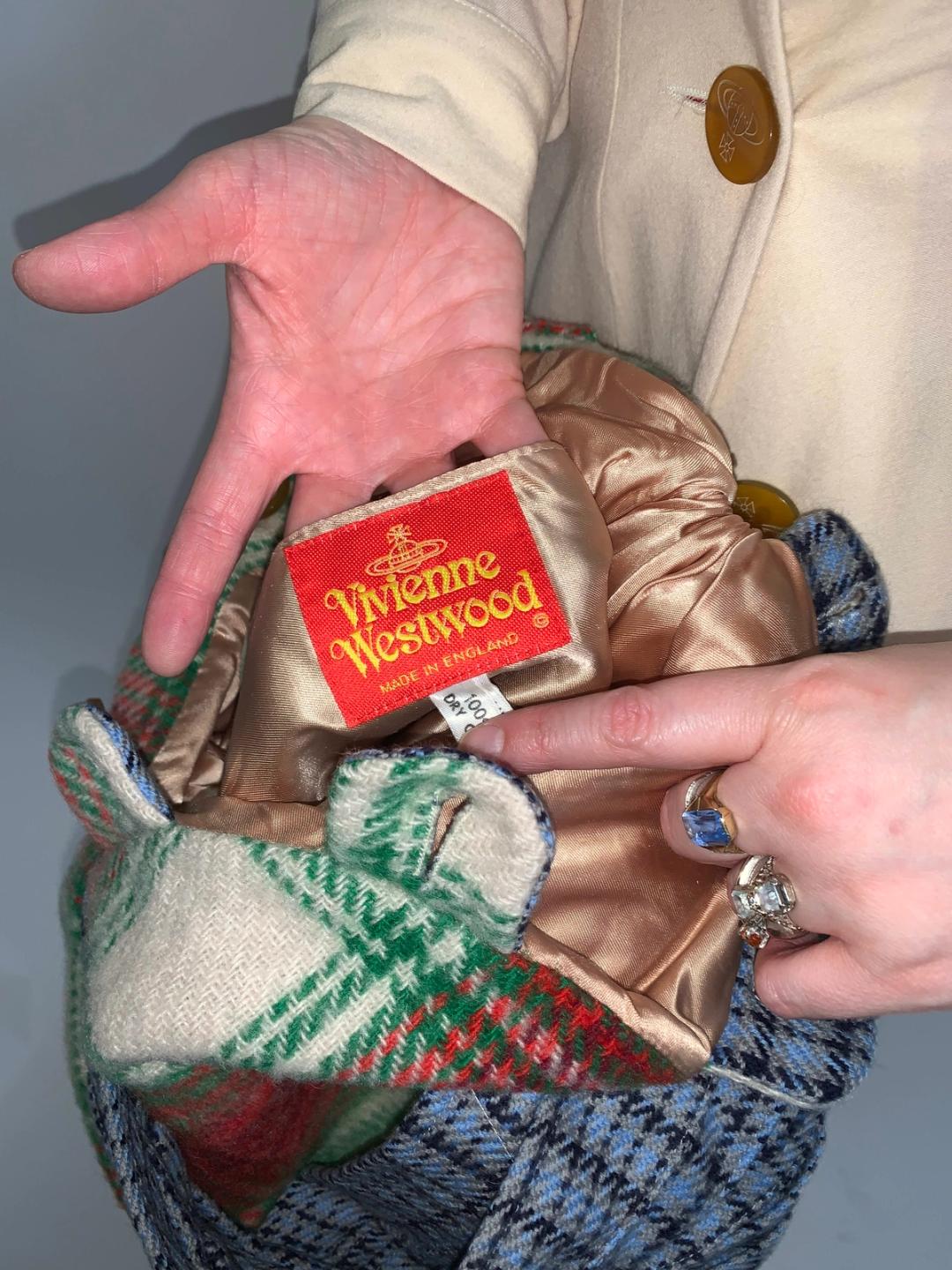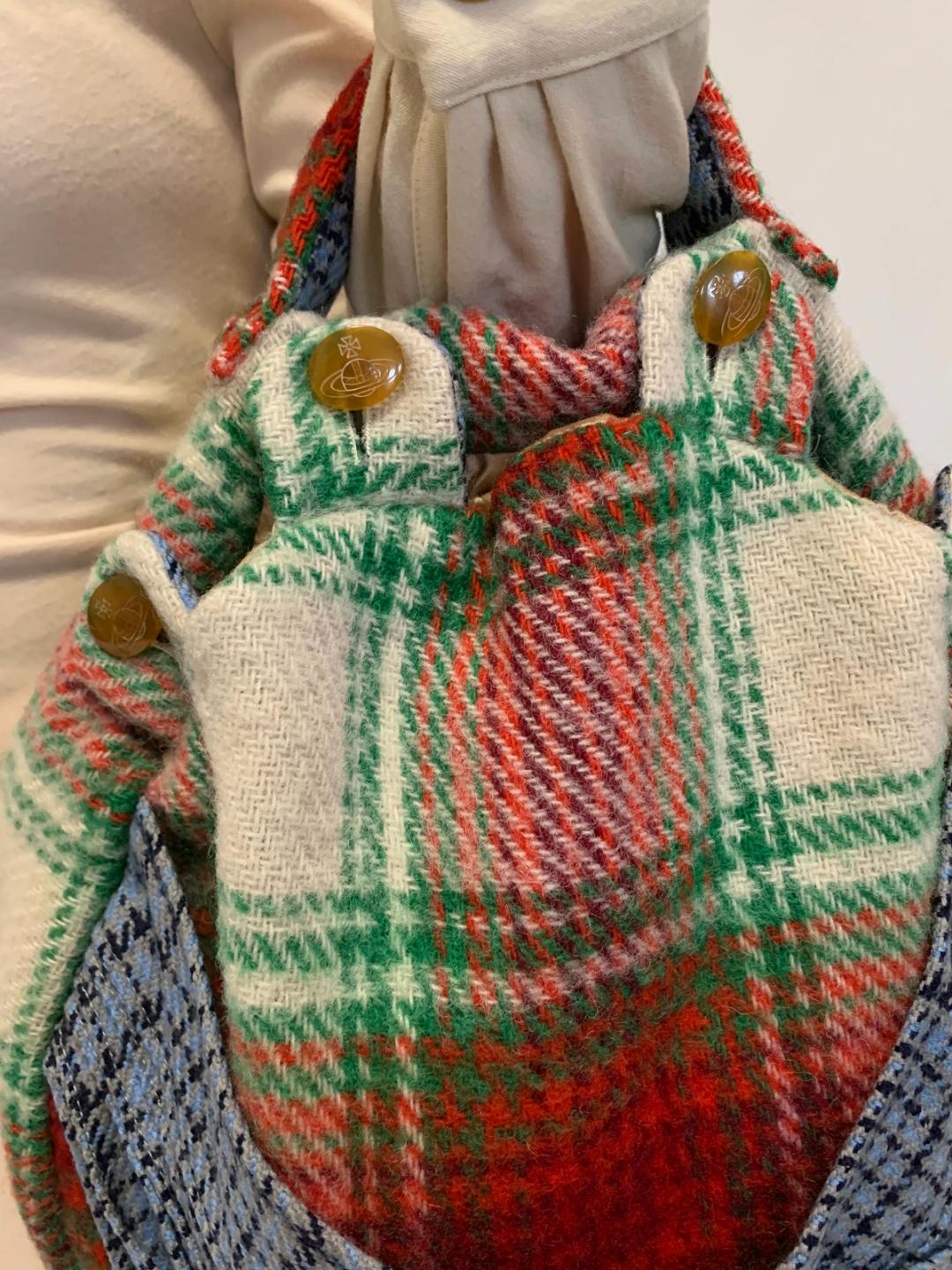 Incredible and rare Vivienne Westwood handbag from the iconic Time Machine/Pagan 1988-89 era, made of a gorgeous assortment of tartan fabrics, lined in flesh toned satin. It's a large circle with a secret inner compartment and orb button tab closures throughout, brilliant design. Westwood herself is pictured sporting the same design.