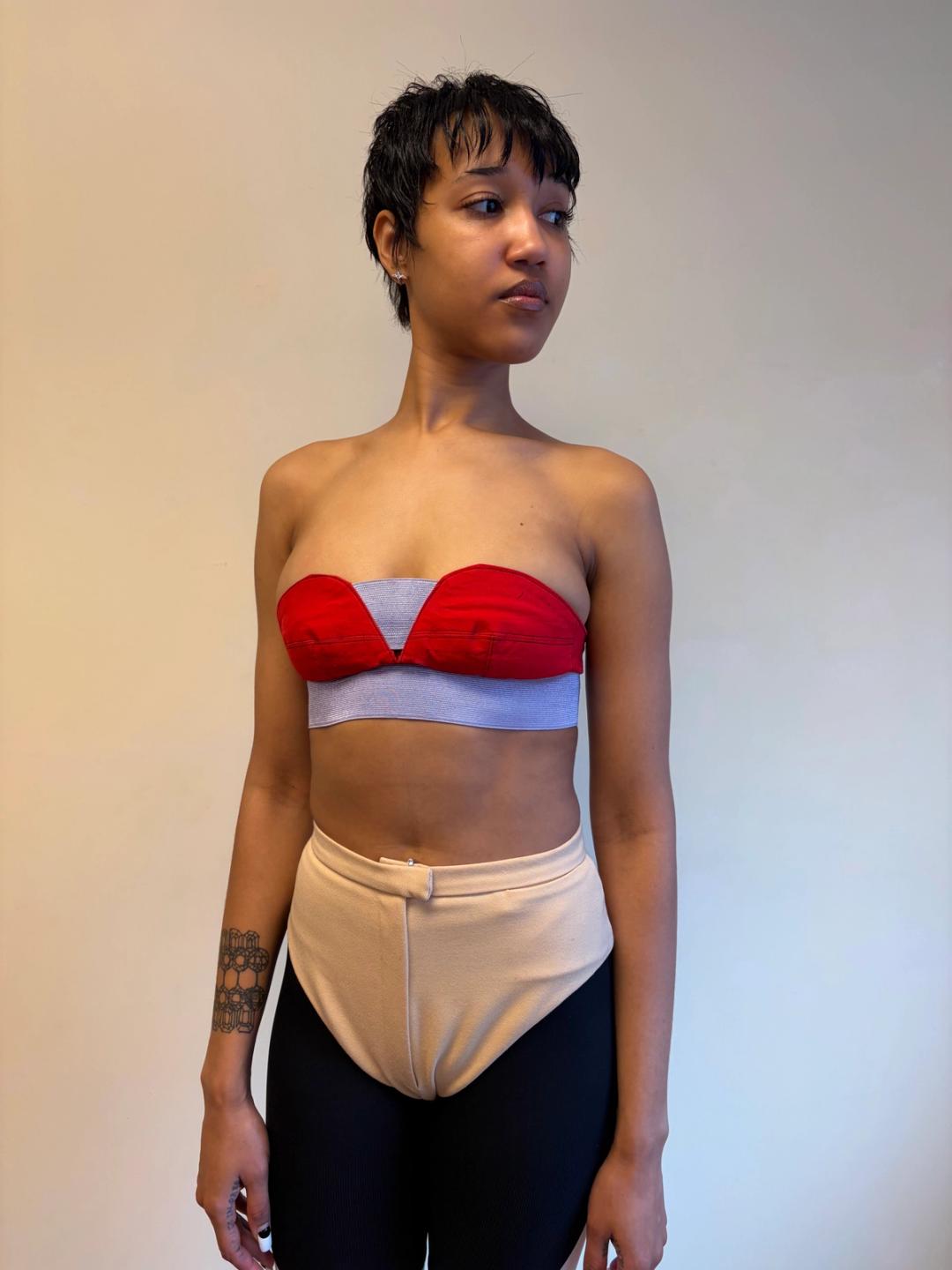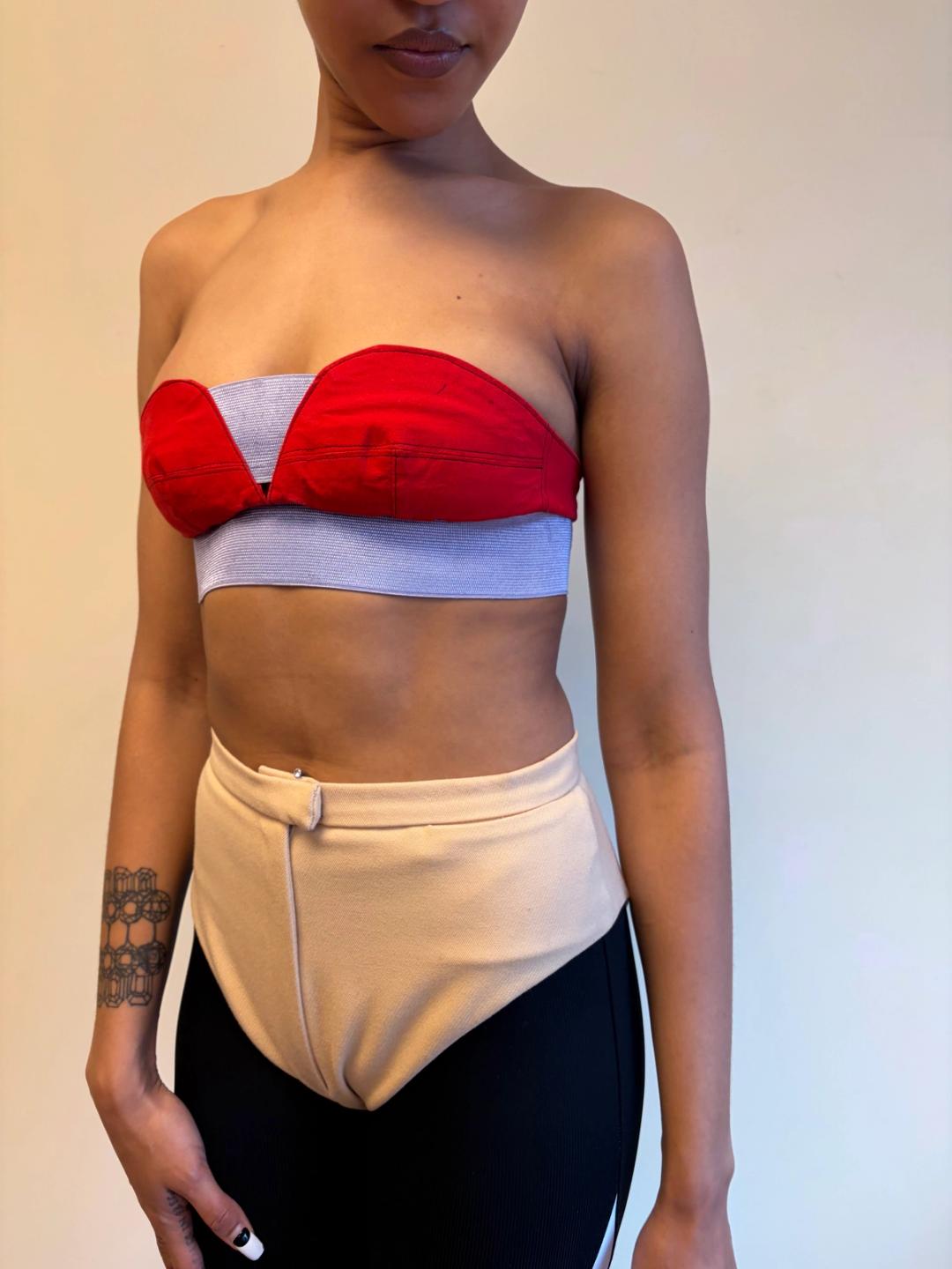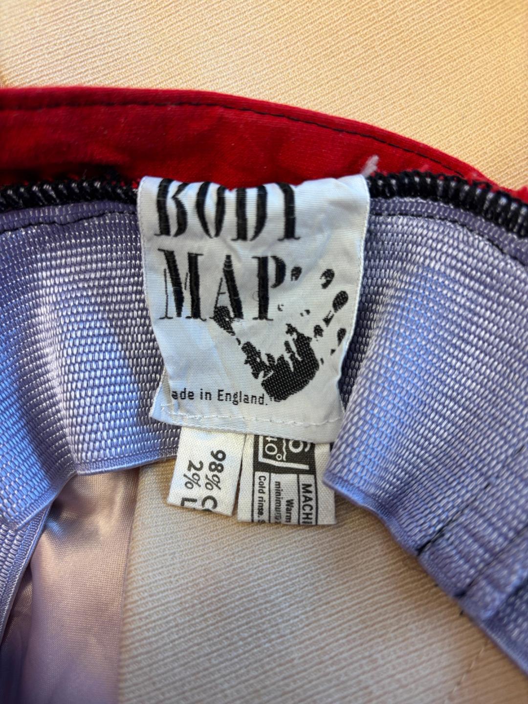 Ultra-rare cherry red bustier with lavender elastic detail giving a lovely fit. The top is by Bodymap from the 1985 collection "Barbee takes a trip around nature's cosmic curves". The top has a small mark on the top right corner, see photos.