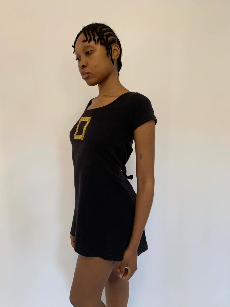 Vivienne Westwood black cotton dress with embroidered baroque orb picture frame. The dress comes from Westwood's "Civilizade" Spring/Summer 1989 collection. The dress has a tie at the back that creates a waist cinching silhouette. Of course it can be worn with the tie open as well.