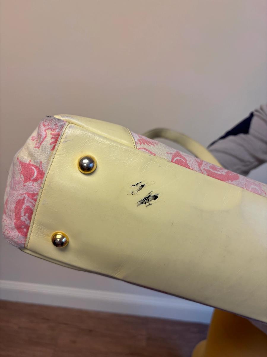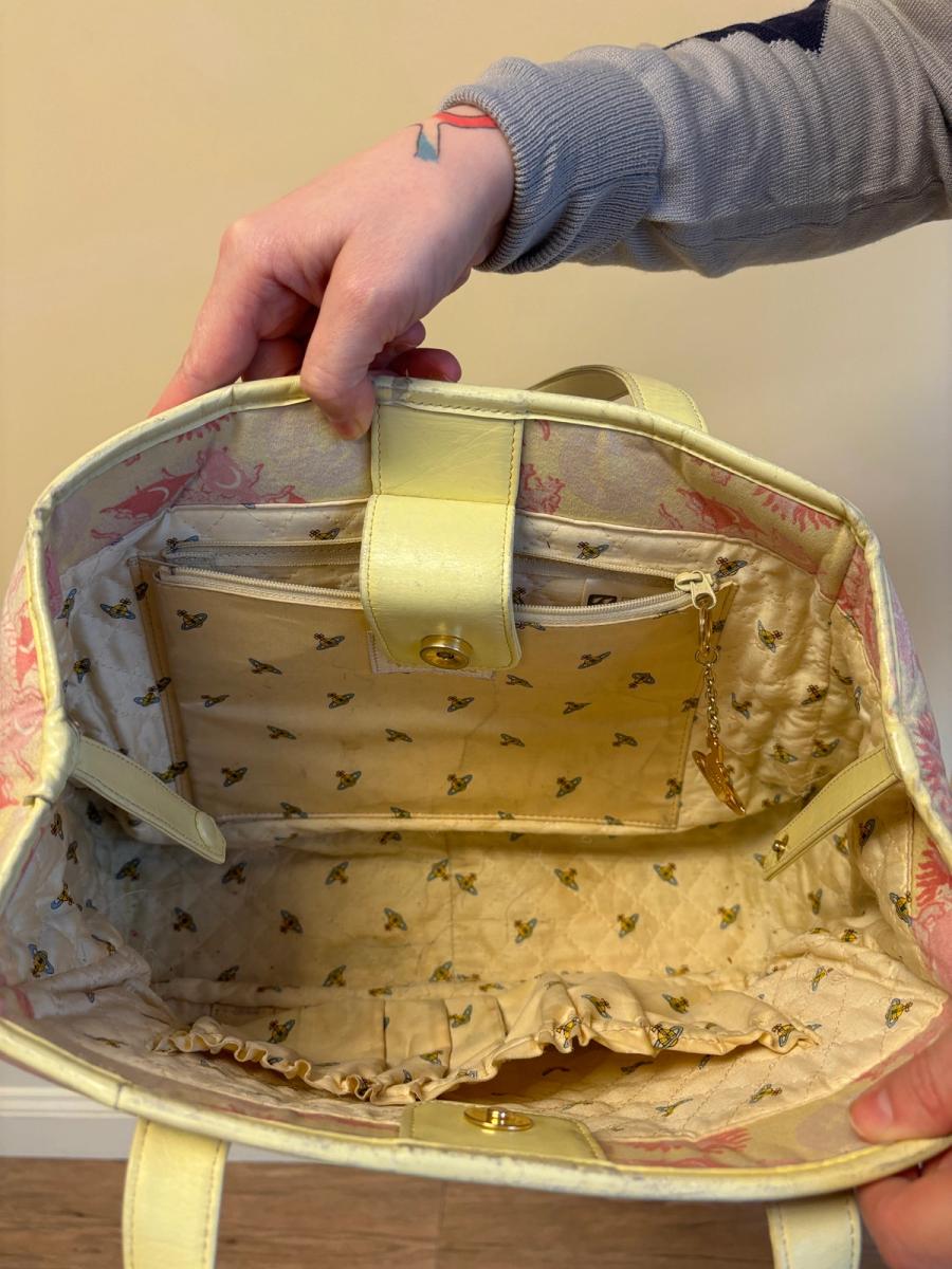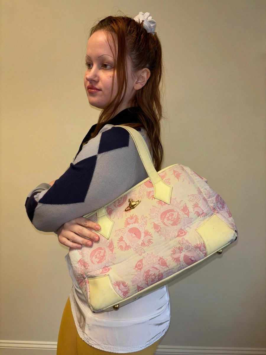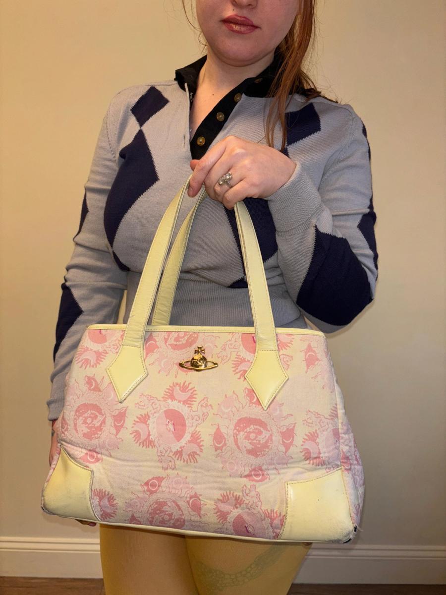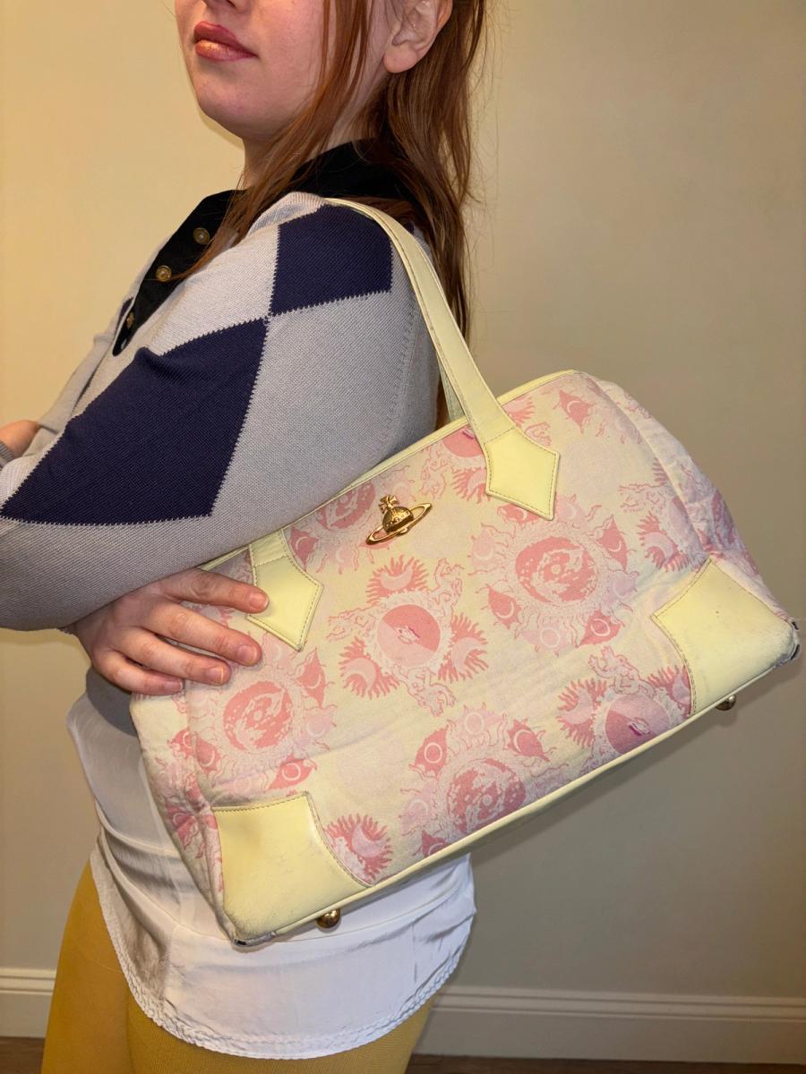 Rare 90s Vivienne Westwood purse in the iconic galaxy print in a light pink color. The print was first introduced in Westwood's Pagan SS 88 collection. The bag is quite large in size and has lovely brass orb on the front. It's made of a soft printed flannel and has the quintessential 90s quilted orb interior. There are signs of wear throughout -- priced accordingly!
