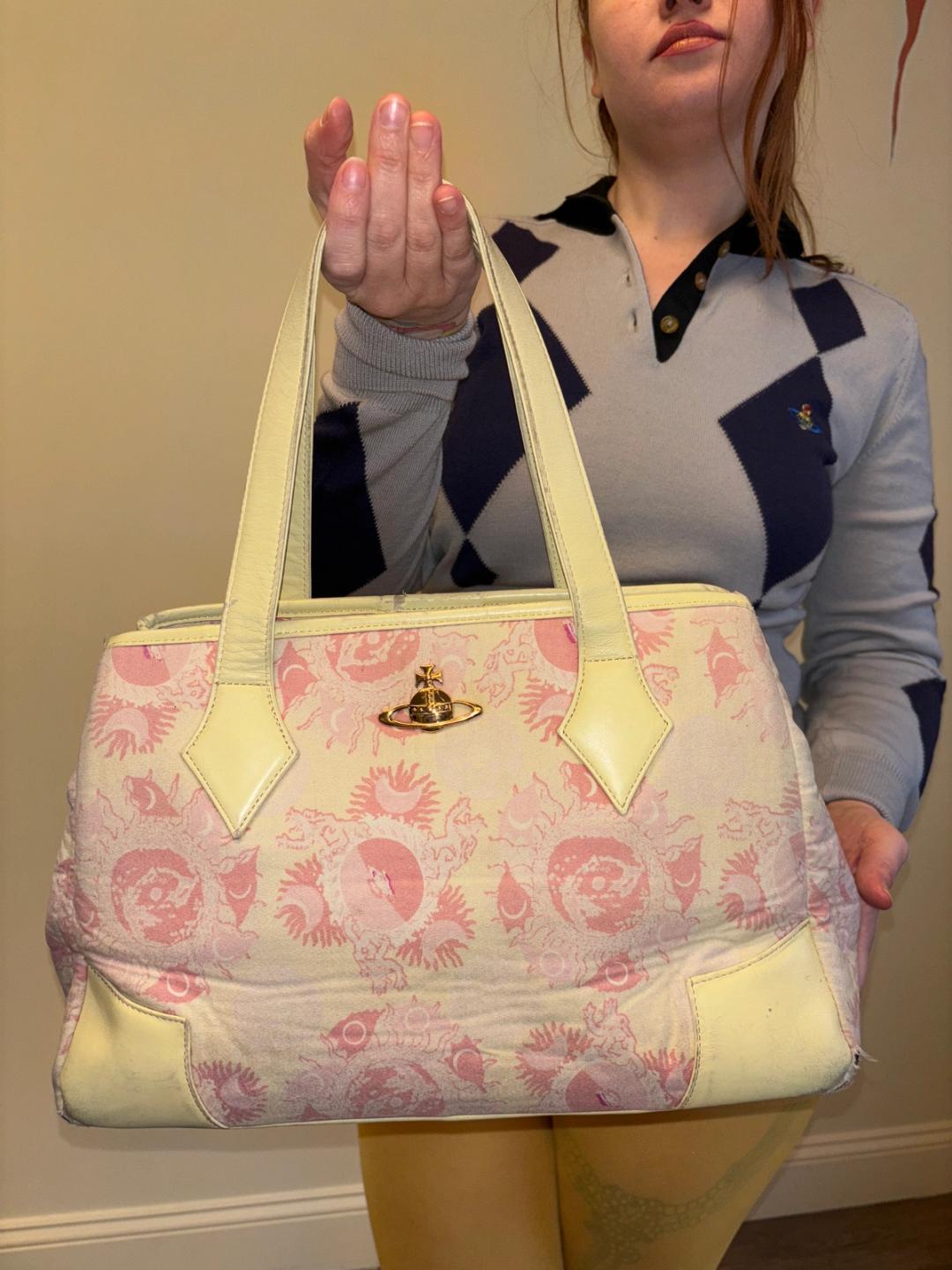 Rare 90s Vivienne Westwood purse in the iconic galaxy print in a light pink color. The print was first introduced in Westwood's Pagan SS 88 collection. The bag is quite large in size and has lovely brass orb on the front. It's made of a soft printed flannel and has the quintessential 90s quilted orb interior. There are signs of wear throughout -- priced accordingly!