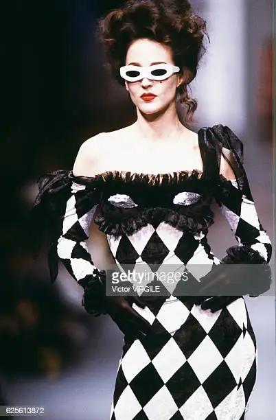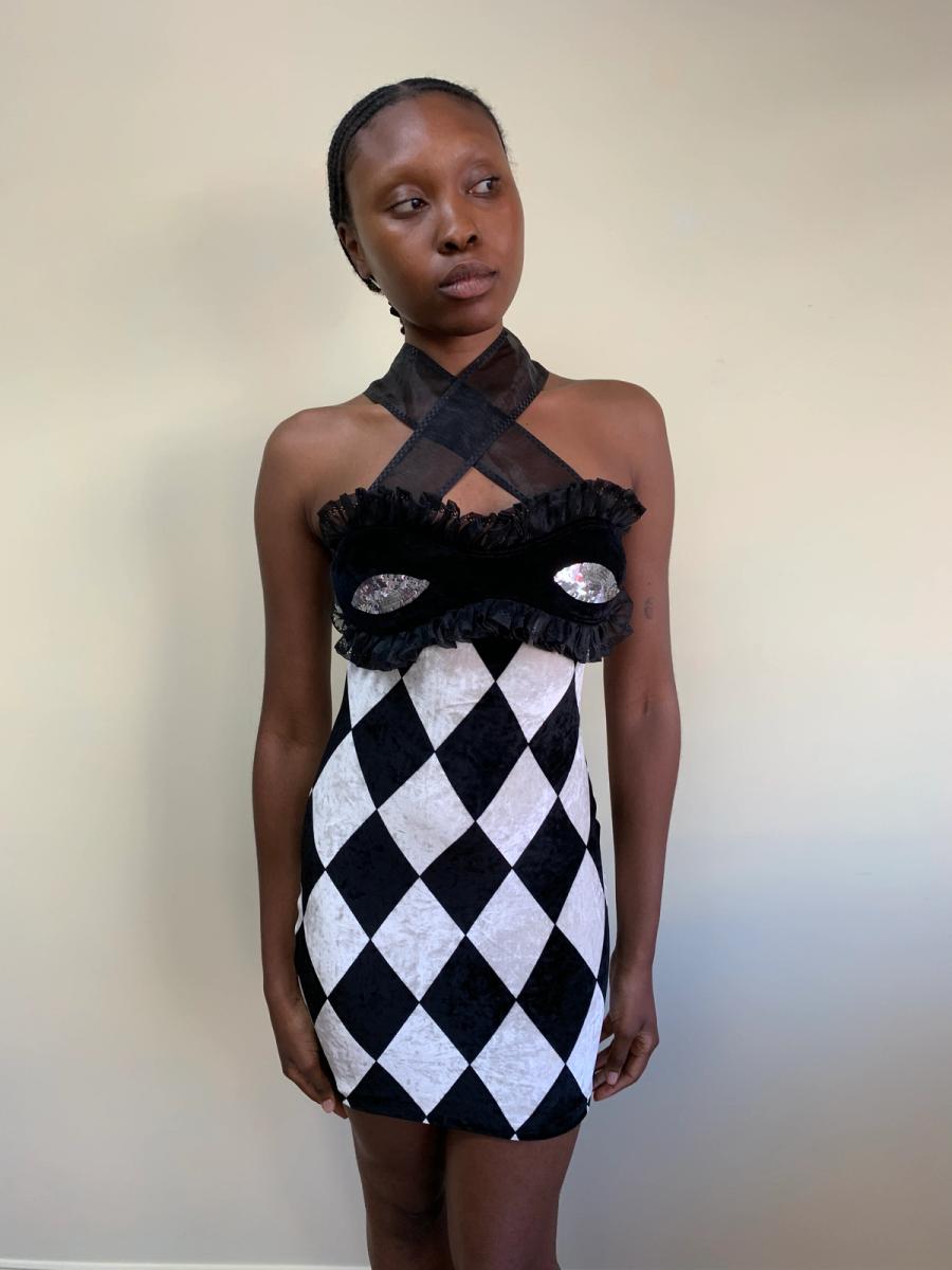 Stunning and rare dress by Chantal Thomass from her 1992-93 Automne-Hiver collection. It features a Bal Masqué motif across the décolletage with lovely ribbon which can be arranged different ways. The body of the dress is made from a stretch velvet with harlequin print throughout. Marked size 38. Made in France.