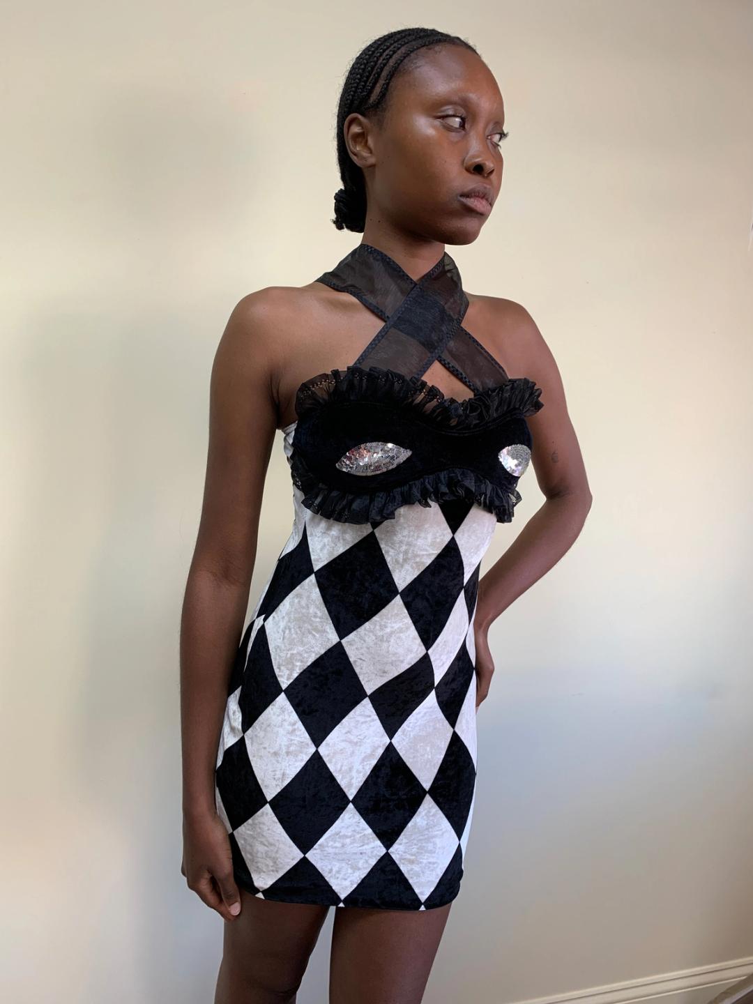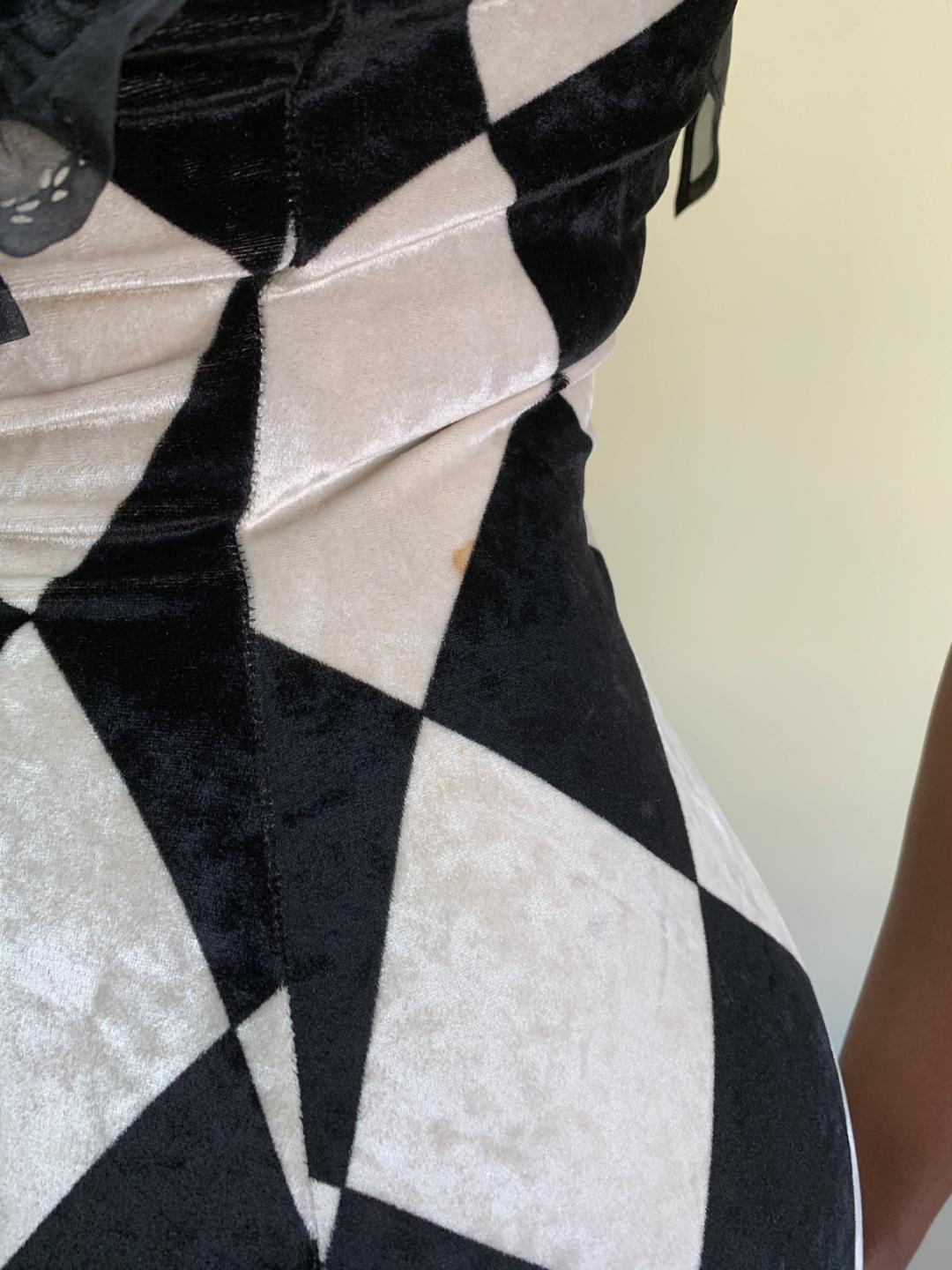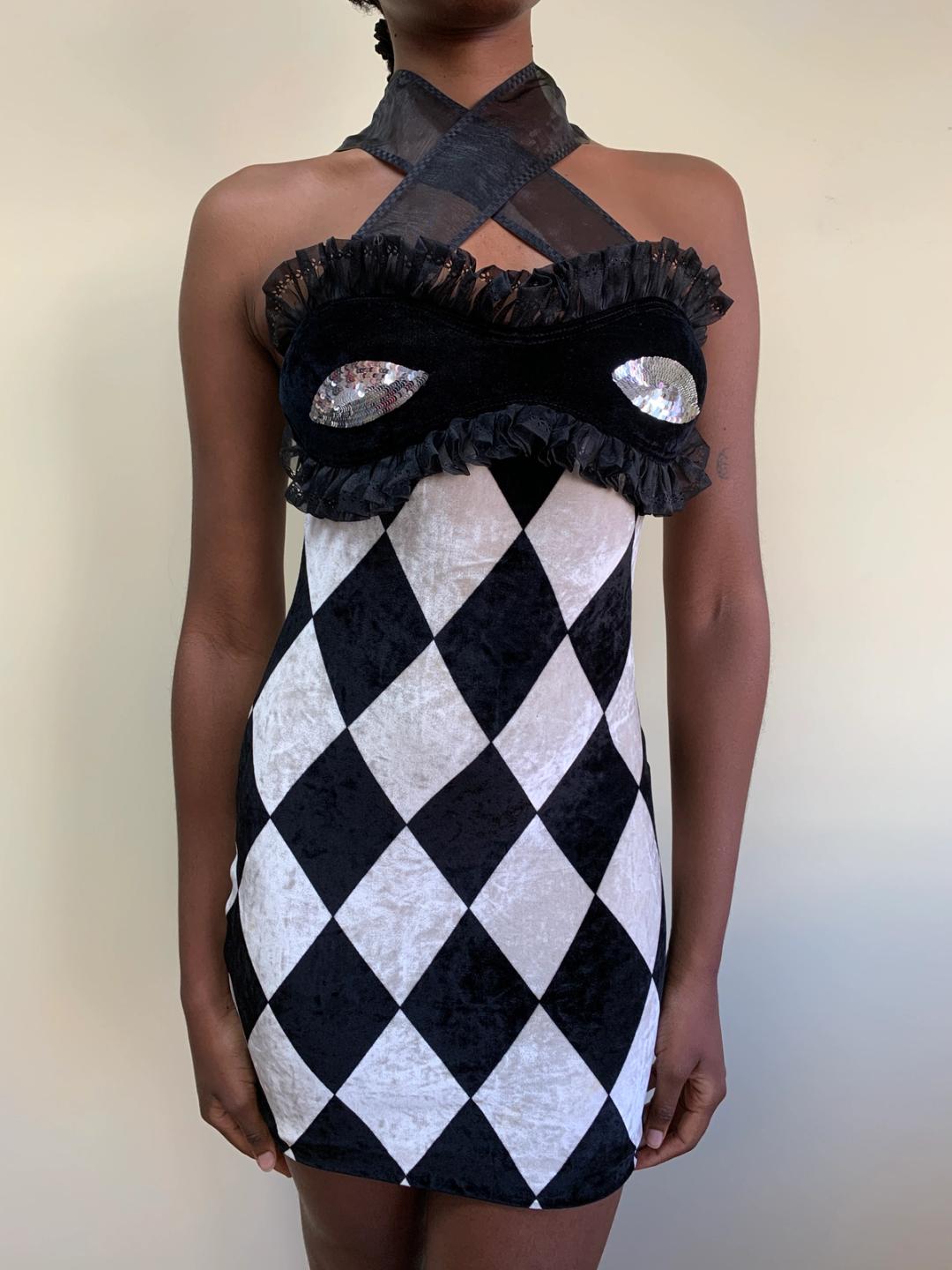Stunning and rare dress by Chantal Thomass from her 1992-93 Automne-Hiver collection. It features a Bal Masqué motif across the décolletage with lovely ribbon which can be arranged different ways. The body of the dress is made from a stretch velvet with harlequin print throughout. Marked size 38. Made in France.