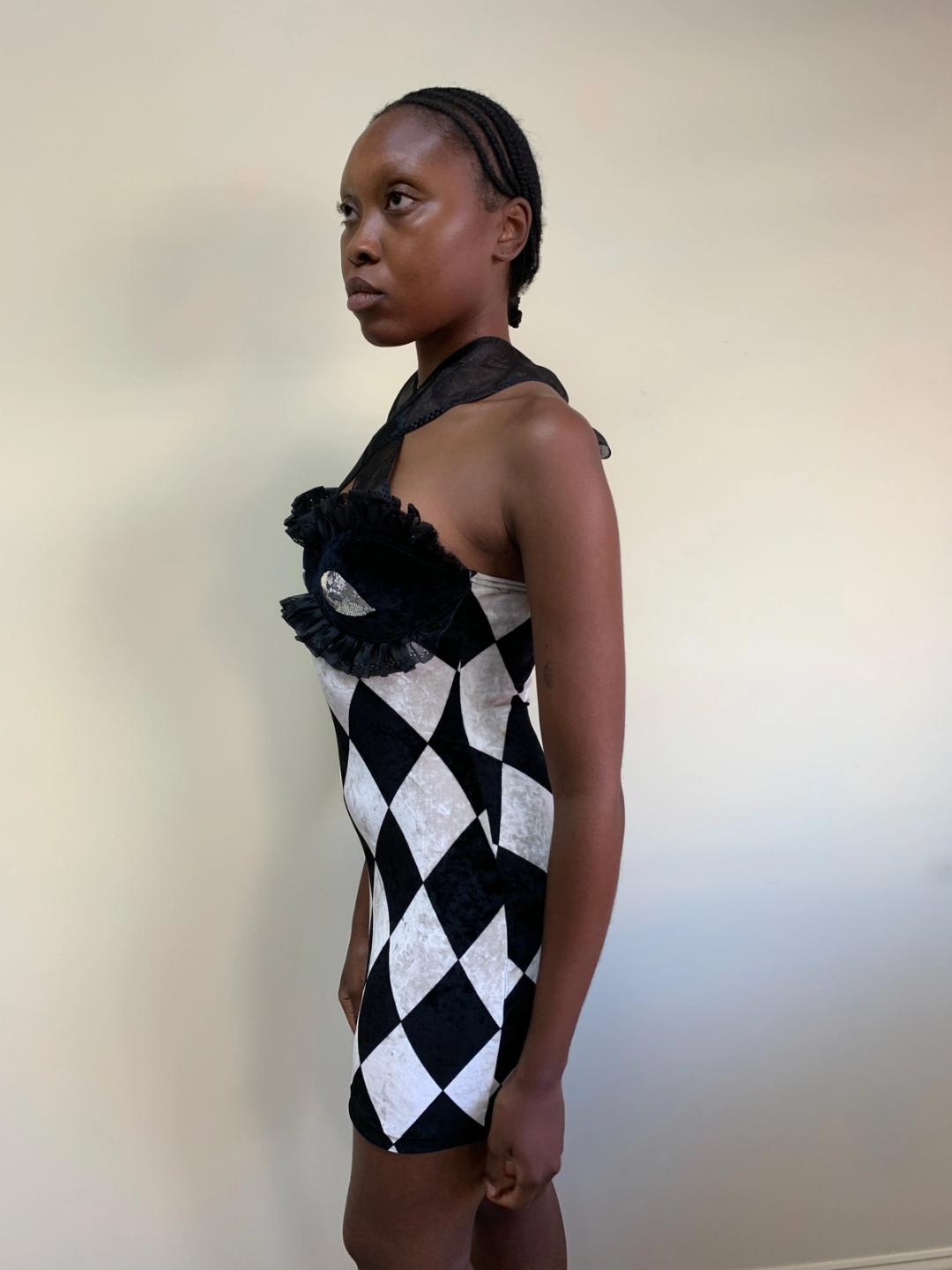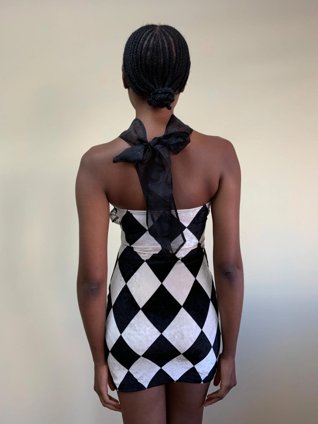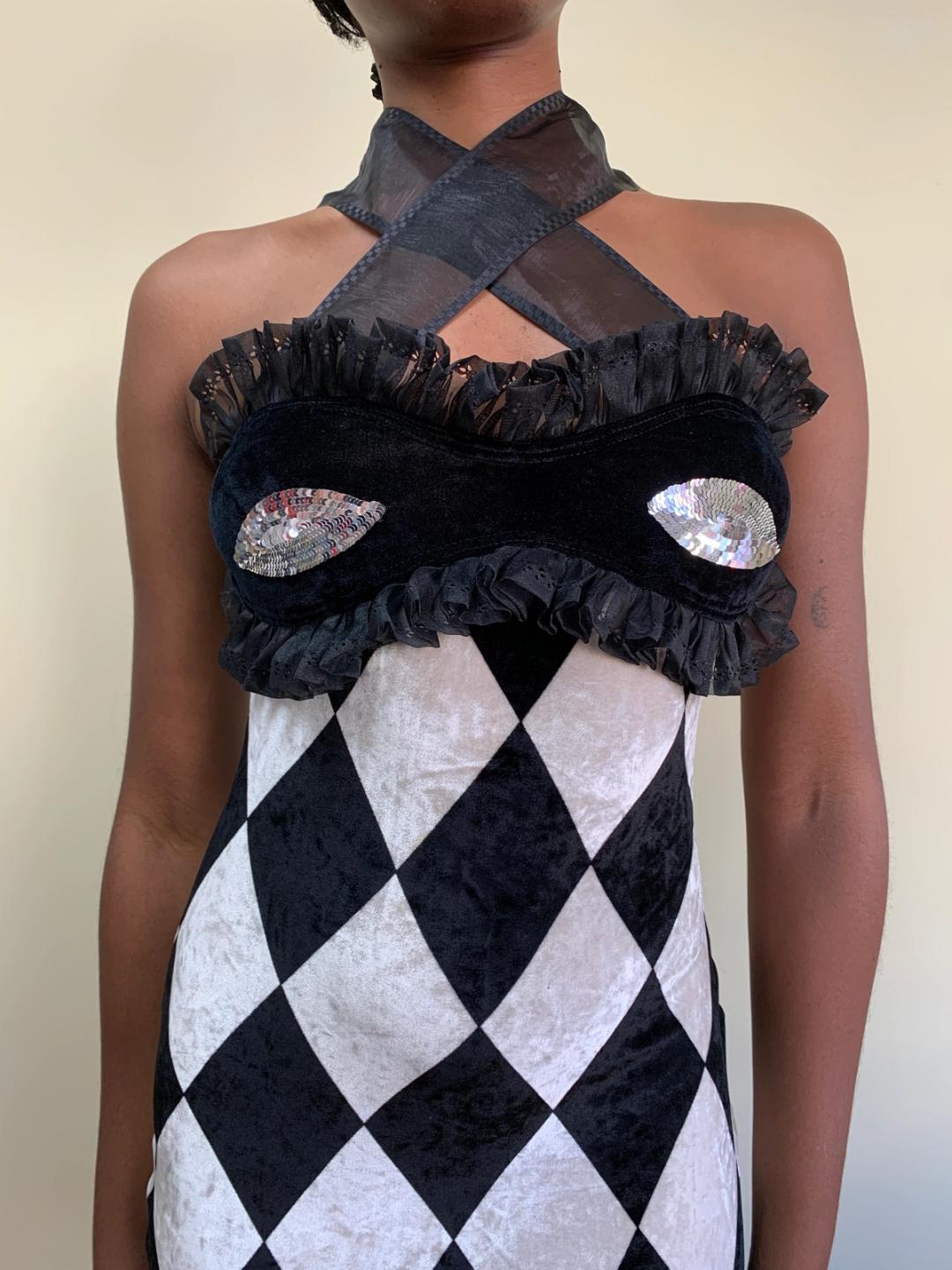 Stunning and rare dress by Chantal Thomass from her 1992-93 Automne-Hiver collection. It features a Bal Masqué motif across the décolletage with lovely ribbon which can be arranged different ways. The body of the dress is made from a stretch velvet with harlequin print throughout. Marked size 38. Made in France.