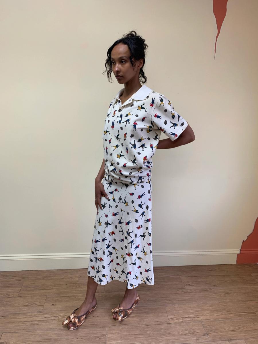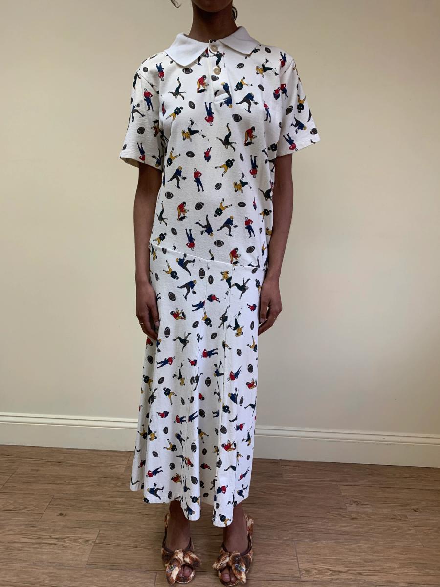 United Bamboo athletic print dress from the label's first collection, sold at Opening Ceremony. This is a very rare item to see, from the artist K8 Hardy's closet. United Bamboo is by Miho Aoki and Thuy Pham, one of the members of Bernadette Corporation. The dress is drop-waisted with a cantilevered cut and polo neckline. There are some scattered marks and pinholes on the skirt (see photos). Priced accordingly. Made from a stretchy knit cotton, fits a S-M.