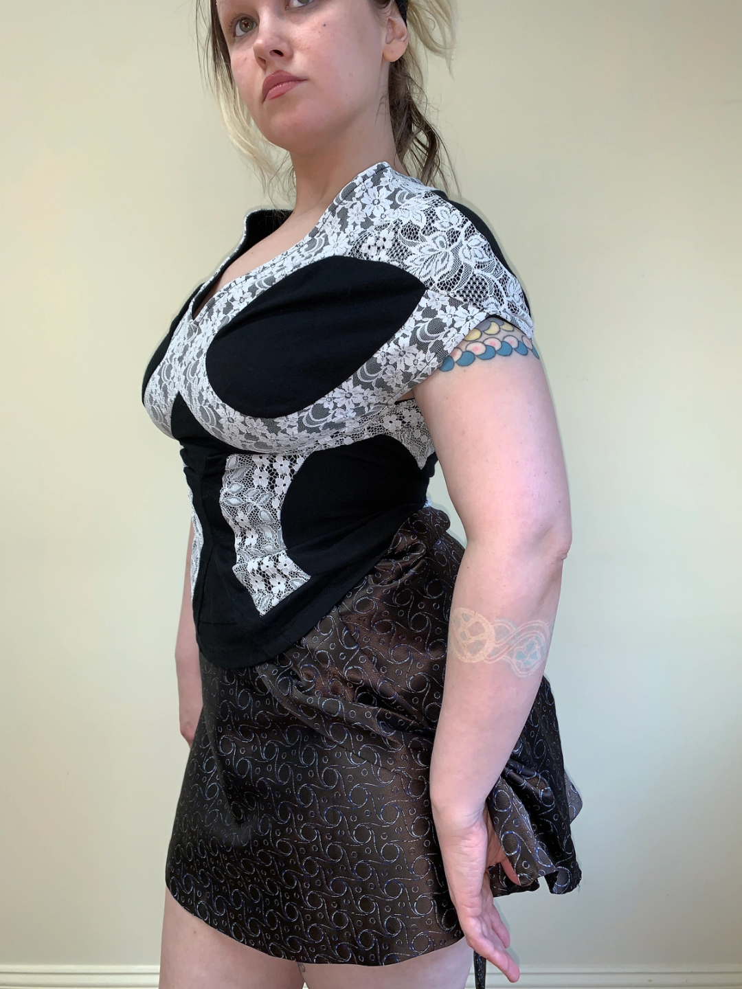 Gorgeous Junya Watanabe lace patchwork top from fall/winter 2006. The patchwork patterning creates a super flattering fitted bodice style. It has some stretch.