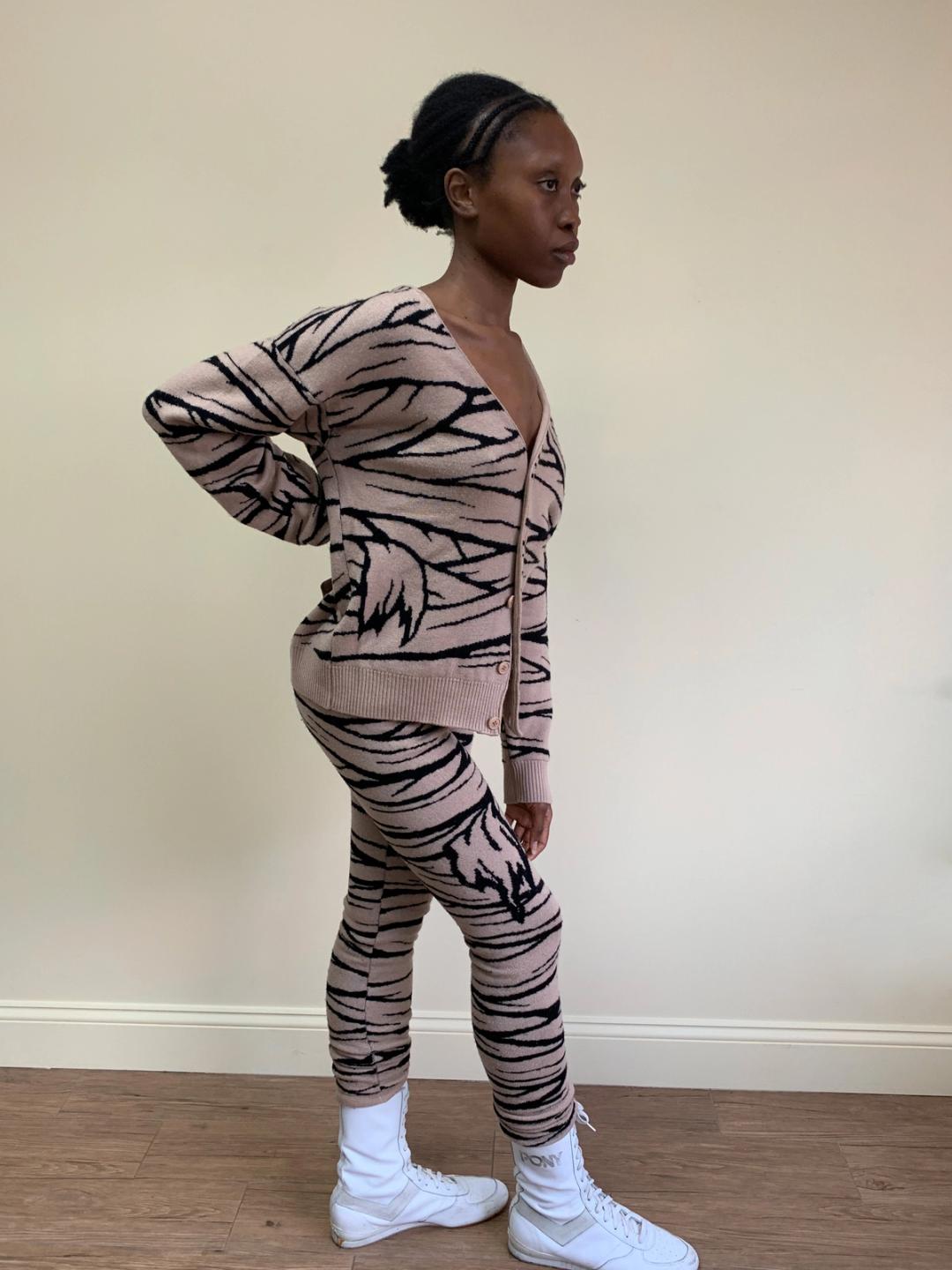 Knit mummy bandage print set from Jeremy Scott's fall 2013 collection runway. The set is composed of a knit cardigan and leggings. There are buttons down the front of the cardigan and an elastic waistband on the leggings. They are quite stretchy and can fit a variety of sizes.