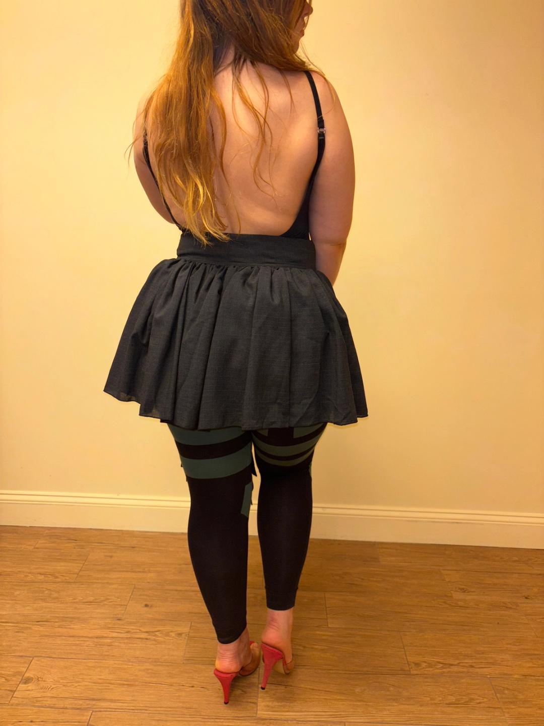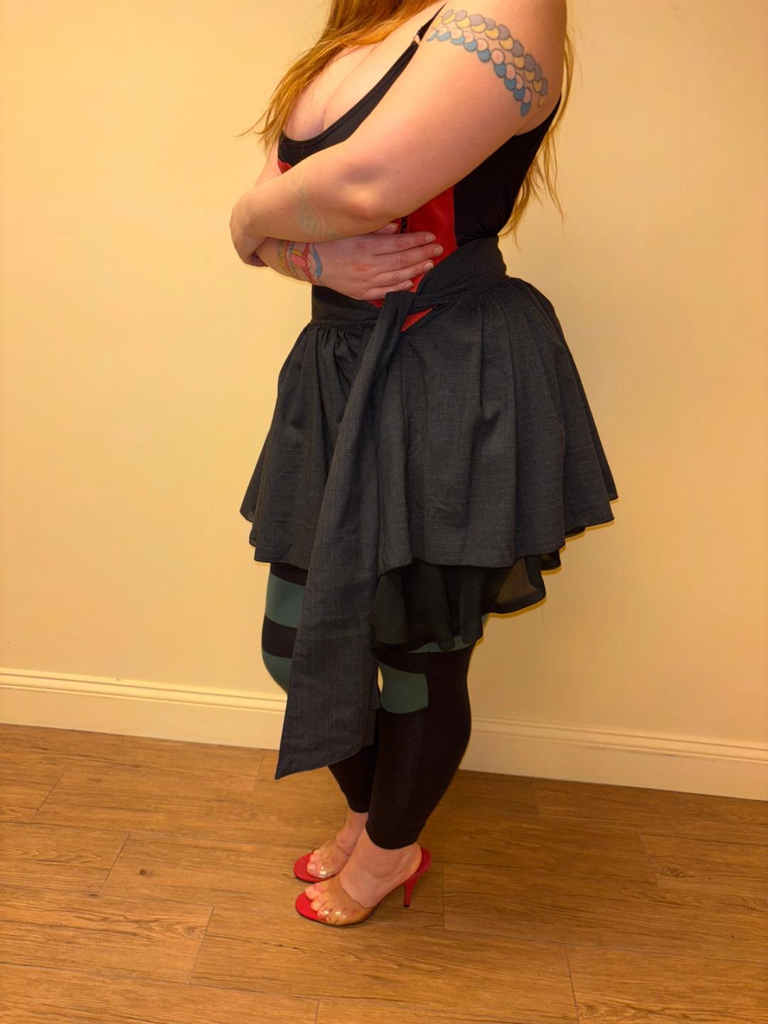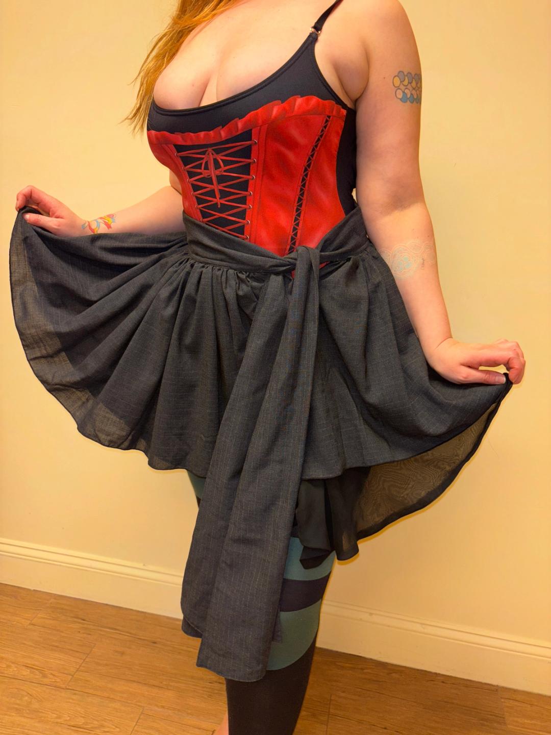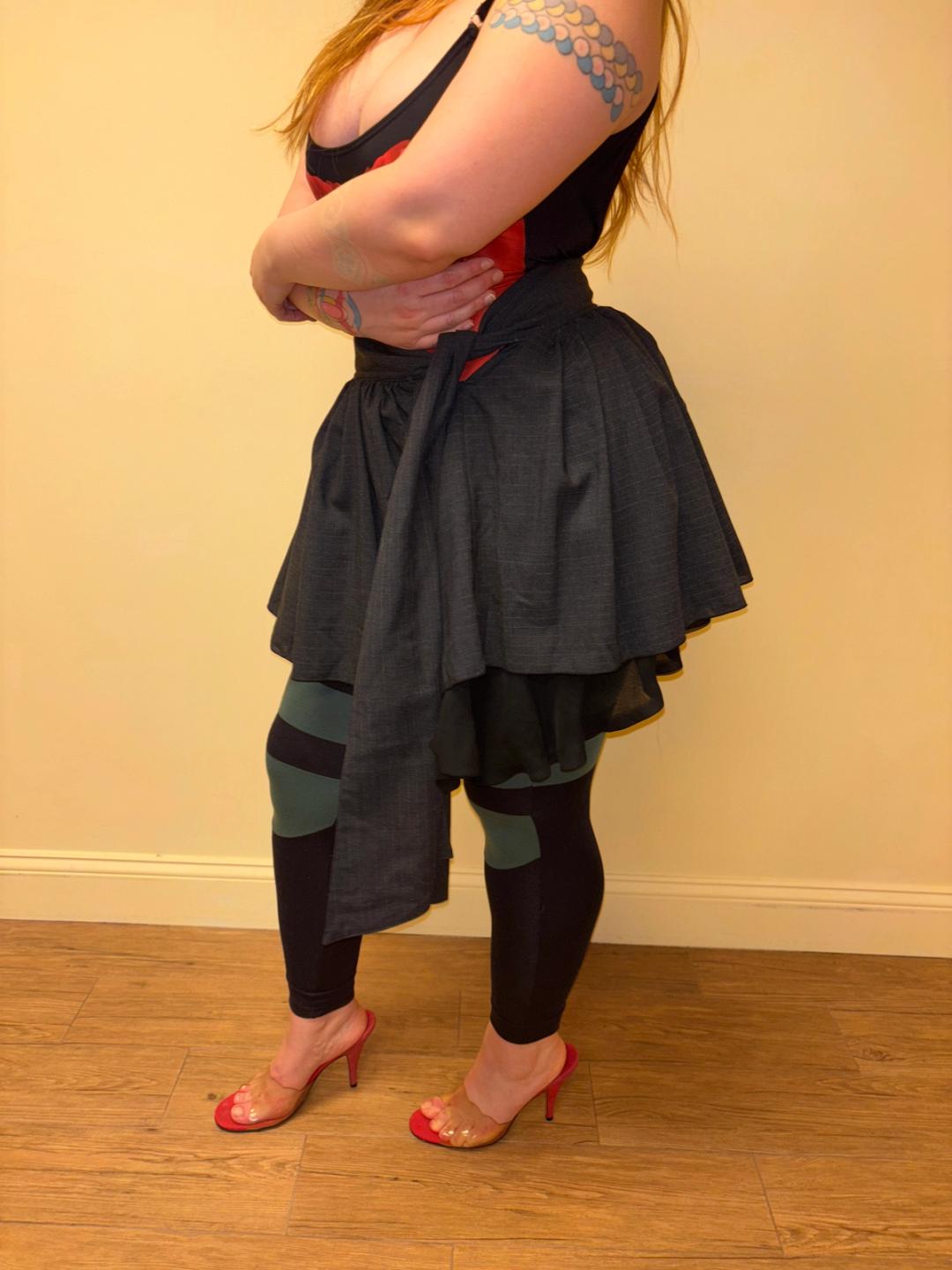Early 20471120 gathered pinstripe miniskirt with sash tie waist and draped irregular black petticoat that peeks out one side. In excellent vintage condition.