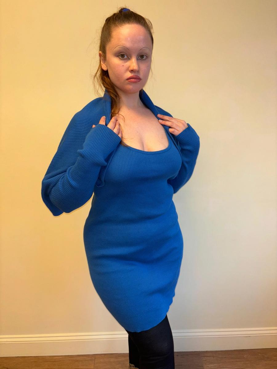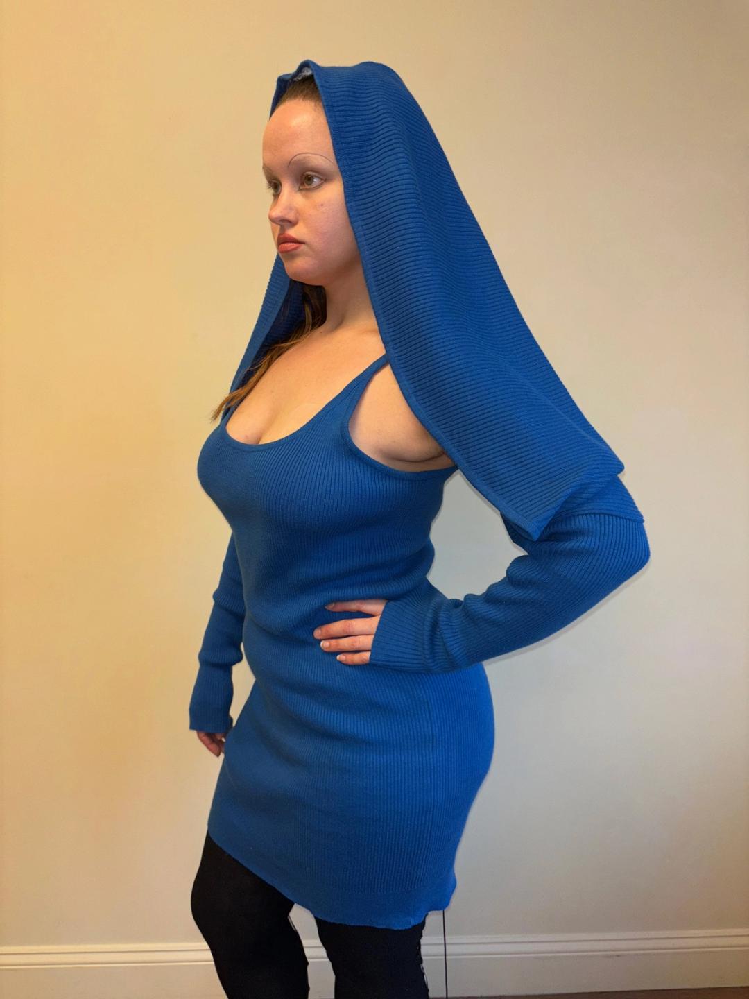 80s Angelo Tarlazzi blue ribbed cotton set that includes a dress and separate shrug. The shrug can be worn off the shoulders, as a hood, or twisted like a halter. A very versatile set! Quite stretchy and fitted style.