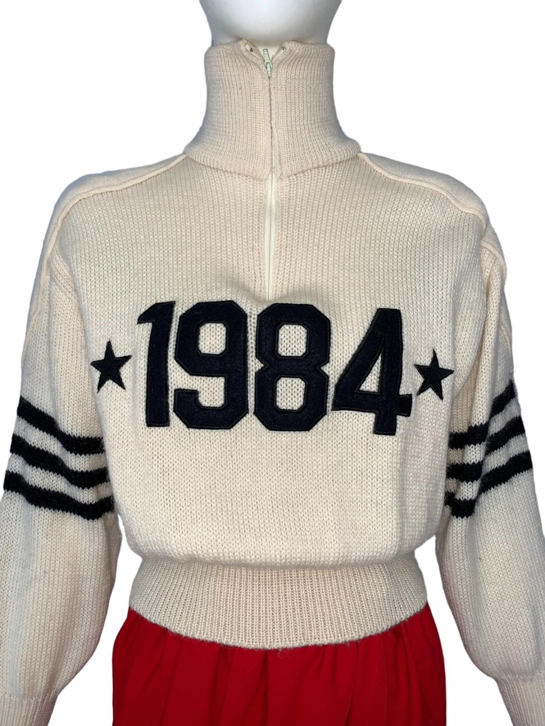 Vintage and rare 1980s sweater by Atsuki Onishi. The sweater has "1984" on the front amongst stars. It has a cinched ribbed waist and zips up the front. Fairly open size.