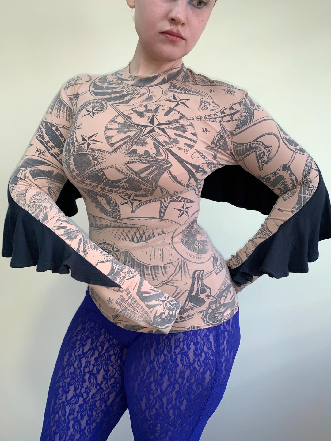 Rare and stunning top from the 1980s by British label, BodyMap. The top has an abstract aquatic print and a unique cape-like design. The body of the top is quite stretchy and size flexible. In excellent vintage condition. Made in the UK. Materials: 80% Nylon, 20% Lycra.