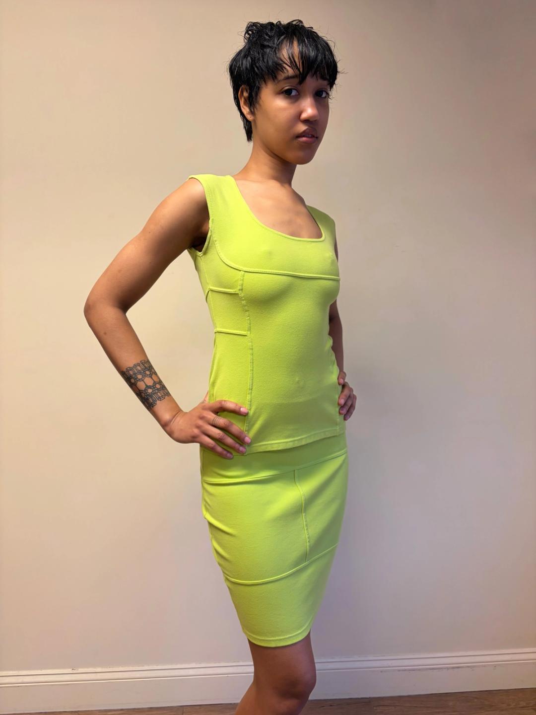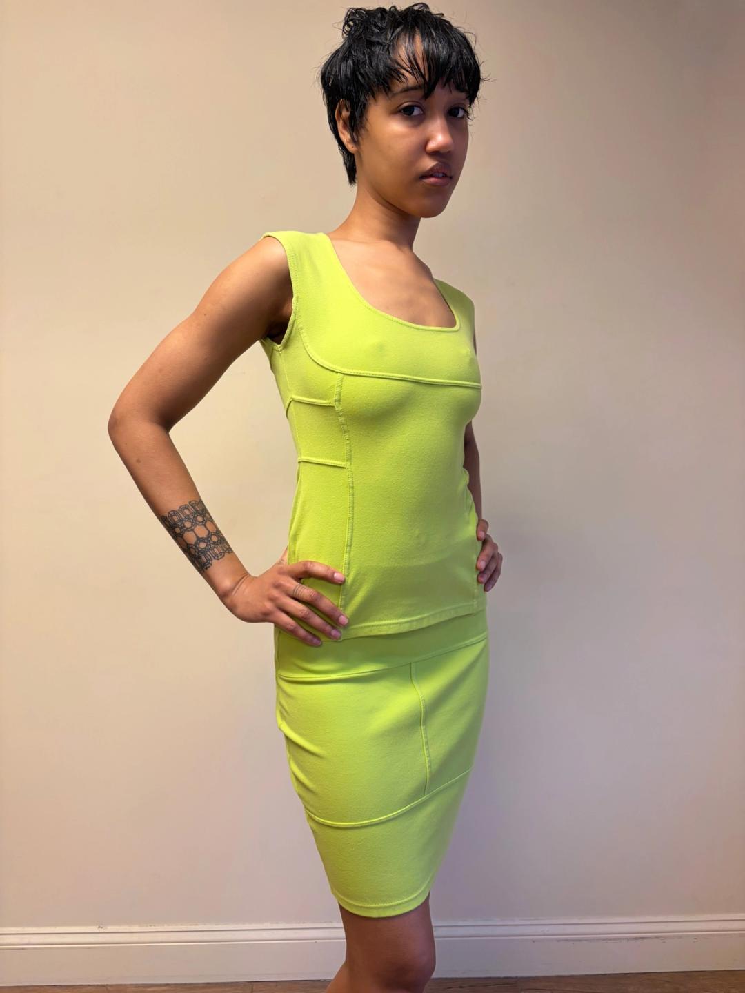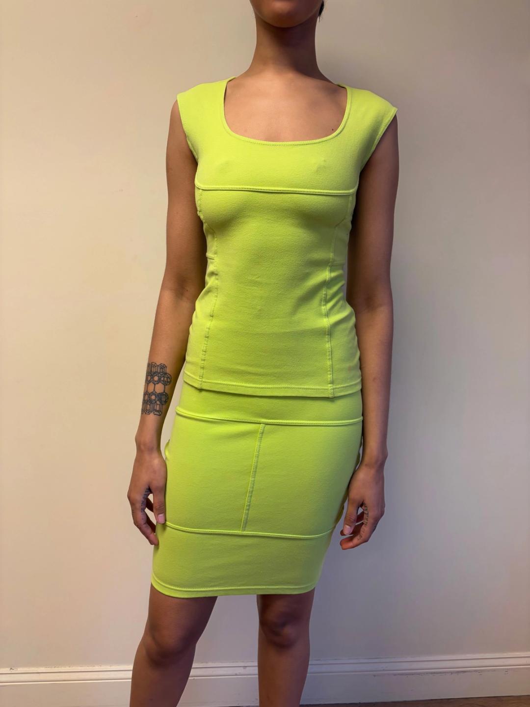 80s Claude Montana lime green seamed set. The set includes a top and skirt. Stretchy bodycon fit. Two discoloration marks on the set (see last images) priced accordingly.