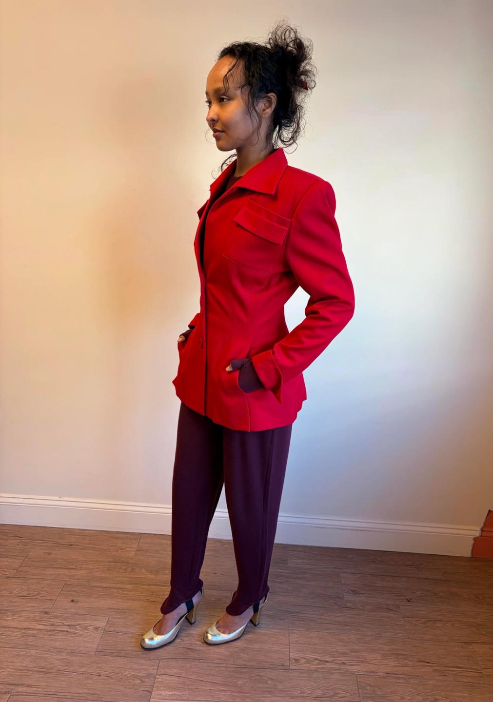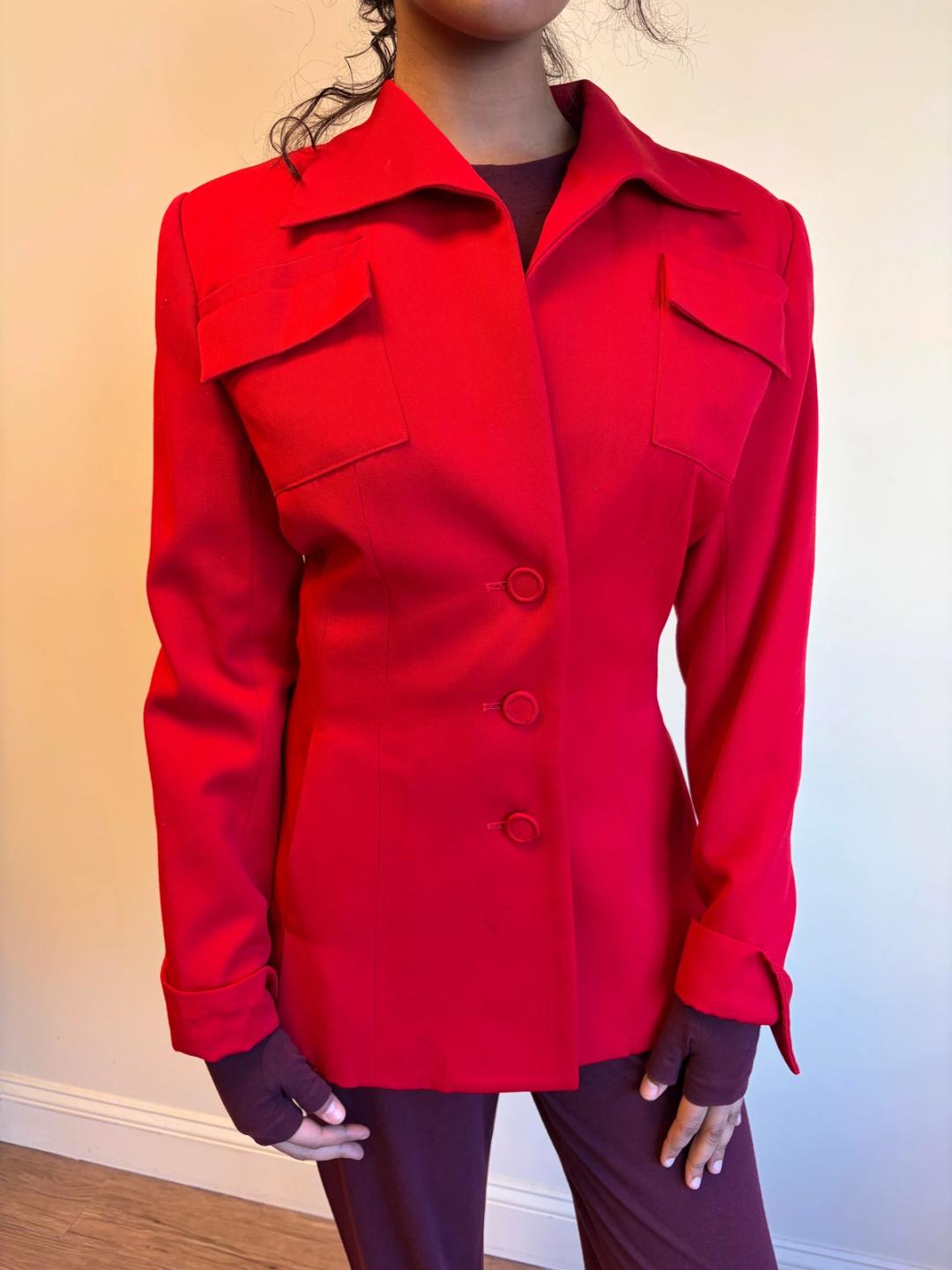 Cherry red wool jacket by Norma Kamali from the 1980s. Riffing on historical clothing as Kamali often did, this jacket blends the exaggerated 80s silhouette with 40s tailoring and finishing. With its ultra-structured shoulders this jacket cuts a confident and daring silhouette. In great vintage condition, with a very small stain (pictured) and a bit of damage to one of the buttons (see photo).