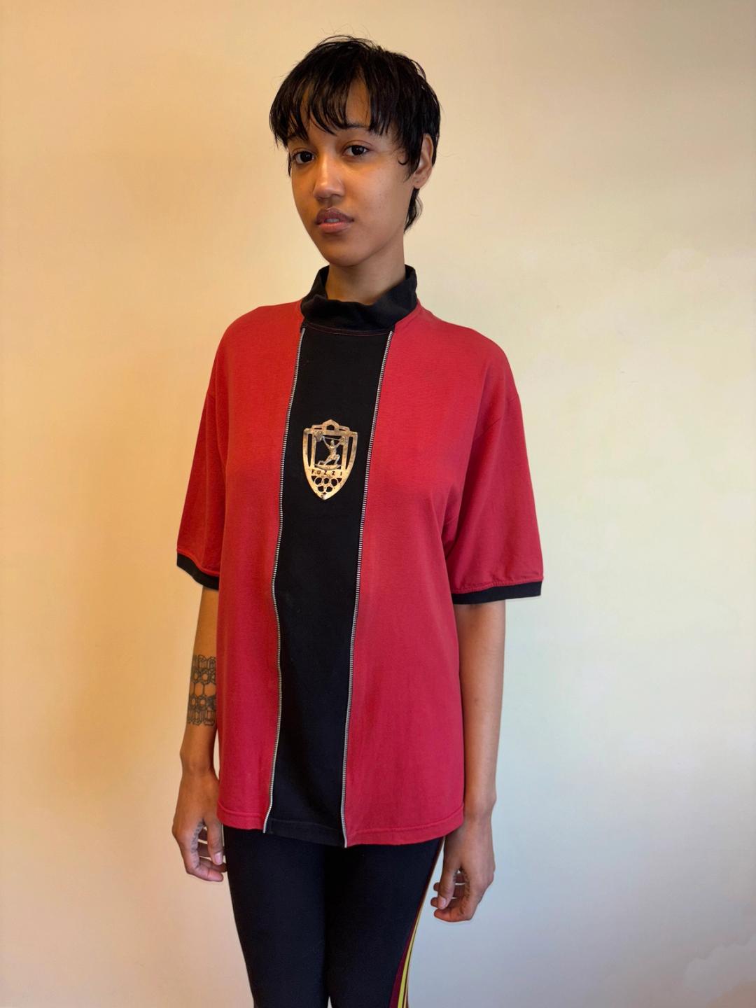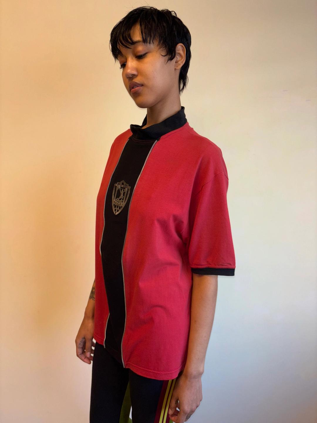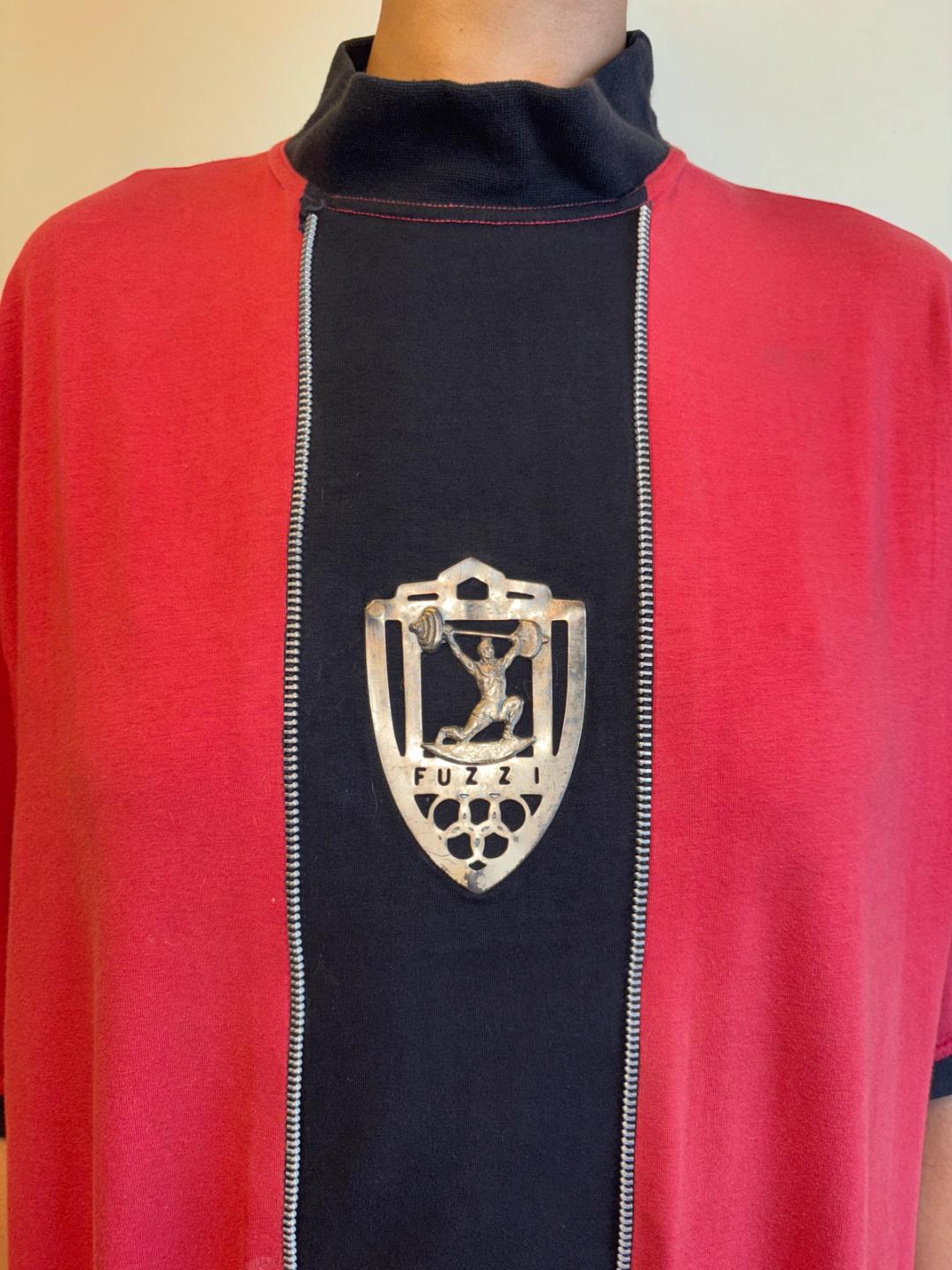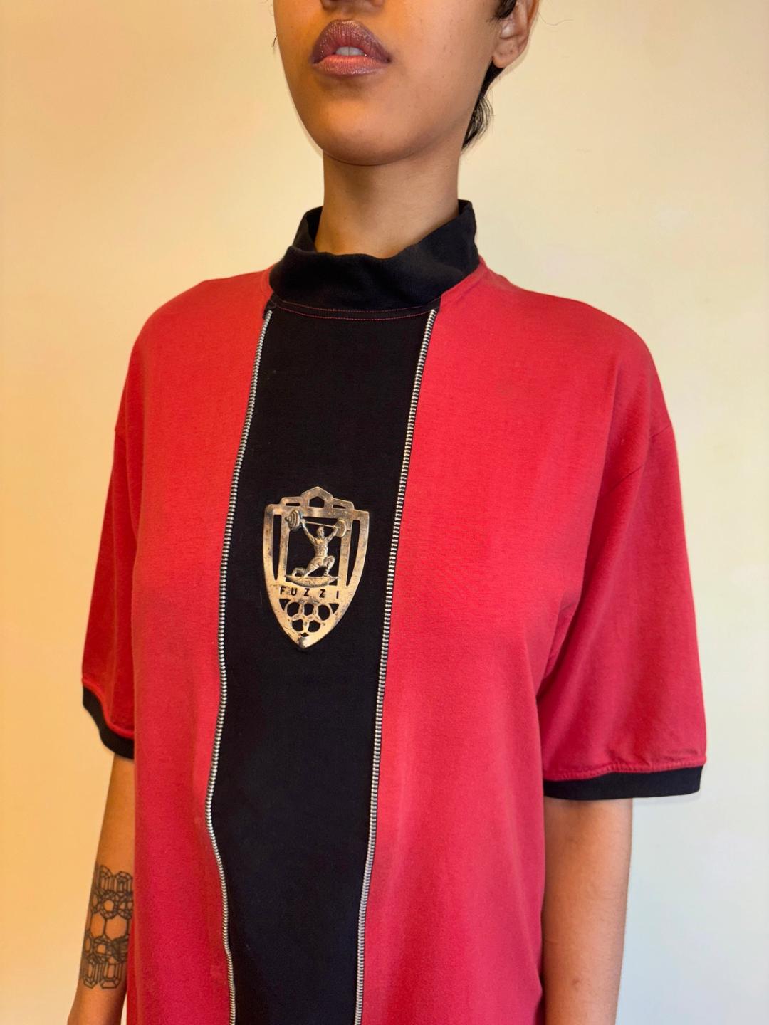 Extremely rare Gaultier top from 1986-87 produced by Fuzzi, famed manufacturers of Gaultier's later signature mesh tops. The tee has decorative zipper teeth down the front, framing a metal plaque depicting weightlifting. In excellent vintage condition with a small area of discoloration, not obvious when worn (see last photo).