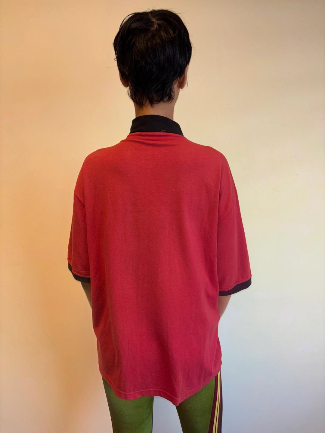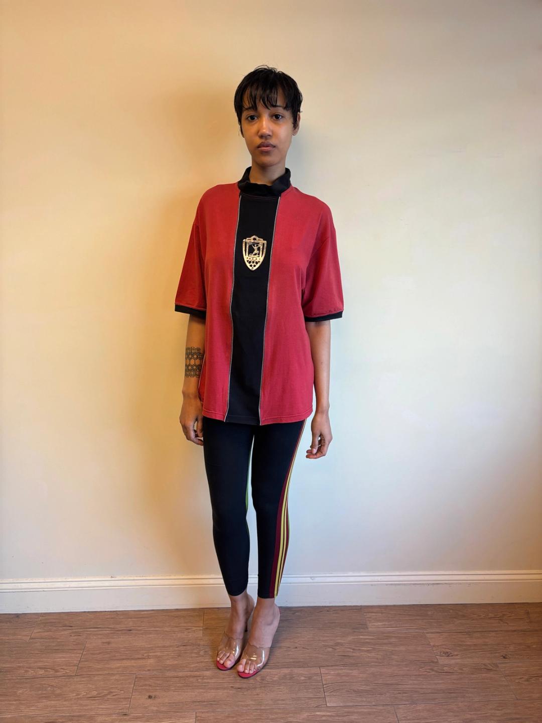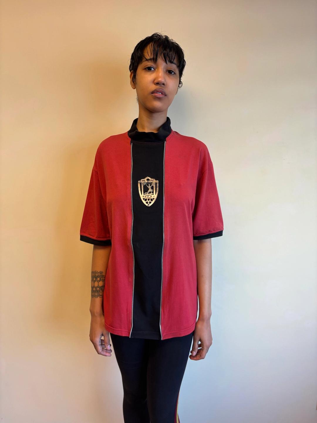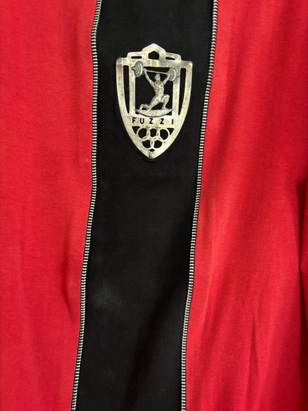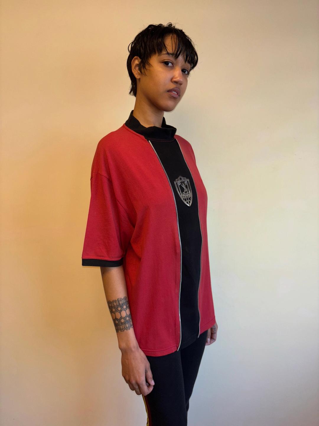Extremely rare Gaultier top from 1986-87 produced by Fuzzi, famed manufacturers of Gaultier's later signature mesh tops. The tee has decorative zipper teeth down the front, framing a metal plaque depicting weightlifting. In excellent vintage condition with a small area of discoloration, not obvious when worn (see last photo).