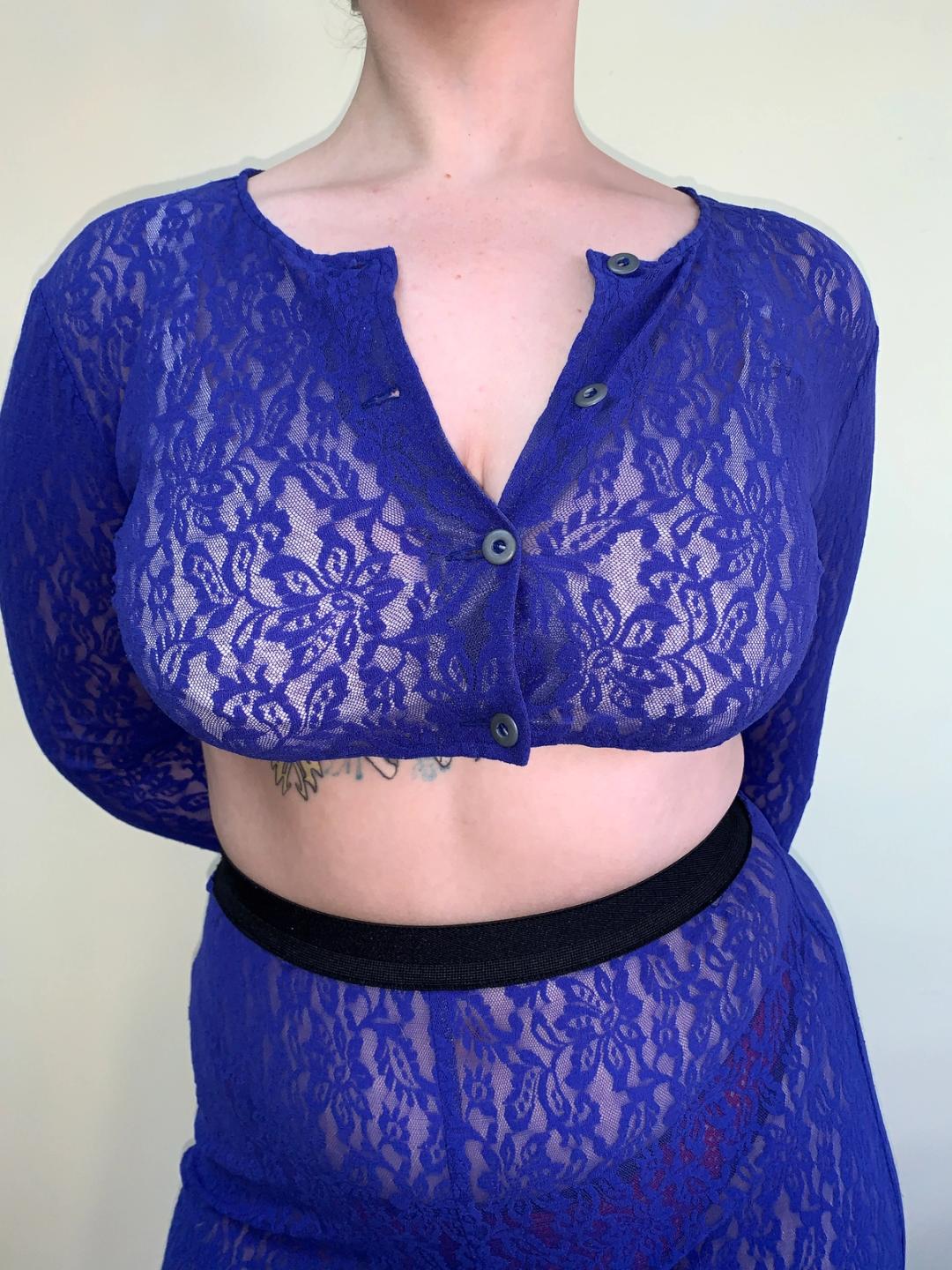 Two piece stretch lace set in a beautiful vivid cobalt blue from the 1980s Gaultier Public line. The set consists of a cropped cardigan and ultra high- waisted leggings. The cardigan closes with small metal buttons. A very wearable set with endless styling possibilities. In excellent vintage condition -- there is a small repair on the behind. Very stretchy and size flexible.