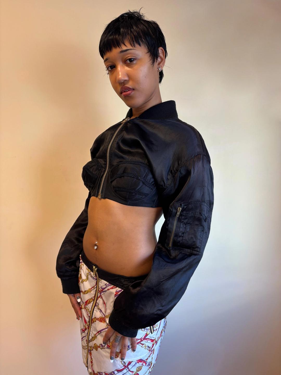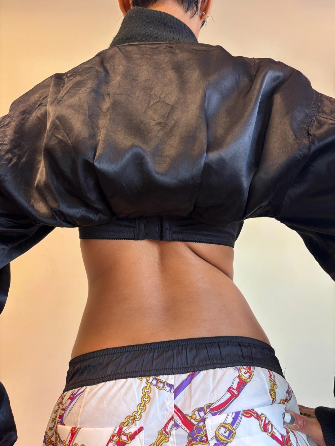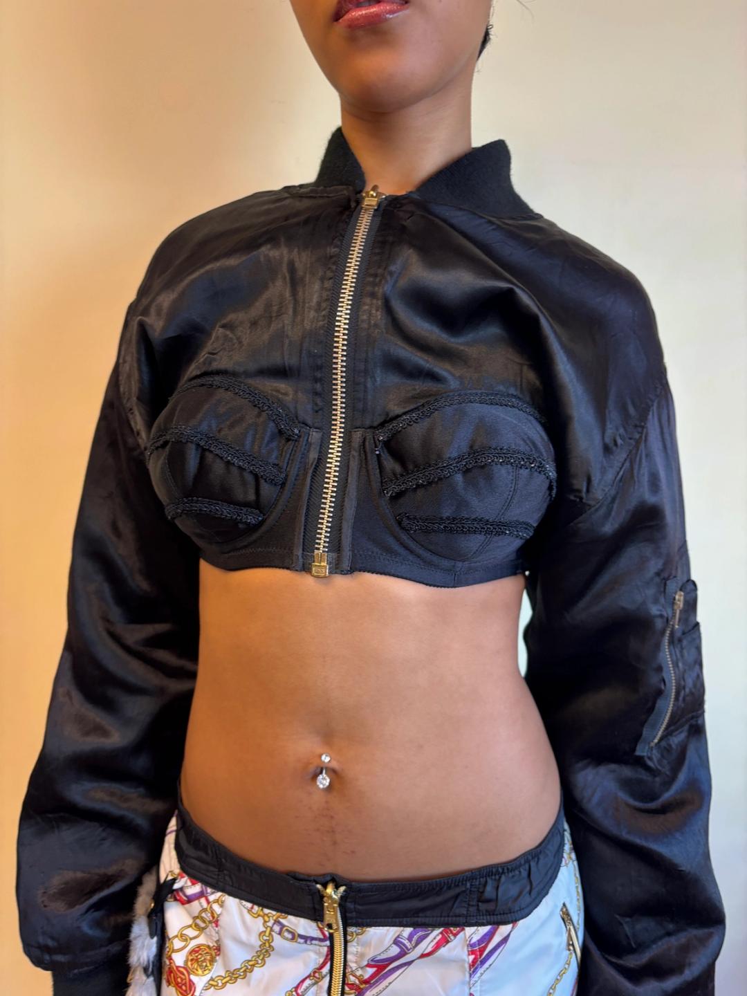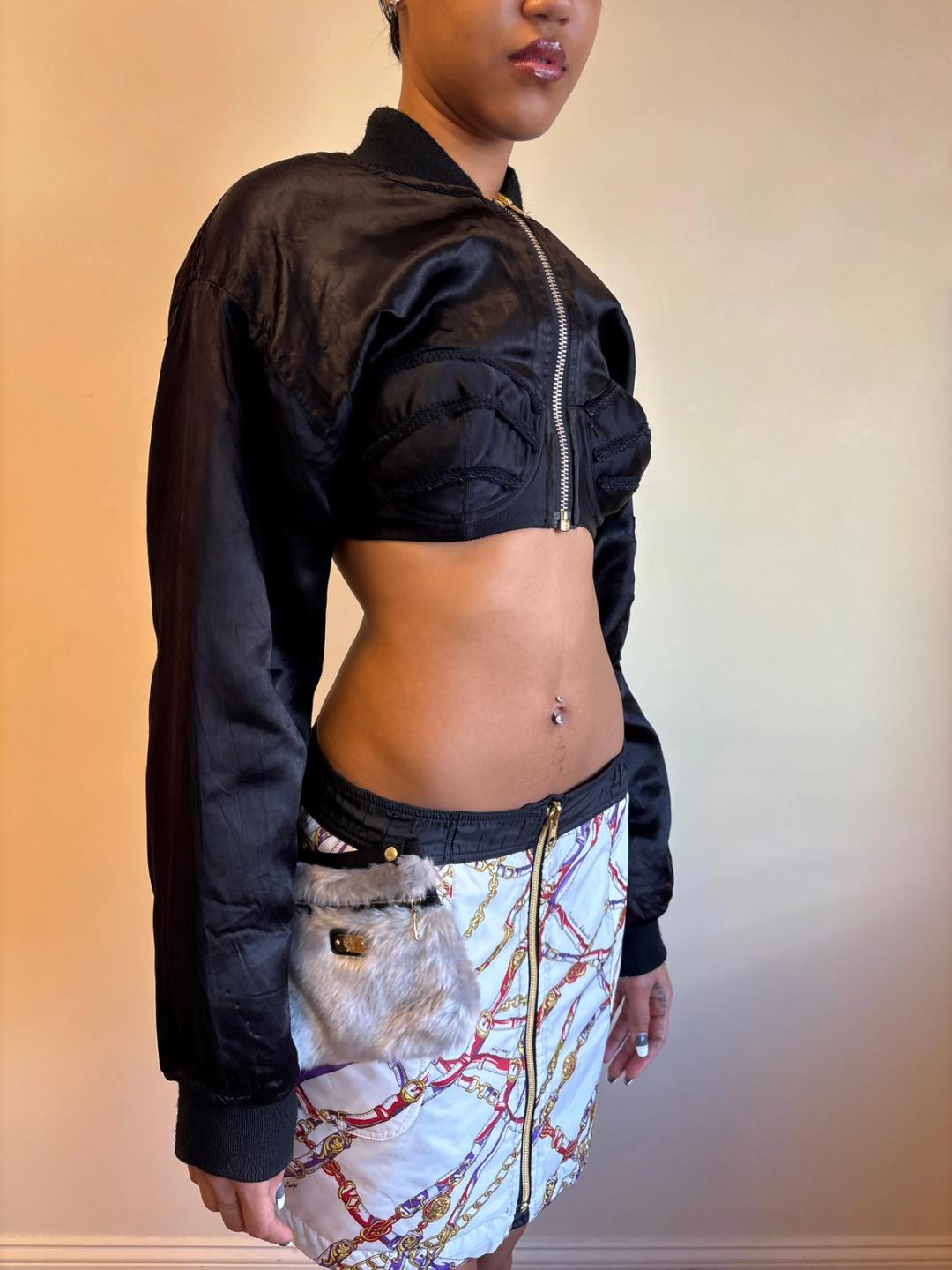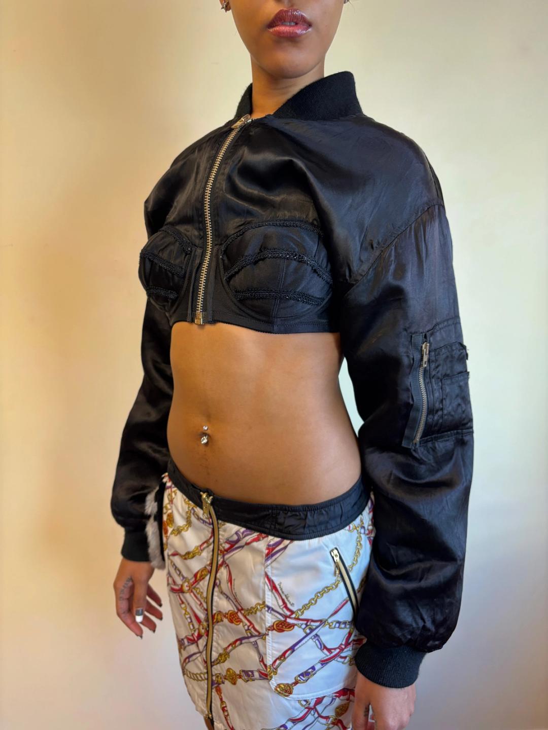 Rare 1980s Helen Storey bomber jacket bustier. The top has a unique silhouette -- with a slightly oversized bomber on the chest & sleeves and a cinched bustier on the bust. There's a zipper at the front and hook and eyes at the back.