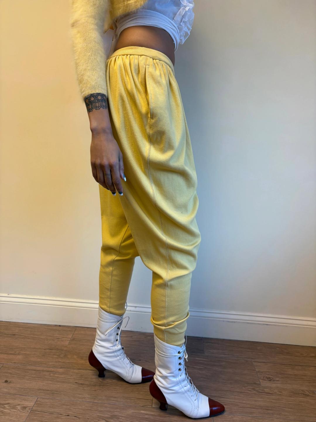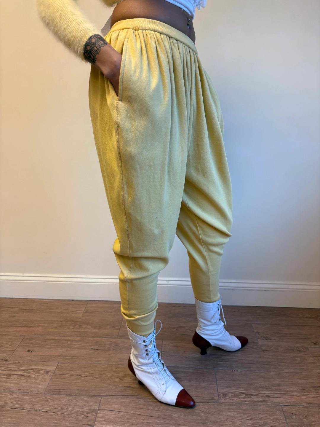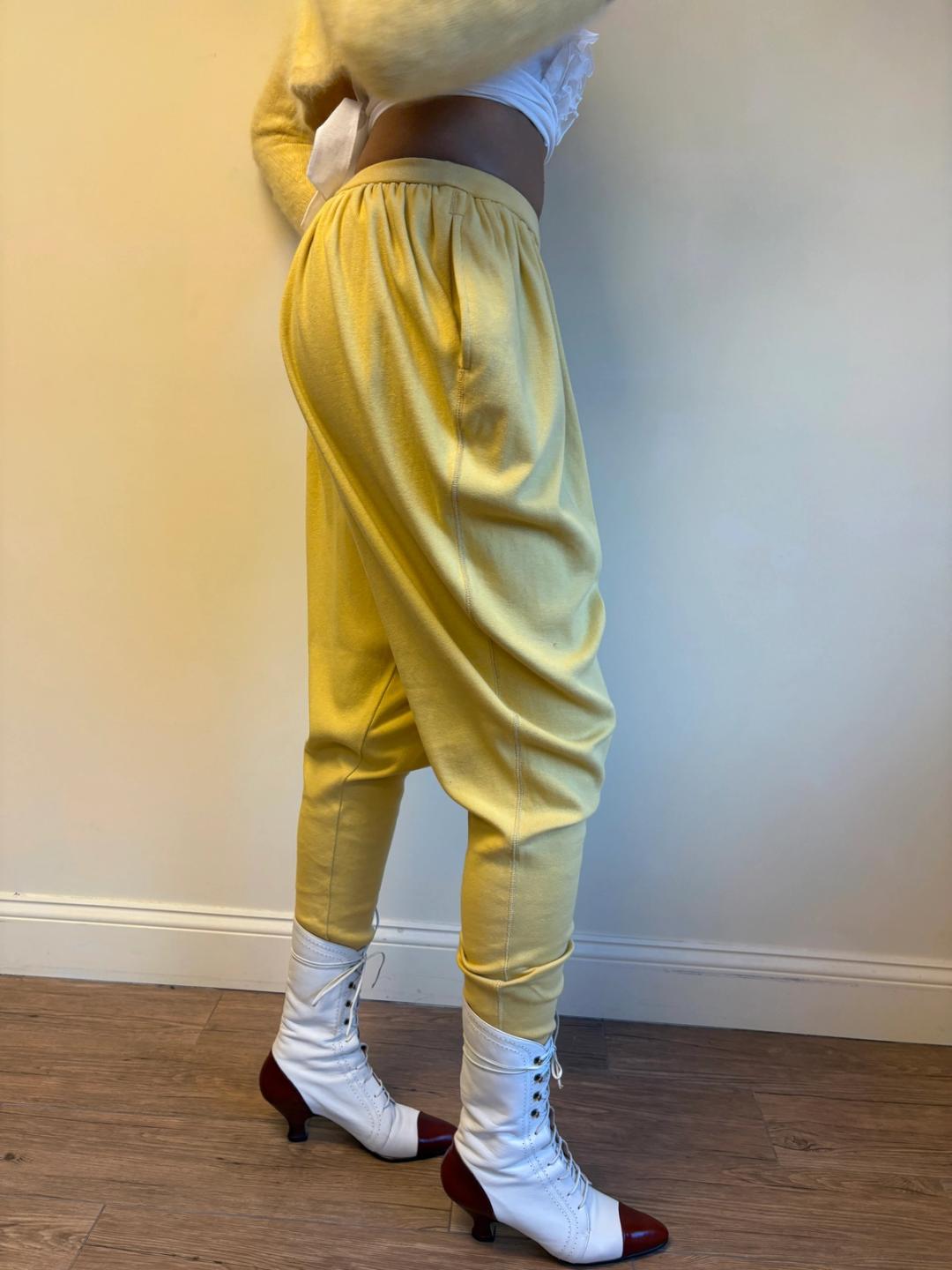 1980s Issey Miyake yellow pants in a gathered balloon style with pockets. Made from a thick cotton knit fabric. In excellent condition.