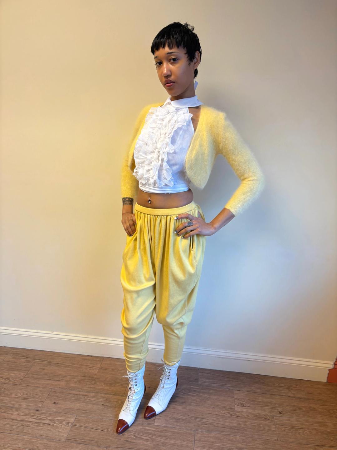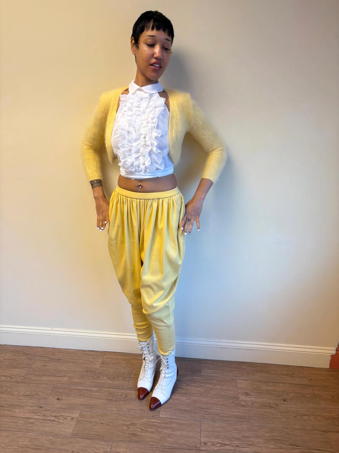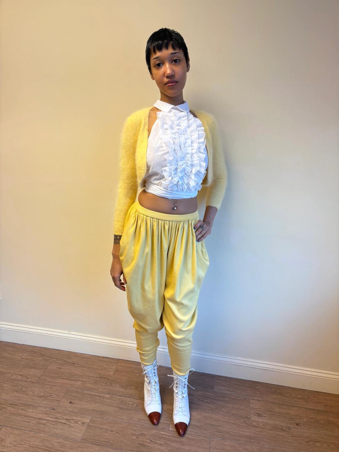 1980s Issey Miyake yellow pants in a gathered balloon style with pockets. Made from a thick cotton knit fabric. In excellent condition.