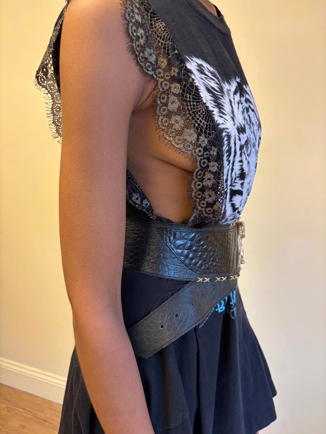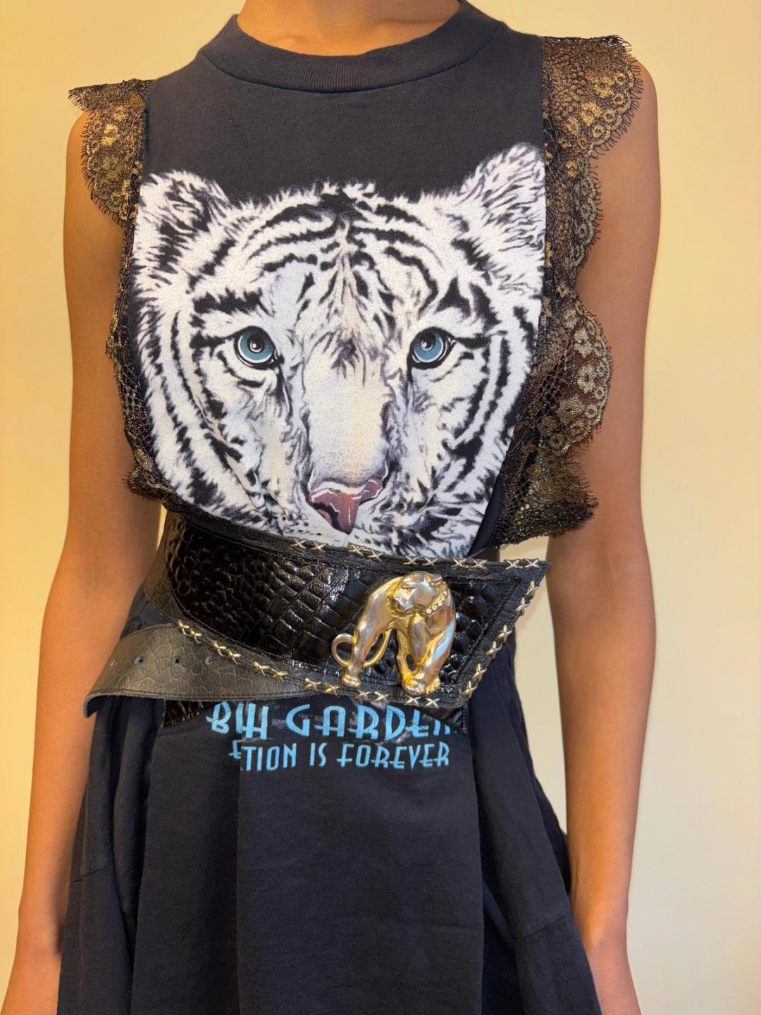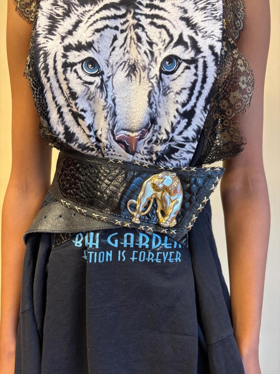 80s French oversized jaguar charm leather asymmetrical belt with exposed metal studded "stitching." Adjustable. Fits from 24"-27" waist.