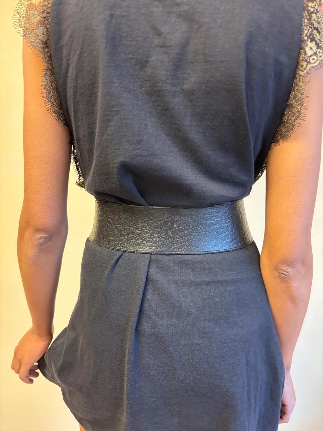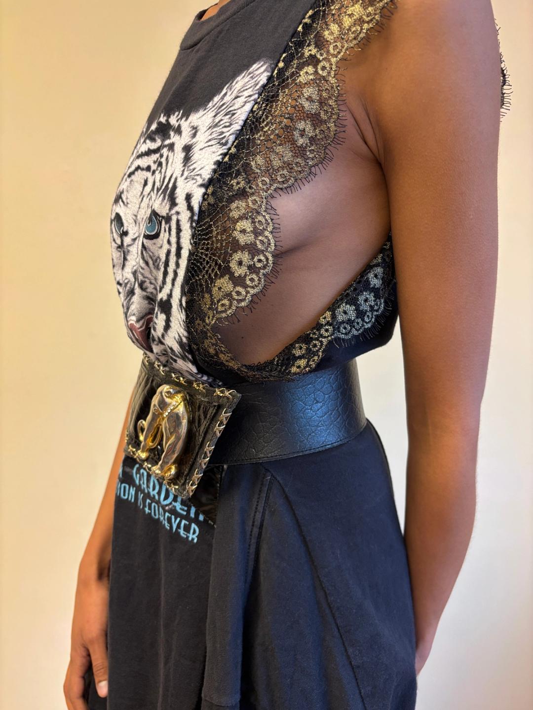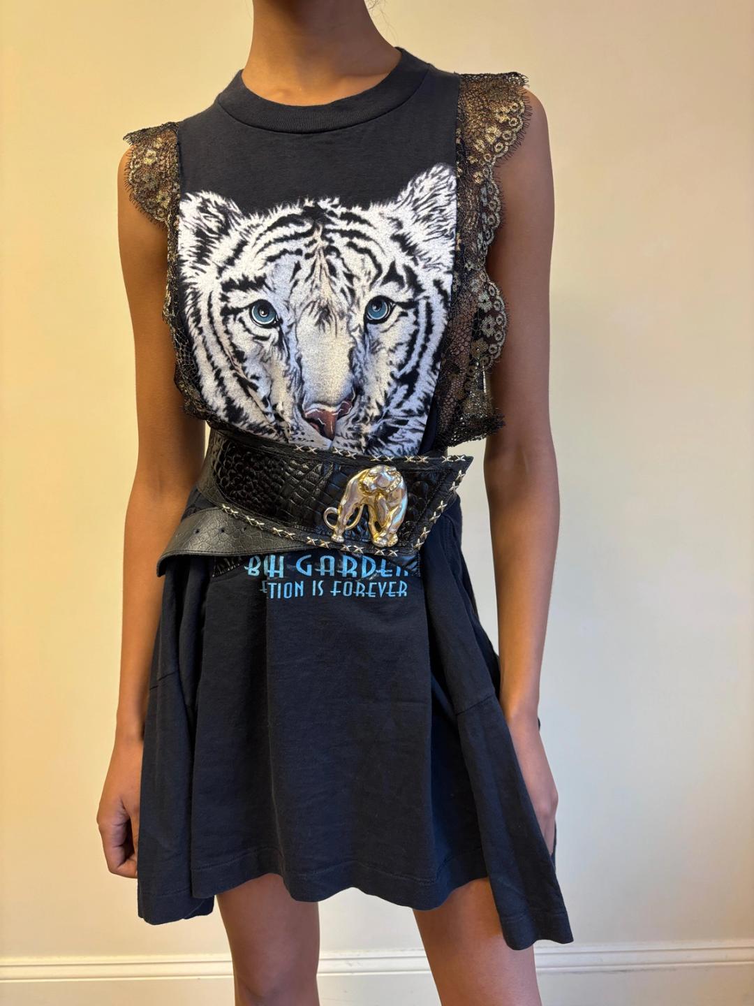80s French oversized jaguar charm leather asymmetrical belt with exposed metal studded "stitching." Adjustable. Fits from 24"-27" waist.