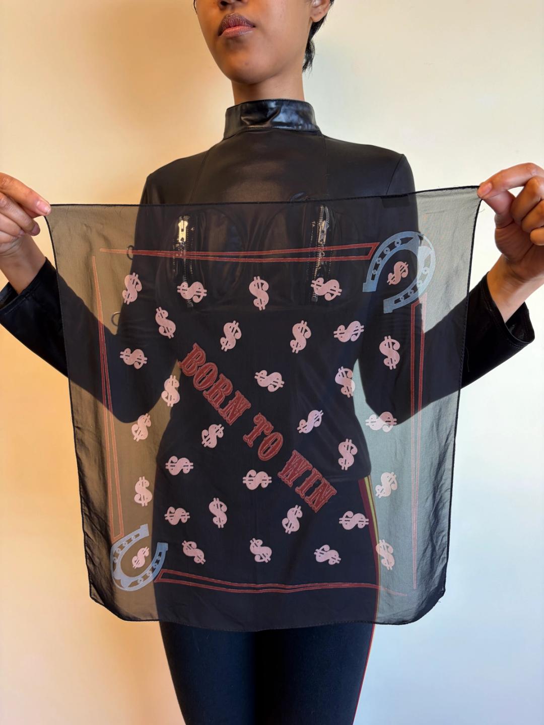 1980s Junior Gaultier handkerchief. It has beautiful dollar sign, horseshoe and "Born to Win" text. Can be used as a headscarf. In pristine condition.