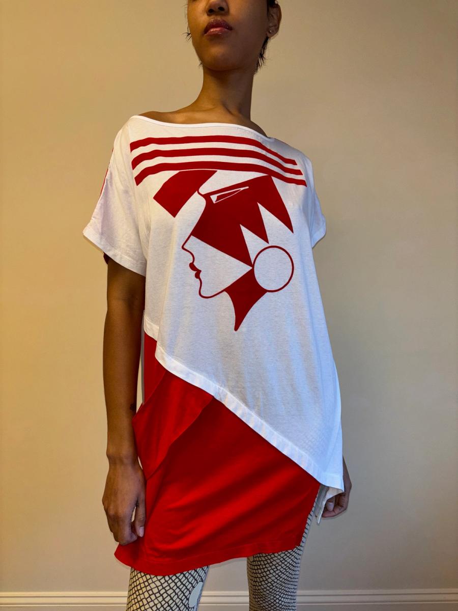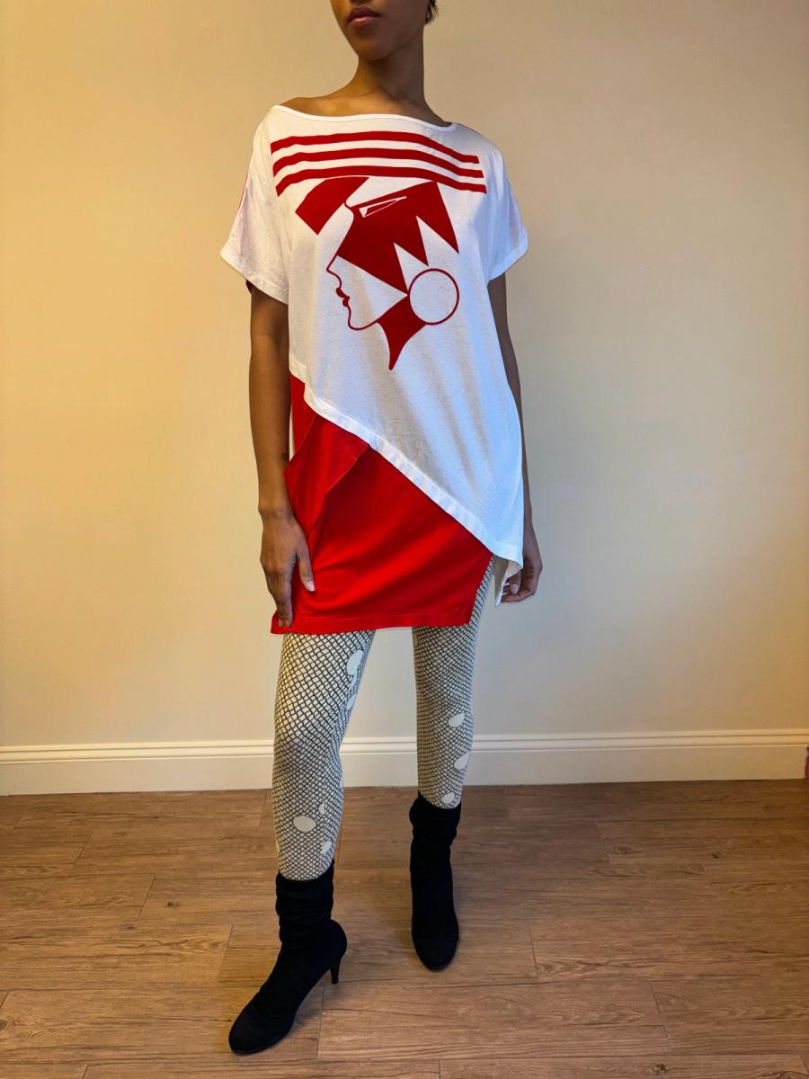 1980s Kansai Yamamoto cotton tunic with a dramatic oversized portrait in red flocking. In perfect condition, quite free size.