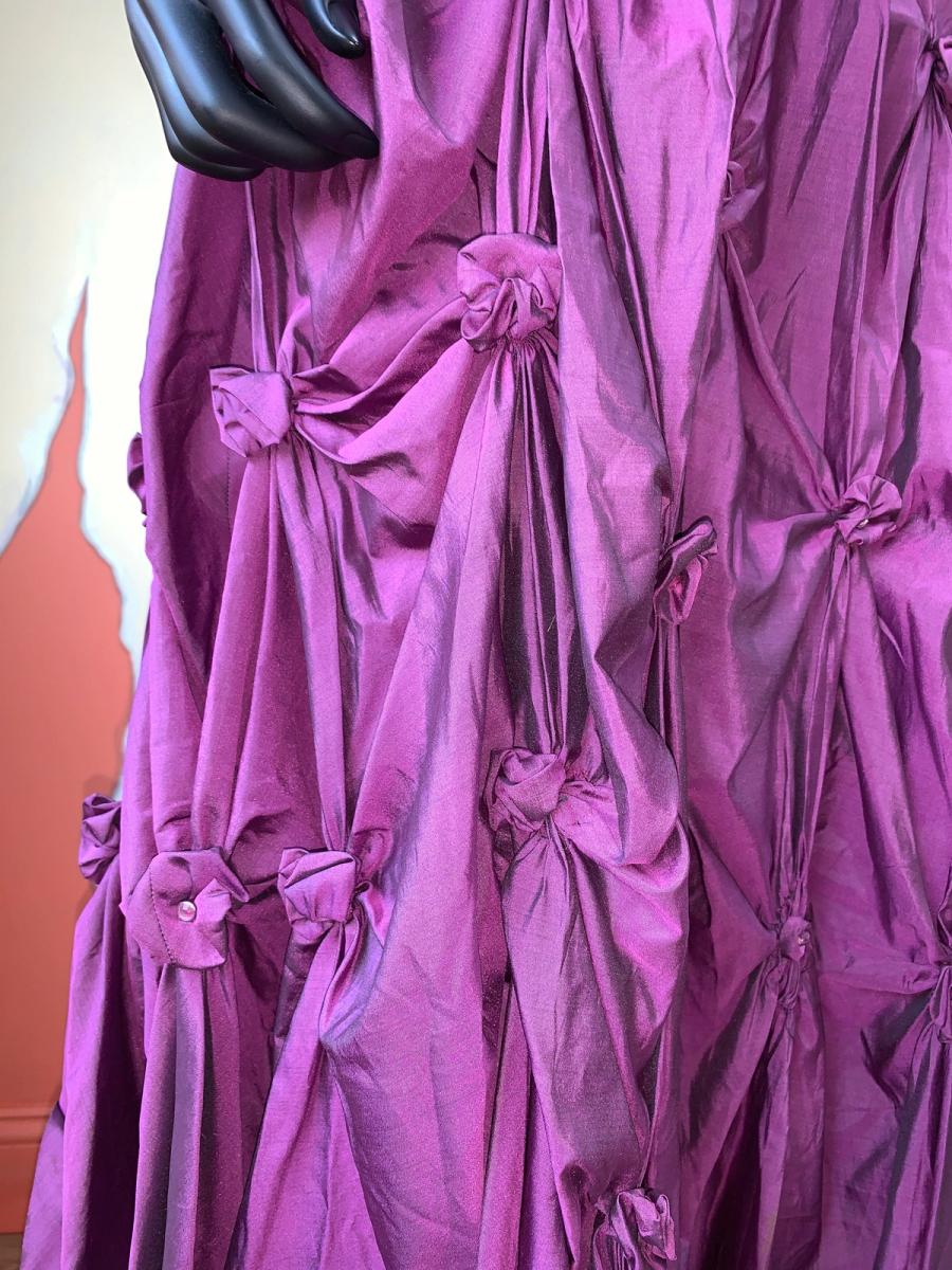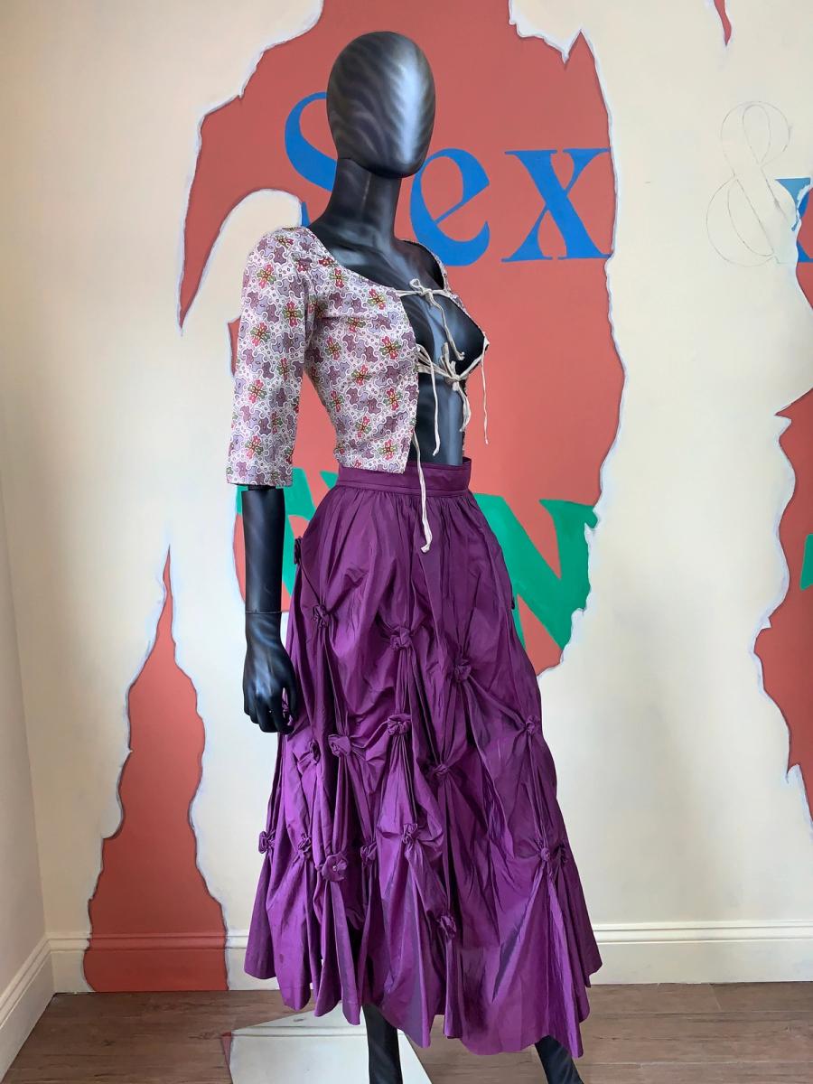 1980s vintage maxi skirt by iconic designer, Kansai Yamamoto. It is made of a royal purple silk fabric with scrunched rosette details throughout, creating a kinetic silhouette. One of the rosettes near the bottom has come undone and there is some scattered staining near the hem, not noticeable when worn.