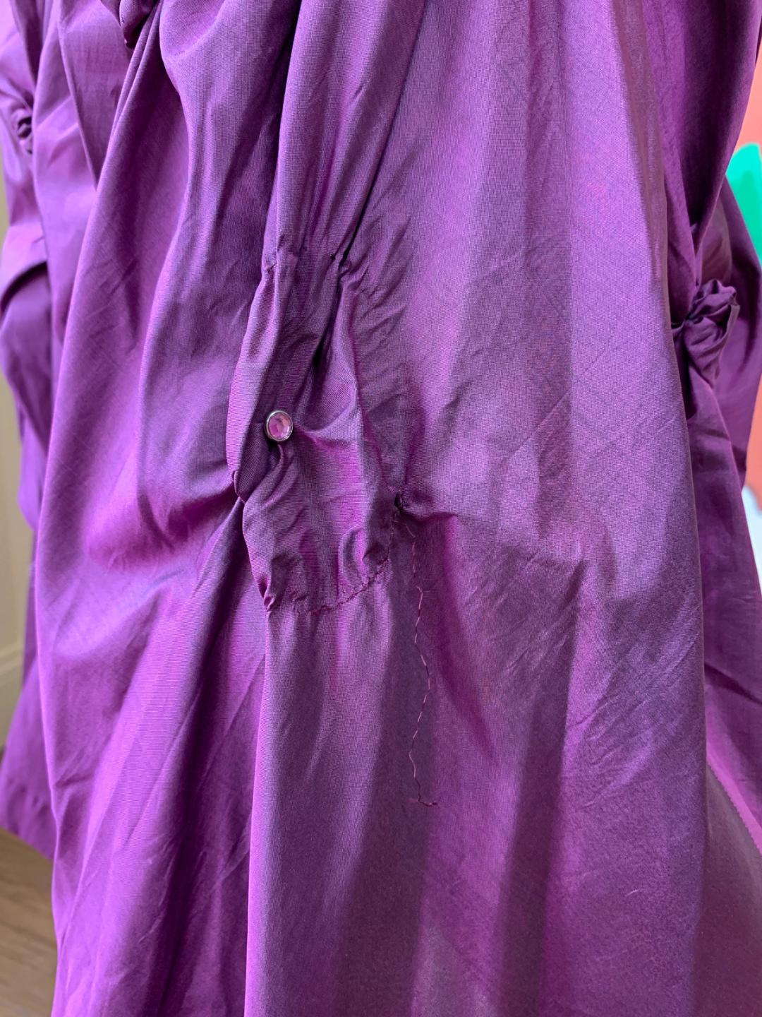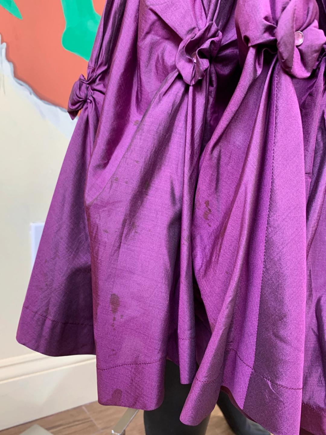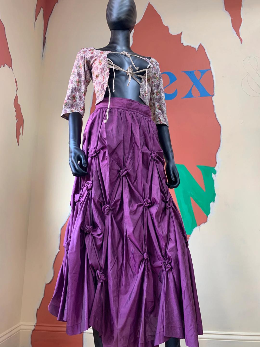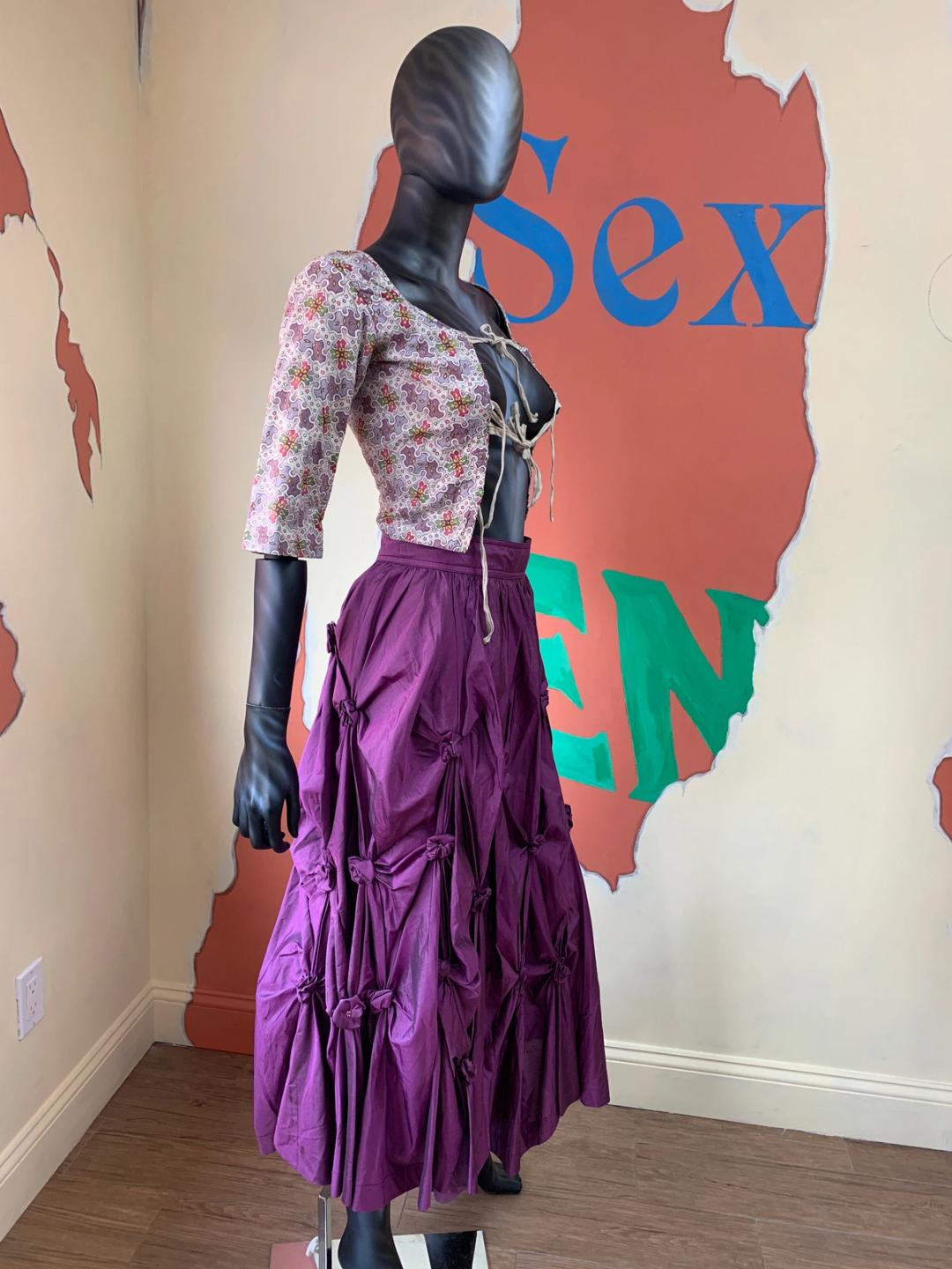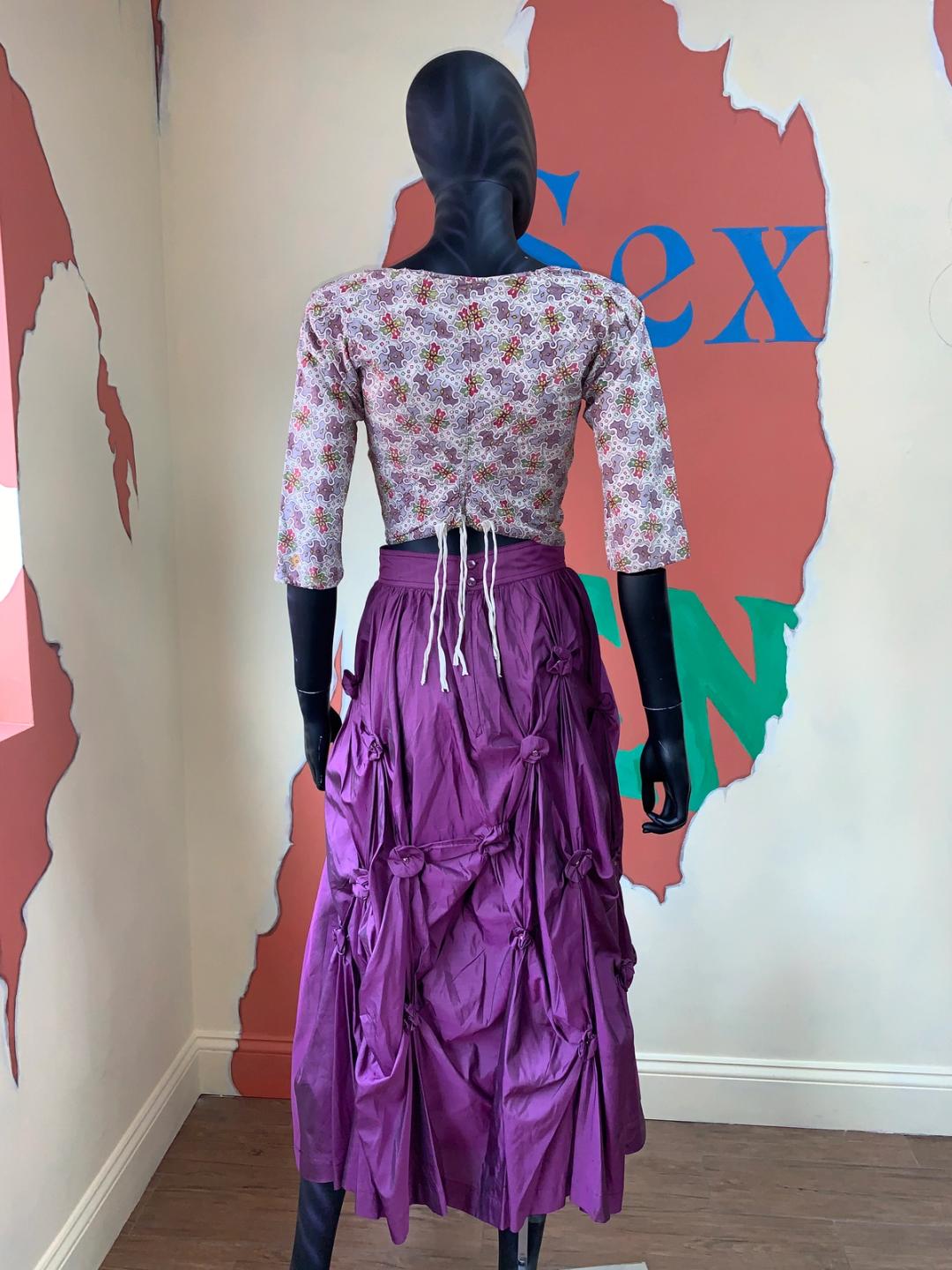 1980s vintage maxi skirt by iconic designer, Kansai Yamamoto. It is made of a royal purple silk fabric with scrunched rosette details throughout, creating a kinetic silhouette. One of the rosettes near the bottom has come undone and there is some scattered staining near the hem, not noticeable when worn.