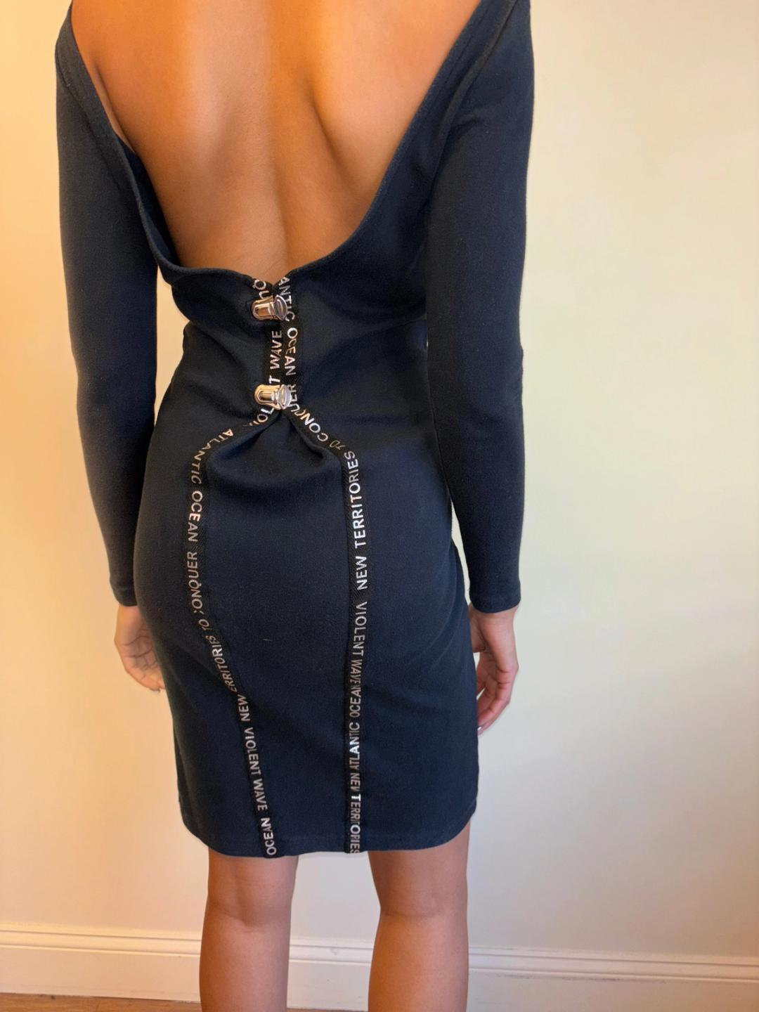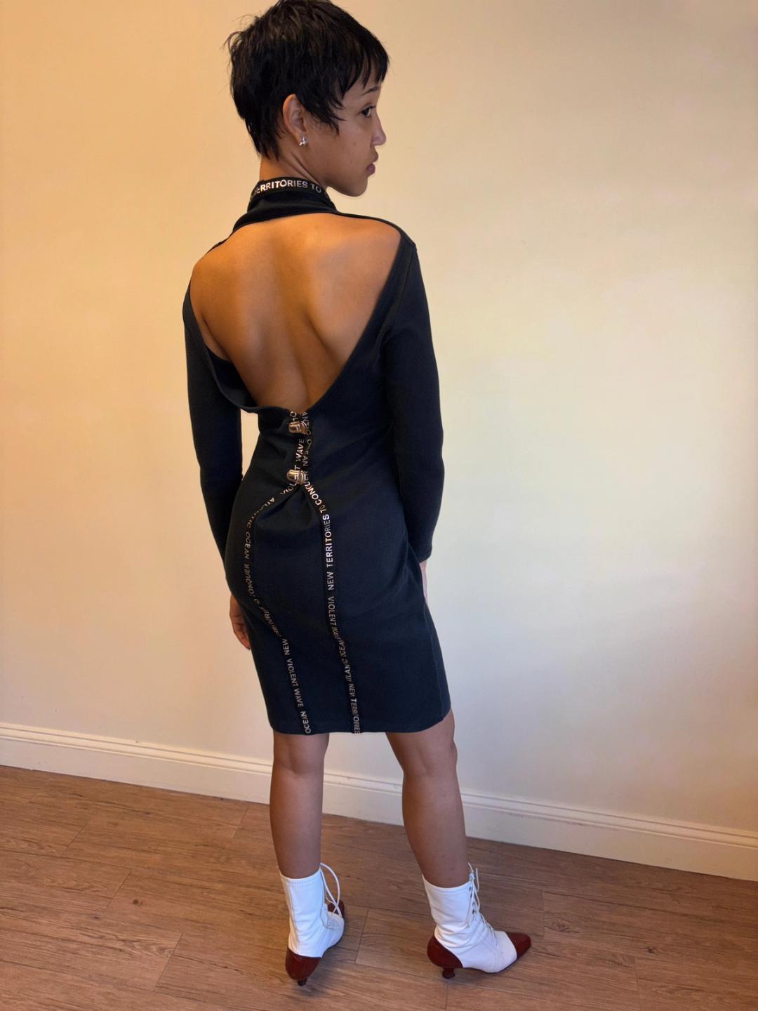 80s Kansai Yamamoto backless dress with text tape. The dress has a brilliant suspender clip design that can be fastened and unfastened.