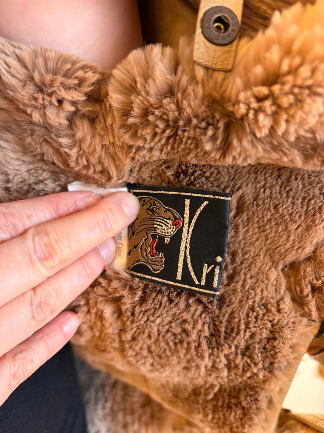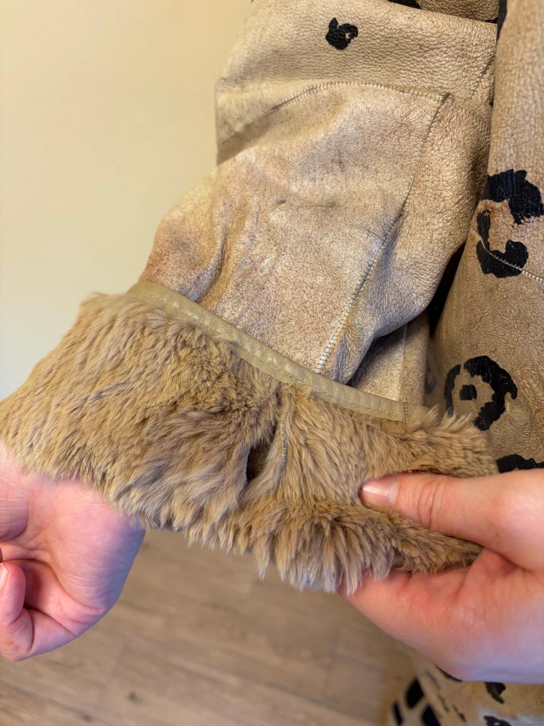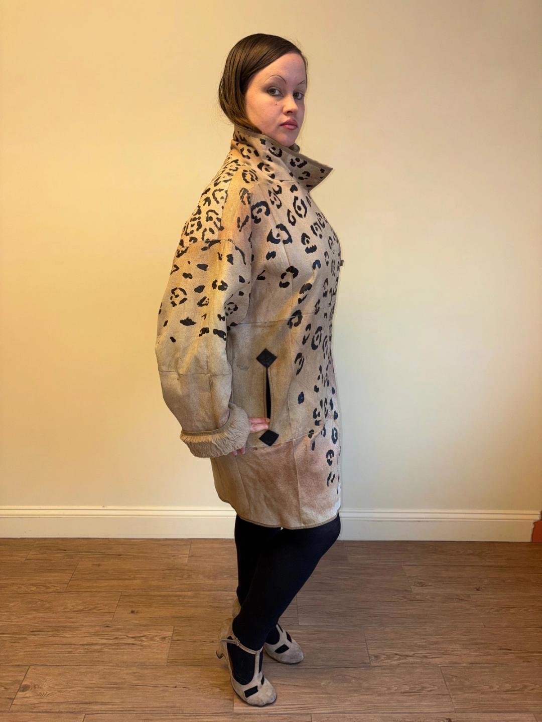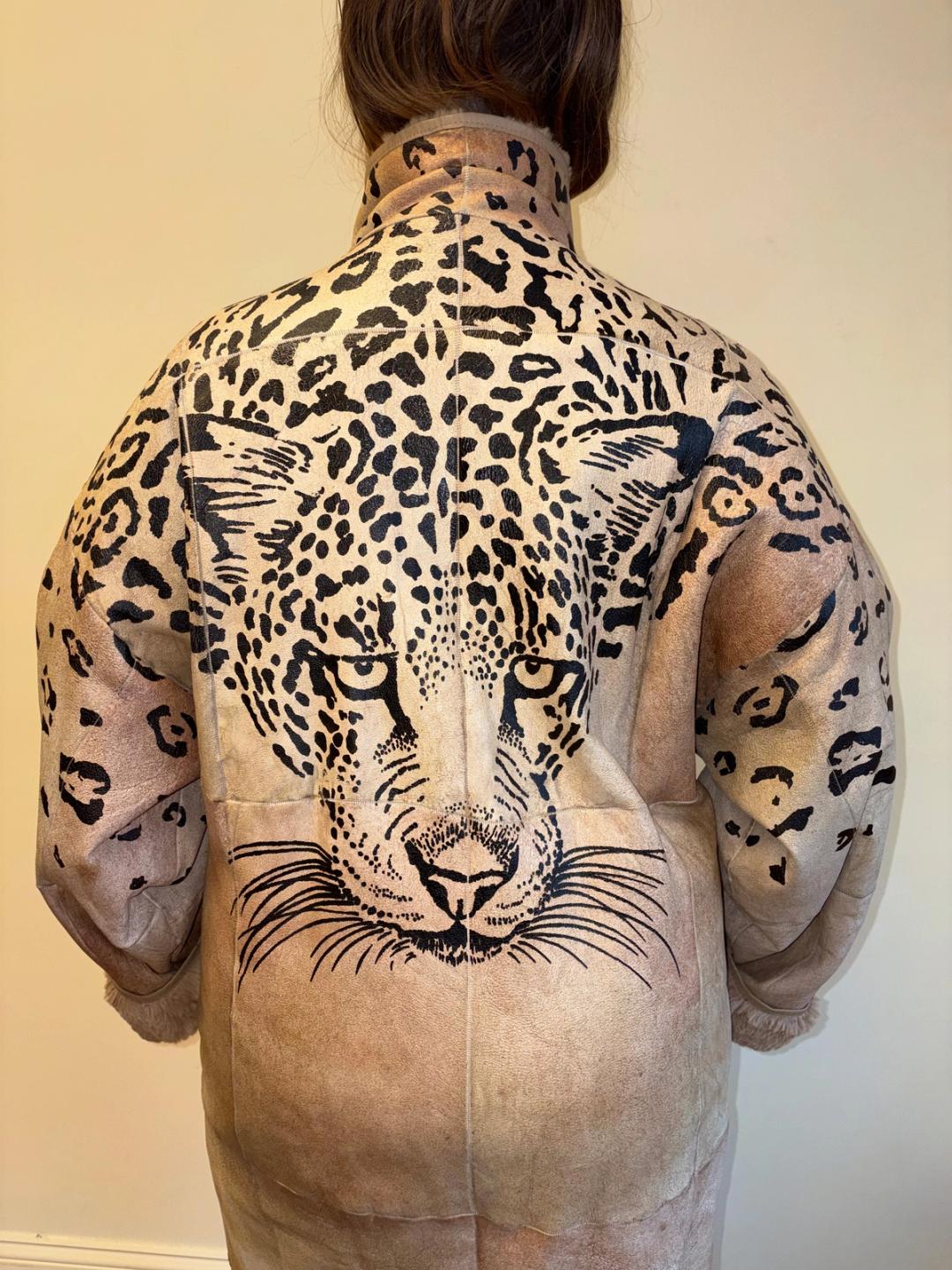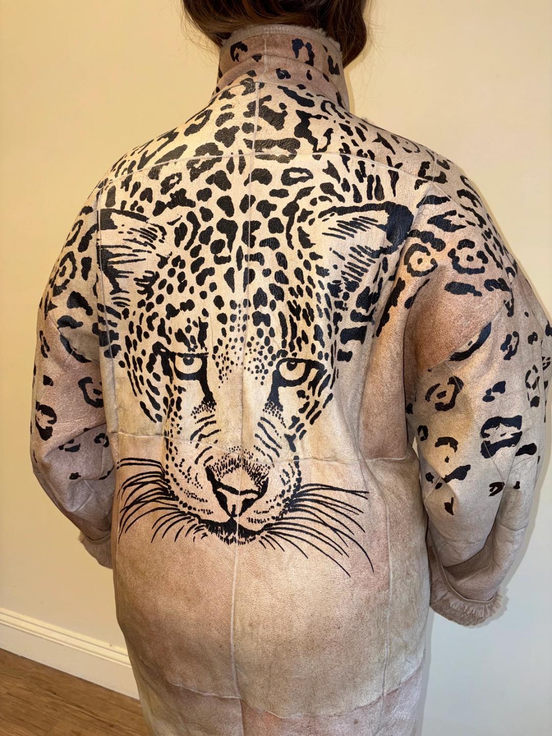 1980s Krizia painted leather jacket with leopard design. It has asymmetrical snap closures. Unisex. Gorgeous vintage big cat tag inside. The jacket has an undone part on one of the sleeve cuffs -- see last image.