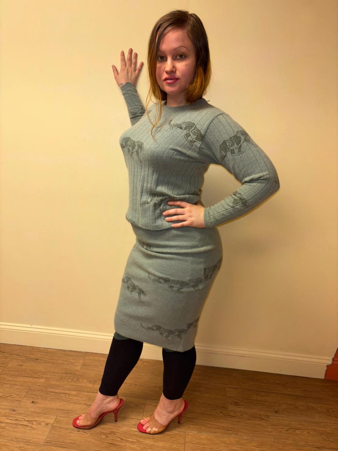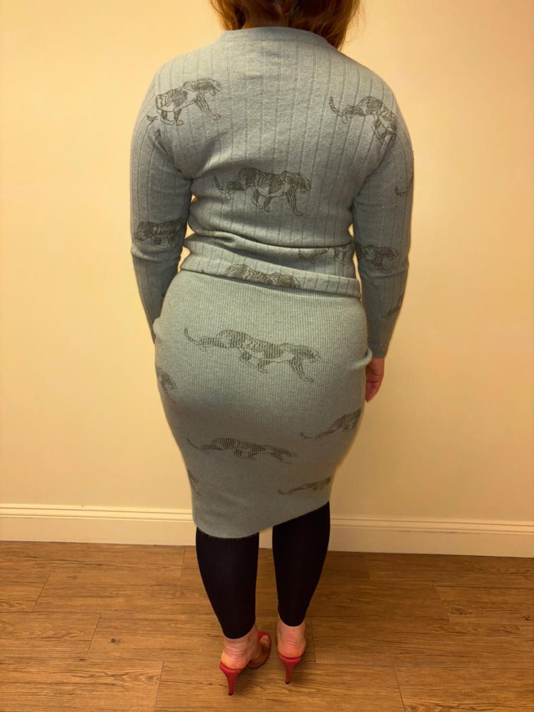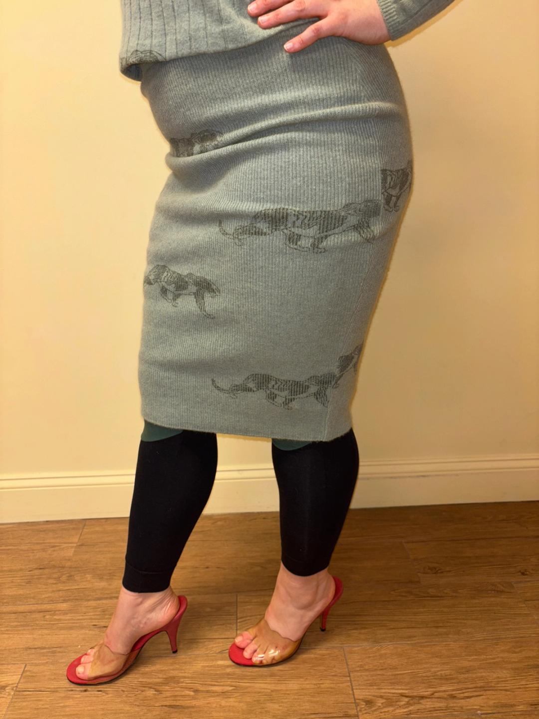 1980s Krizia soft green knit set with an all over panther print. The set includes a top and skirt. They're quite stretchy for a fitted silhouette. There's a small hole on one of the sleeves of the top (see last image).