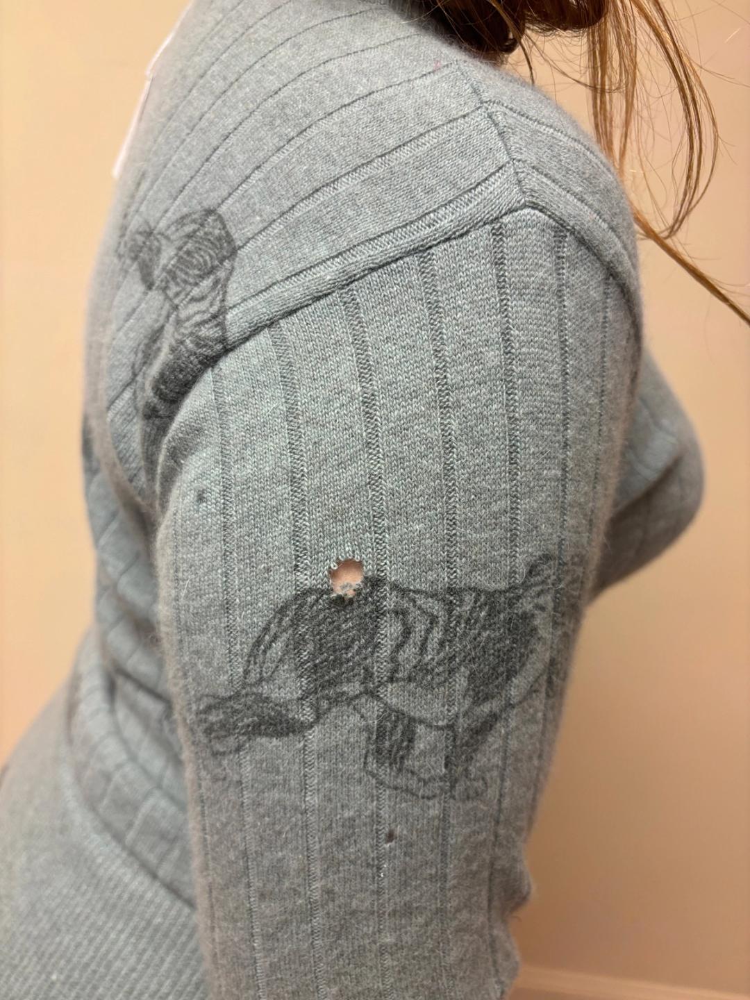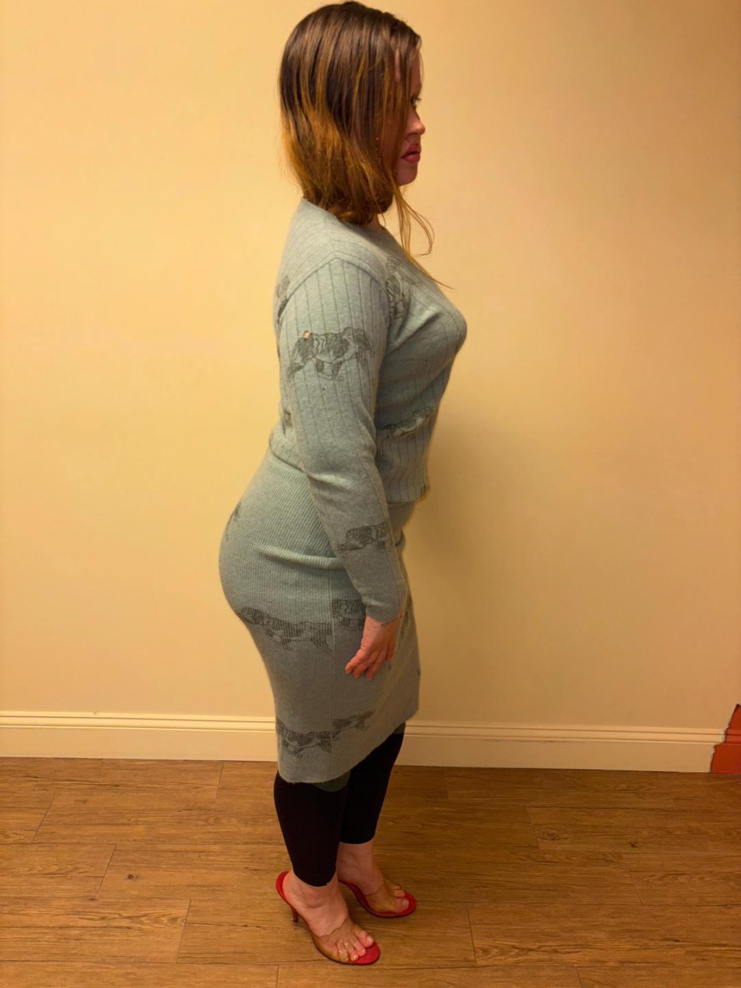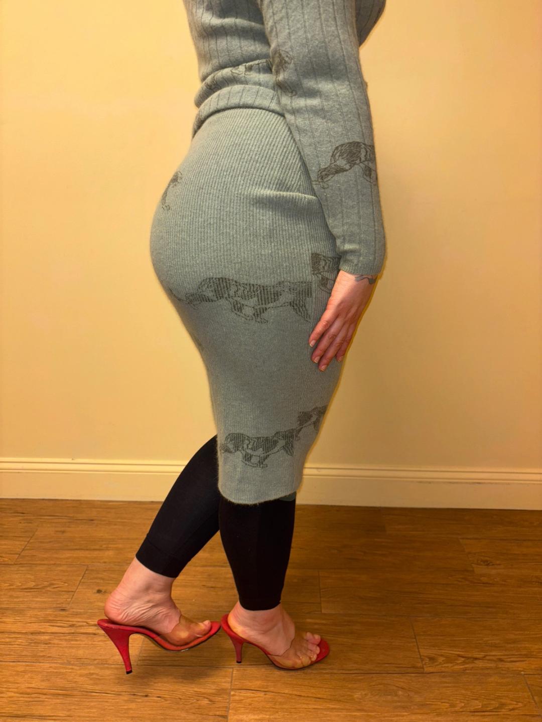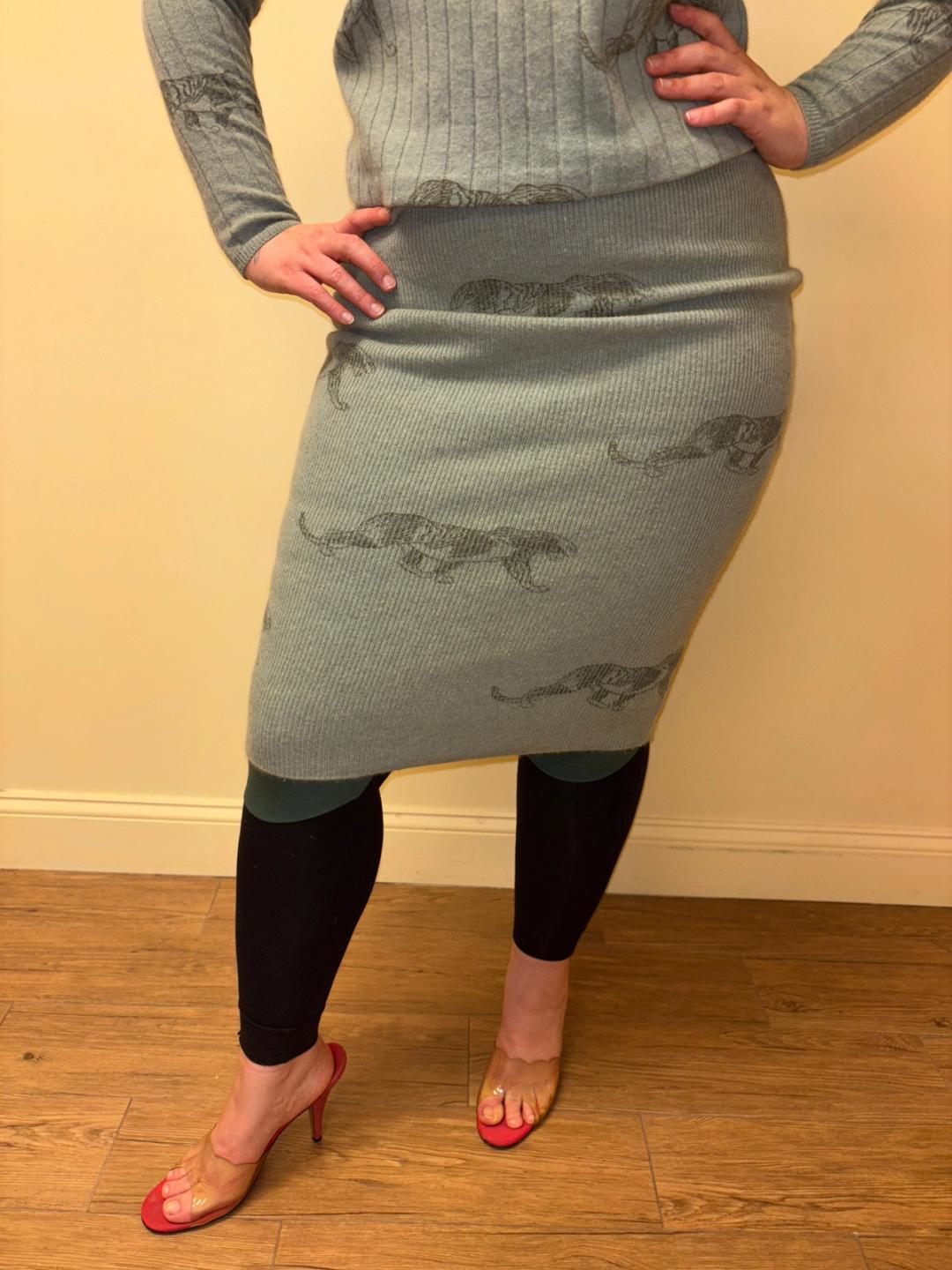 1980s Krizia soft green knit set with an all over panther print. The set includes a top and skirt. They're quite stretchy for a fitted silhouette. There's a small hole on one of the sleeves of the top (see last image).