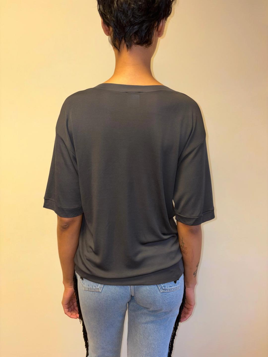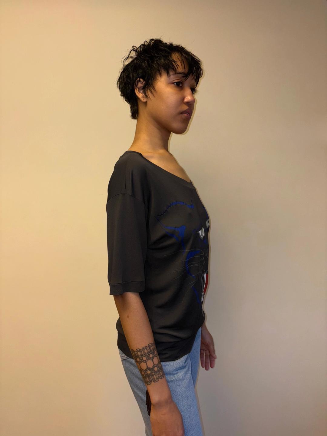Krizia slinky off-the-shoulder top with image of a gorgeous panther from 1984. It is a boatneck style The image is printed beautifully. A bodysuit version of this top is documented in rare issue of Italian fashion magazine 'Donna' from 1984. Made from 100% rayon, made in Italy.
