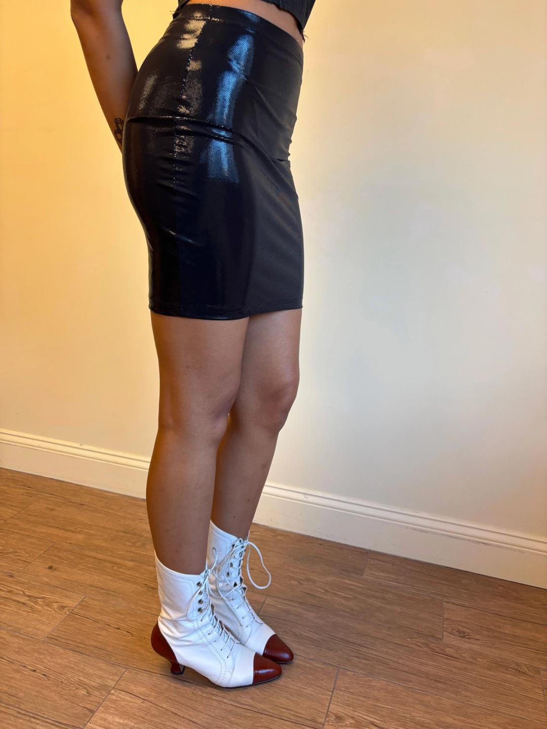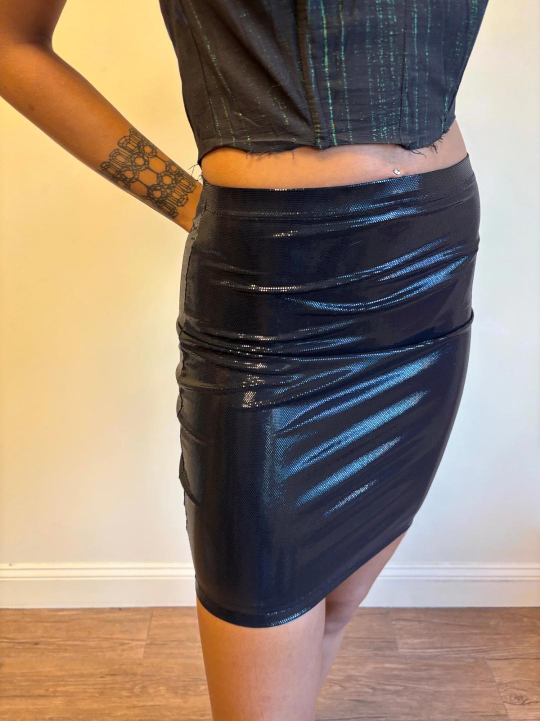 1980s wet look style pencil skirt by Krizia. The skirt is very stretchy and formfitting. It has an iridescent and shimmery wet effect.