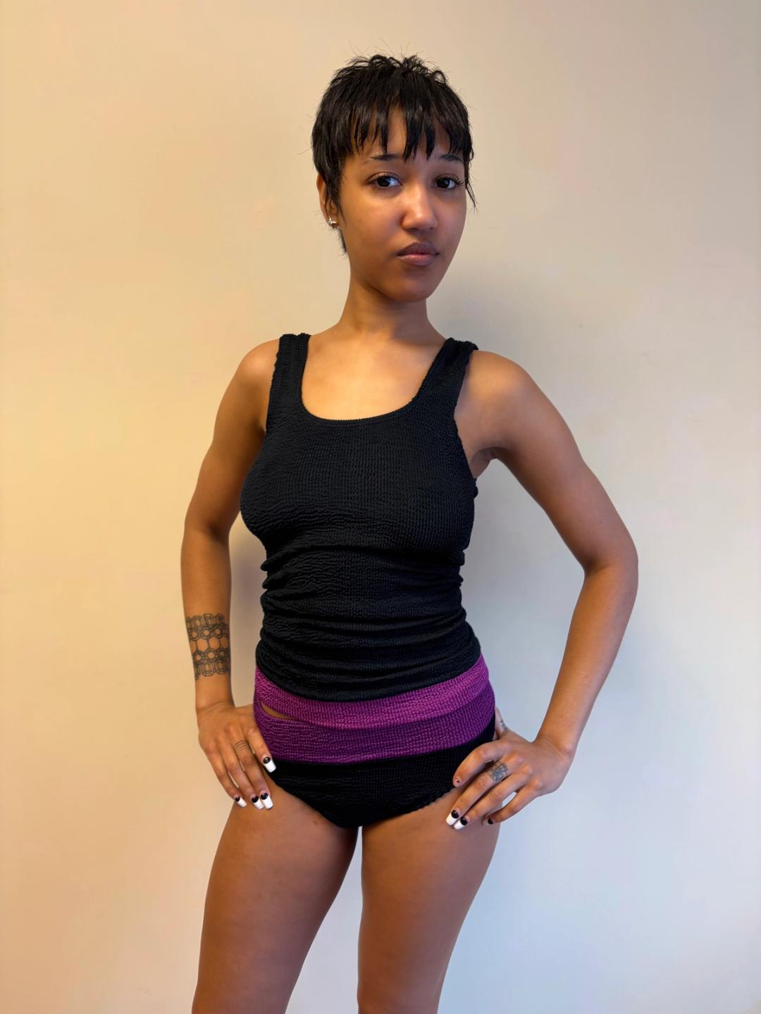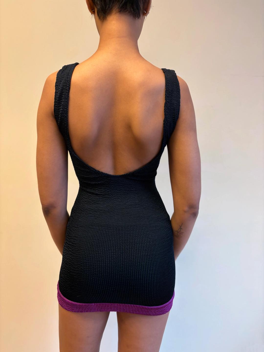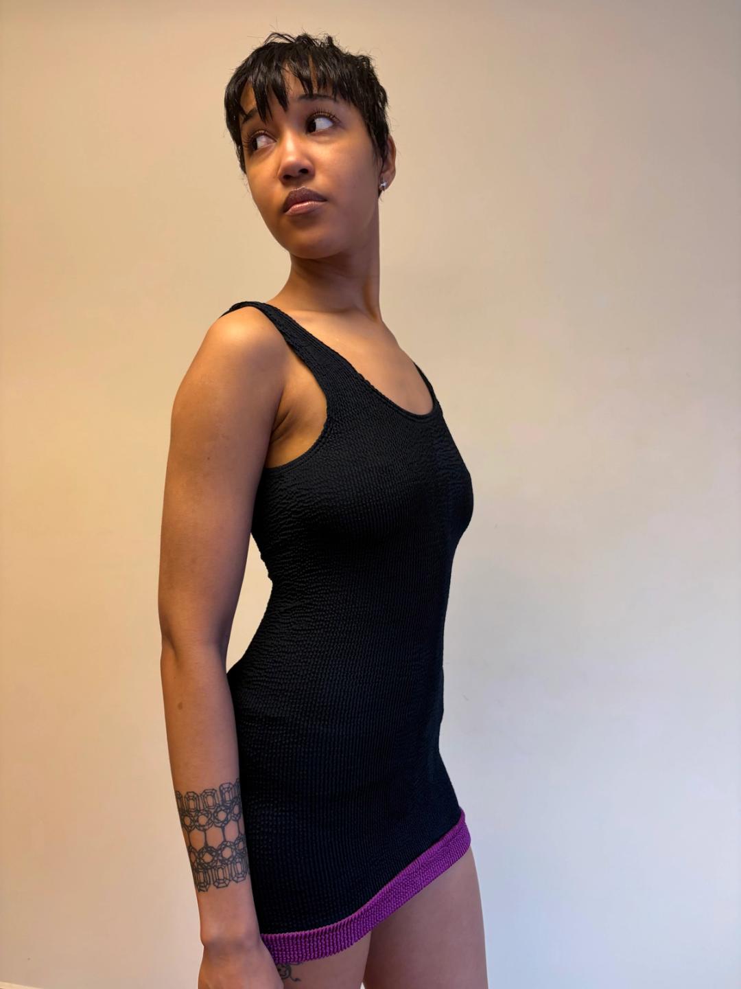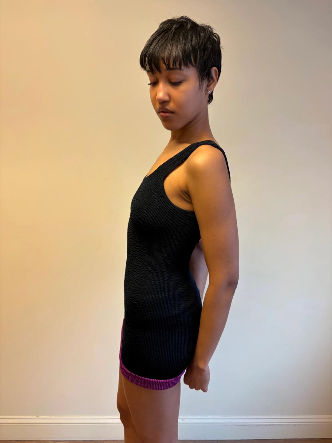1980s Liza Bruce navy and fuchsia two piece set which includes a tank top that can be worn as a dress and short pants. Made of the designer's signature ultra stretchy wavy ribbed textile. In excellent condition.