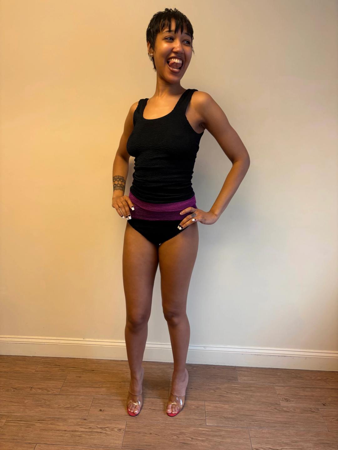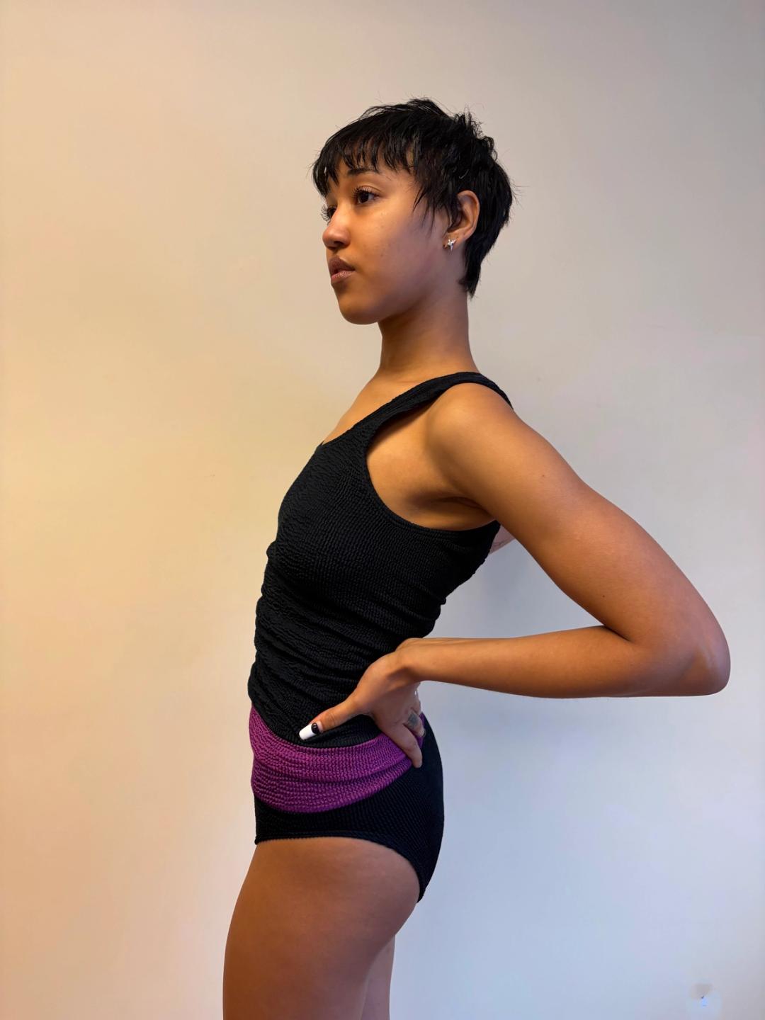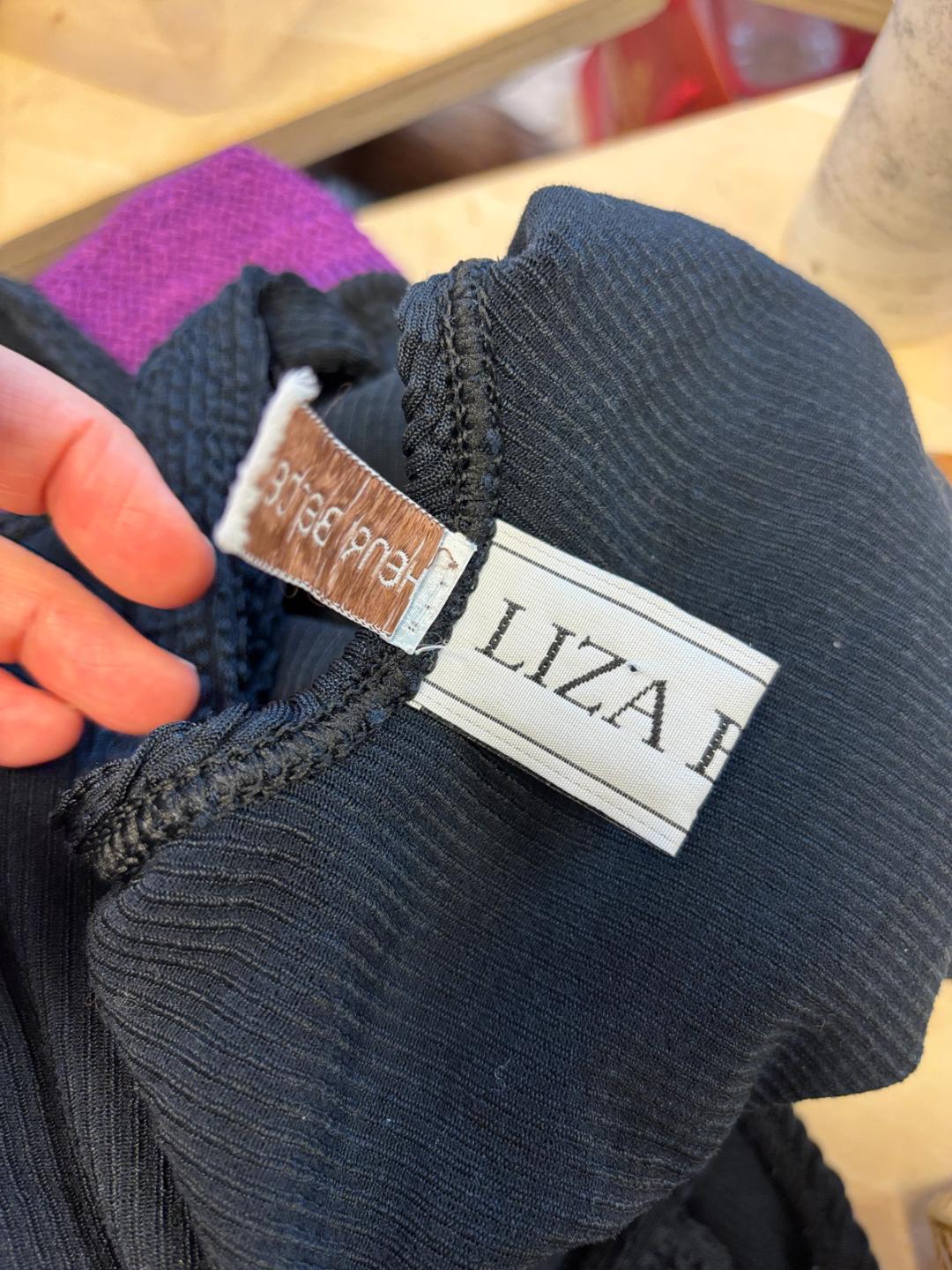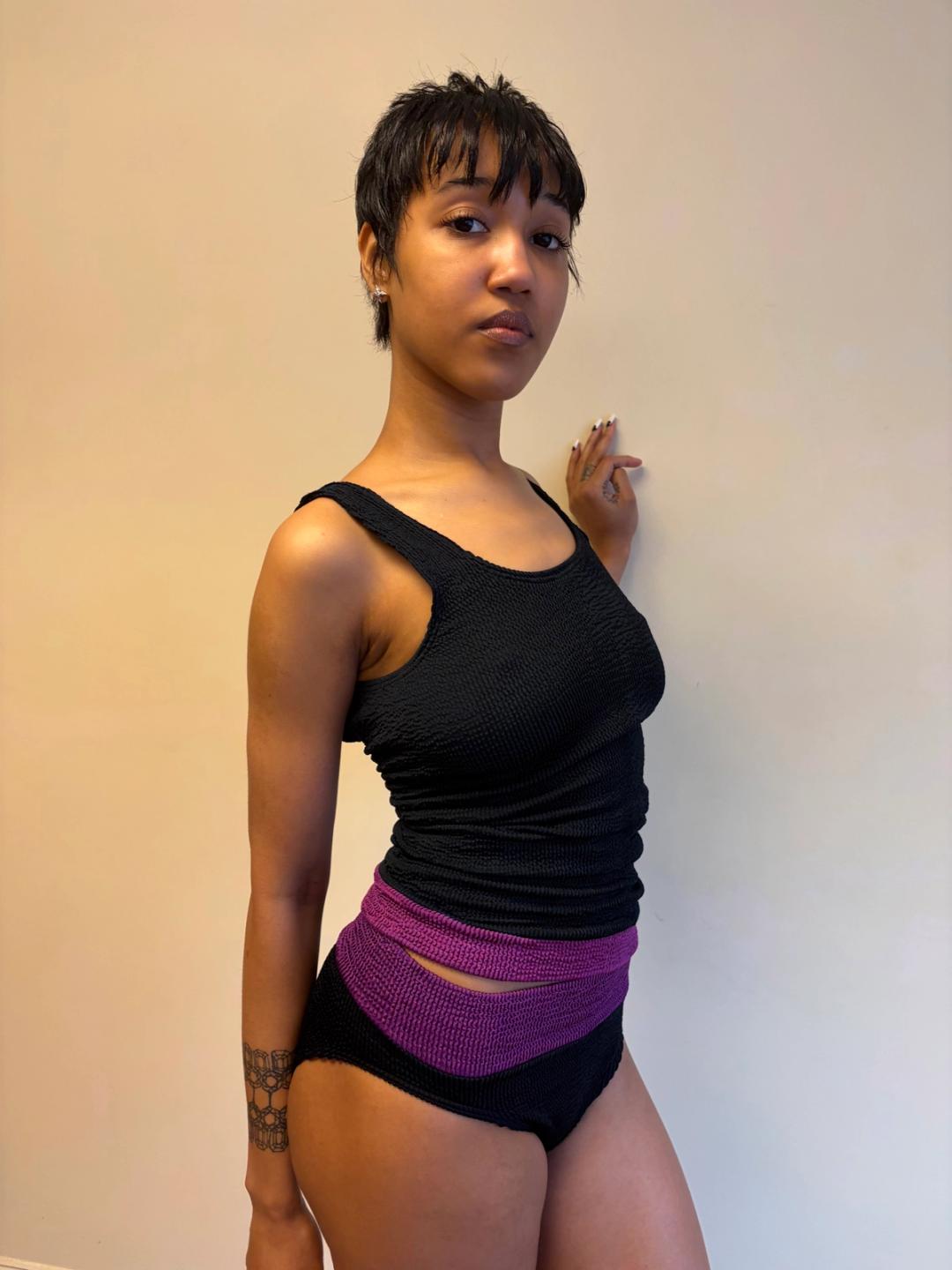 1980s Liza Bruce navy and fuchsia two piece set which includes a tank top that can be worn as a dress and short pants. Made of the designer's signature ultra stretchy wavy ribbed textile. In excellent condition.