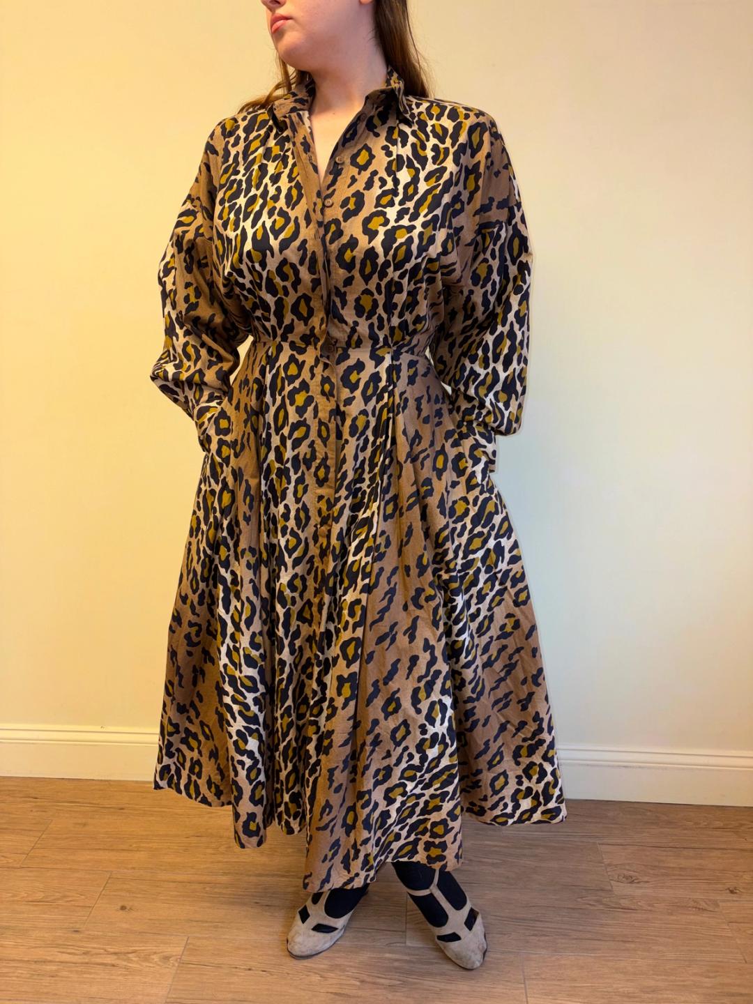 1980s Norma Kamali cheetah print A-line dress. The dress has a full skirt and cinched waist.