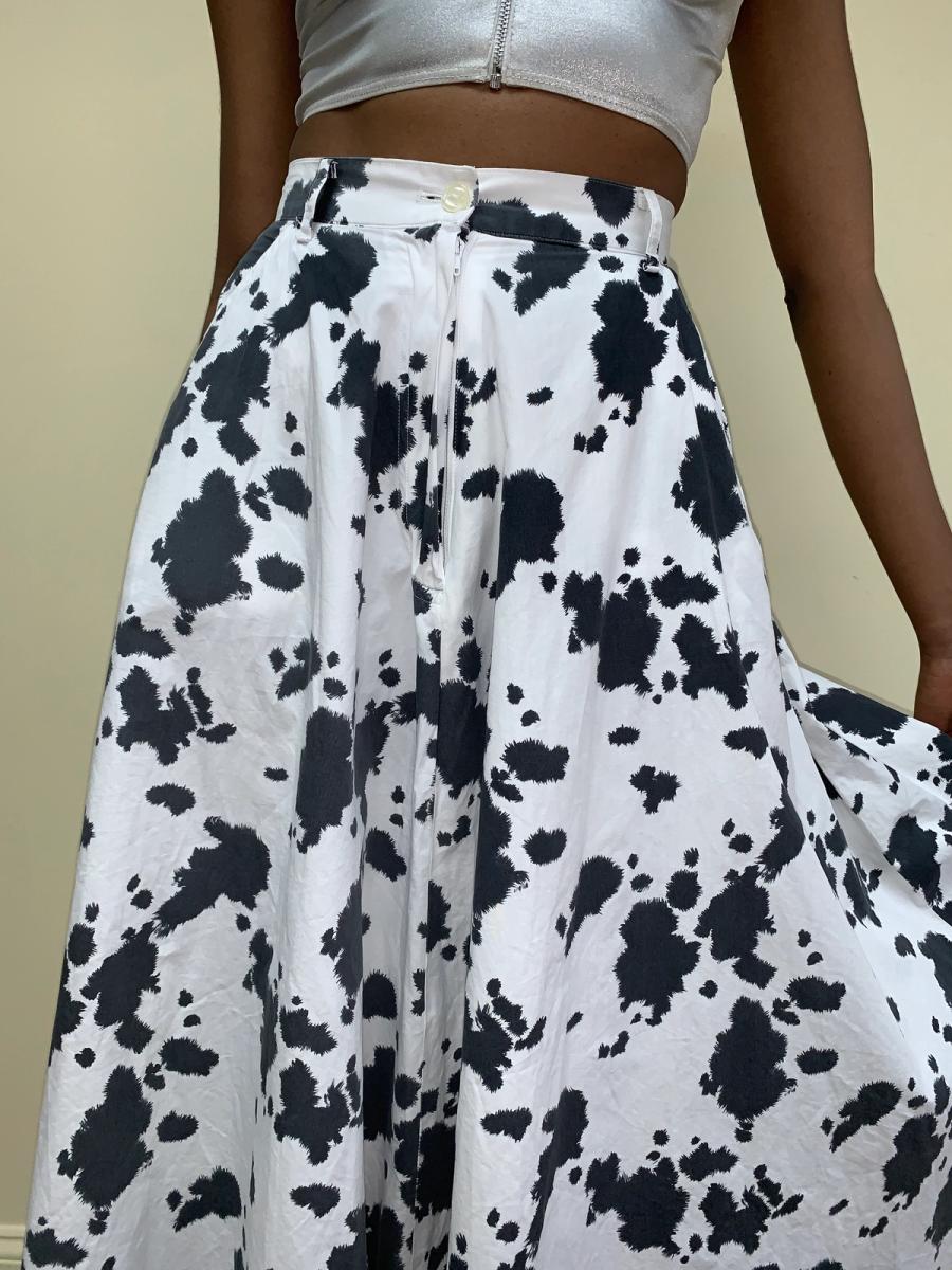 Vintage 1980s Norma Kamali skirt with unusual cow print. The skirt is an A-line style with a high fitted waist. There are pockets in the front and back. In excellent vintage condition!