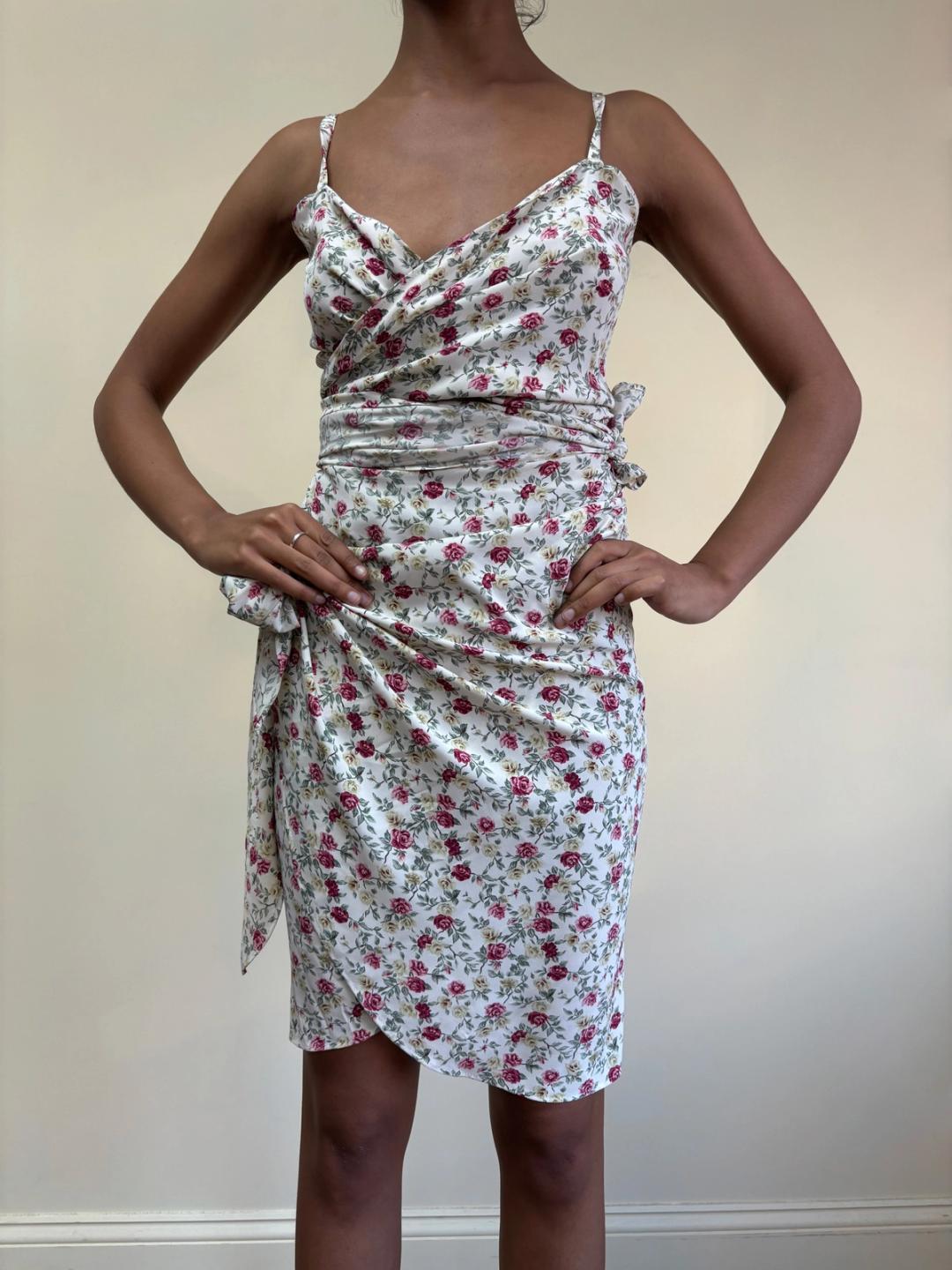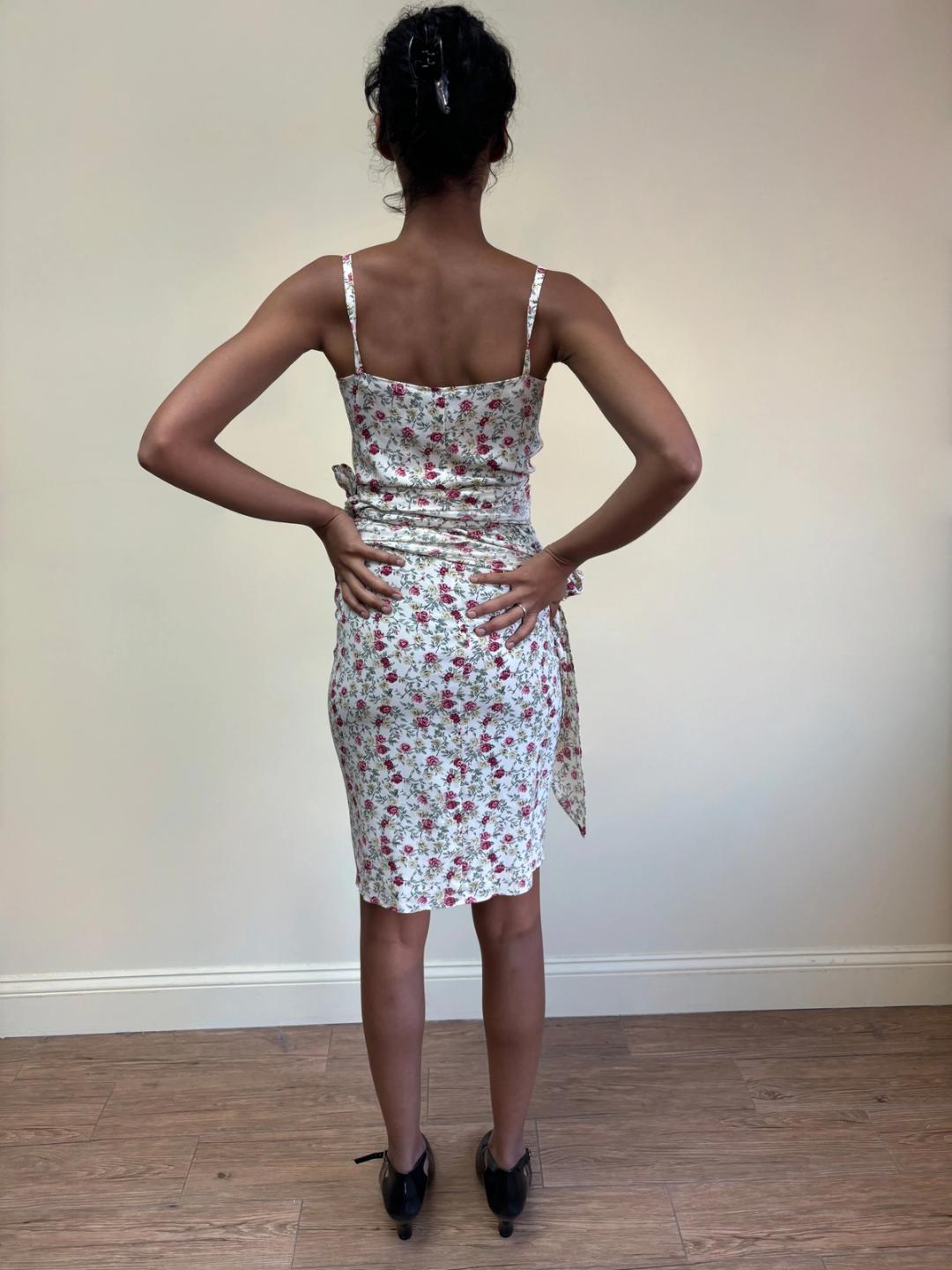 80s or 90s Norma Kamali floral print wrap dress. The dress ties at the top and at the waist for a figure hugging silhouette. It can be midriff bearing if desired. Adjustable. One size fits most.