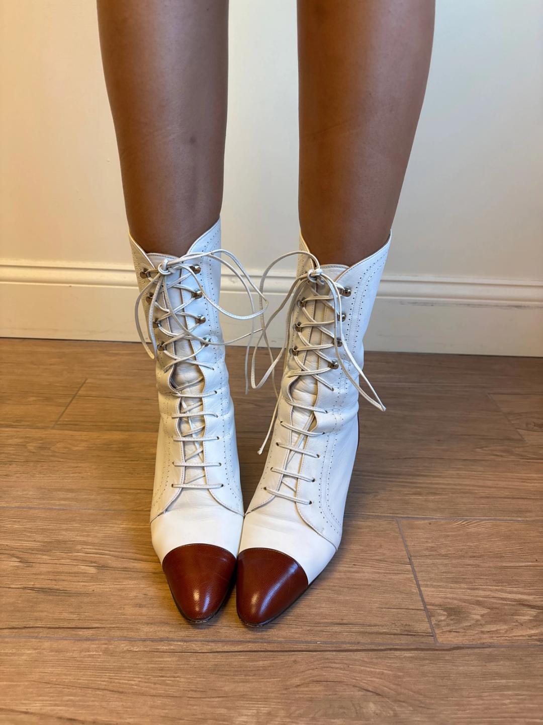 Norma Kamali 1980s "Spectator" style boots influenced by Edwardian styles ranging between 1890-1920. The boots come with the original box and receipt from when the original owner purchased them in the 80s! The shoes are a US size 8.