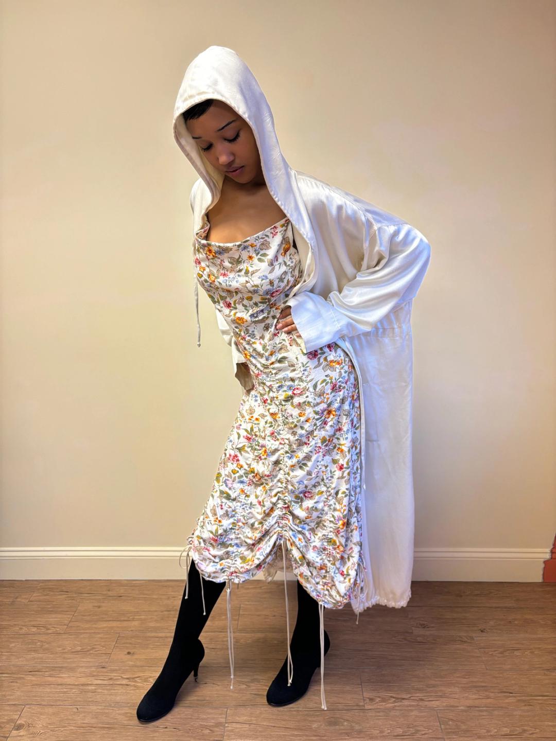 Rare 80s Norma Kamali OMO pearlescent satin boxing jacket. The jacket is quite oversized and cinches with ties at the waist, the hood and the bottom of the jacket for a fitted yet sculptural look. It has a dramatic hood and functional large pockets as well.