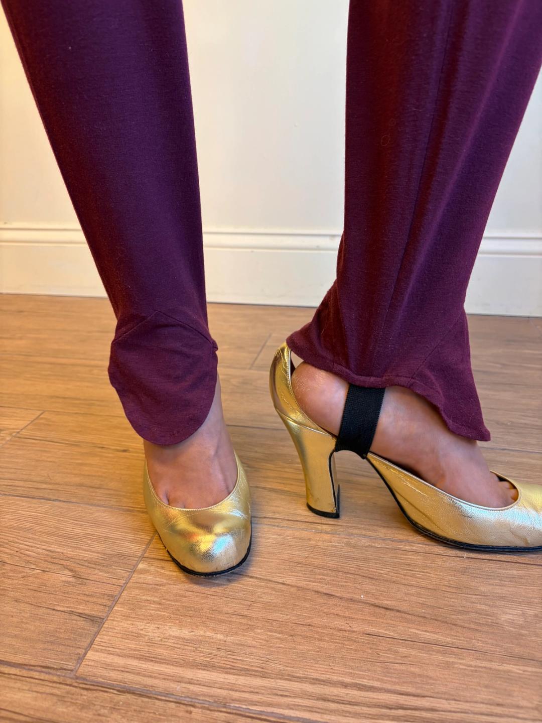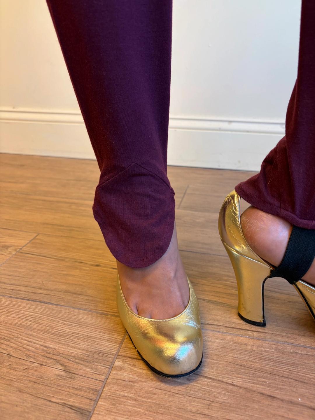 Vintage 1980s Norma Kamali plum leotard. The leotard has thumb holes and stirrups on the bottom of the pants. It zips up the back.