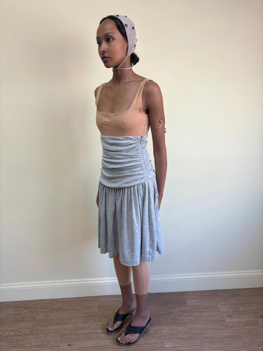 1980s OMO Norma Kamali gray skirt with ultra hi- waist cut with elegant ruching down the torso. The fabric is a soft t-shirt cotton and the skirt is flow-y and full. In pristine condition.