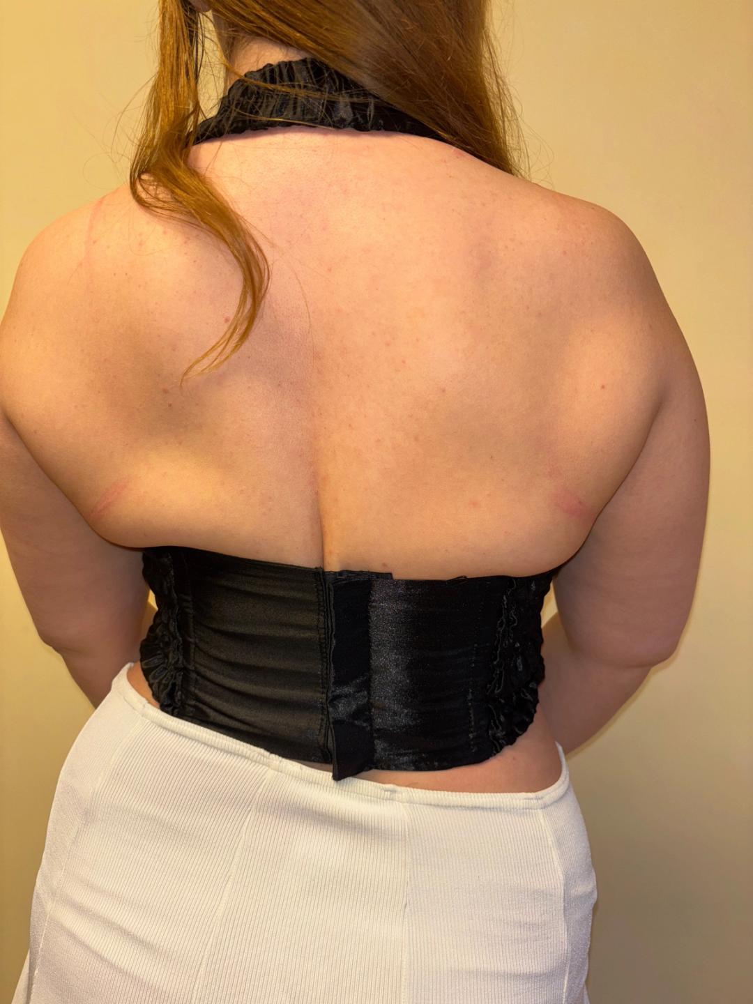 80s sequin bustier with card game like symbols from France. It's a halter style with hook and eye closures. There are 3 different size closures.