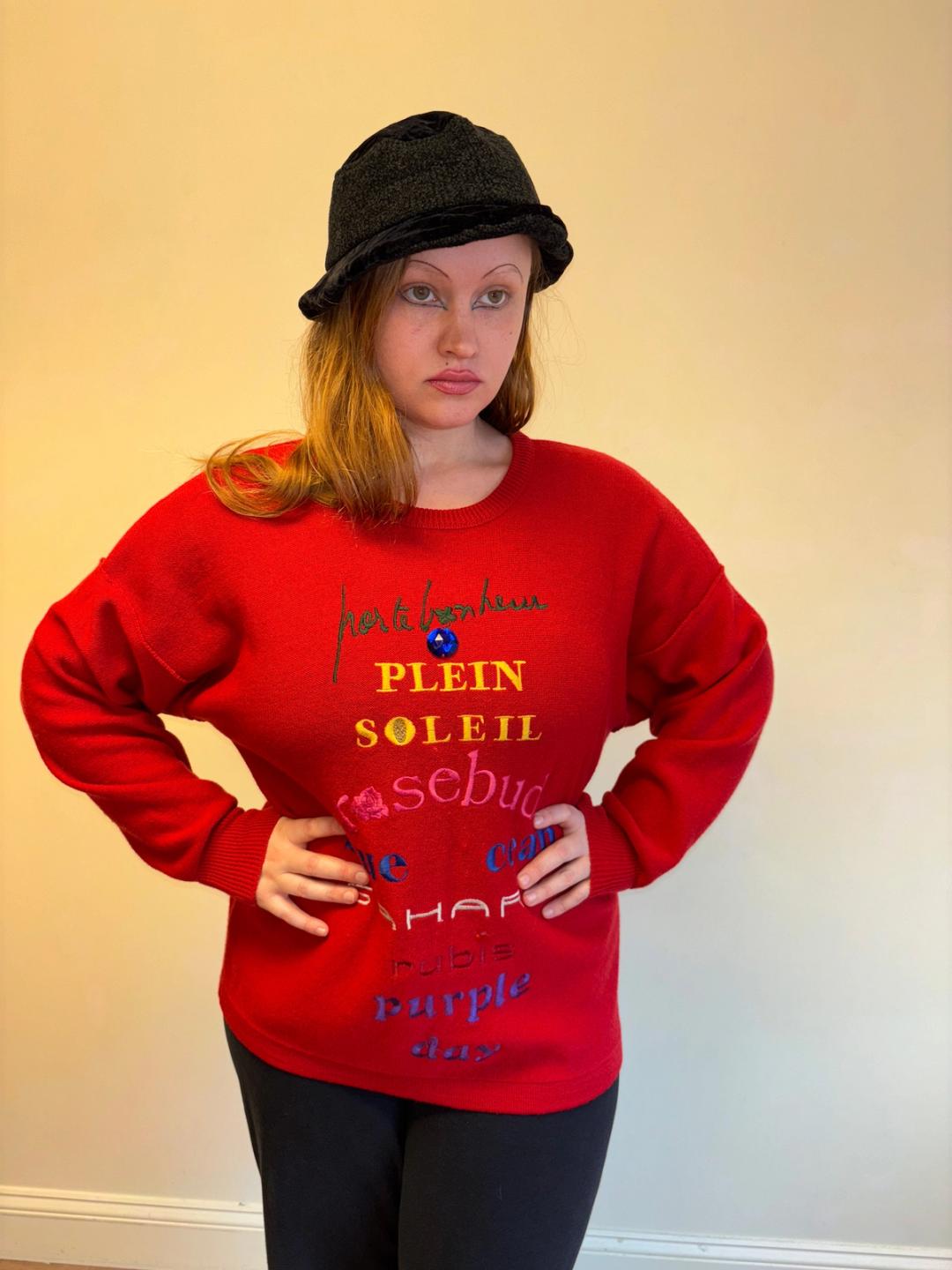 1980s red sweater by Sonia Rykiel with large dimensional gem stone and embroidered text. The text features different poetic colors with matching color embroidery. Fairly free size.