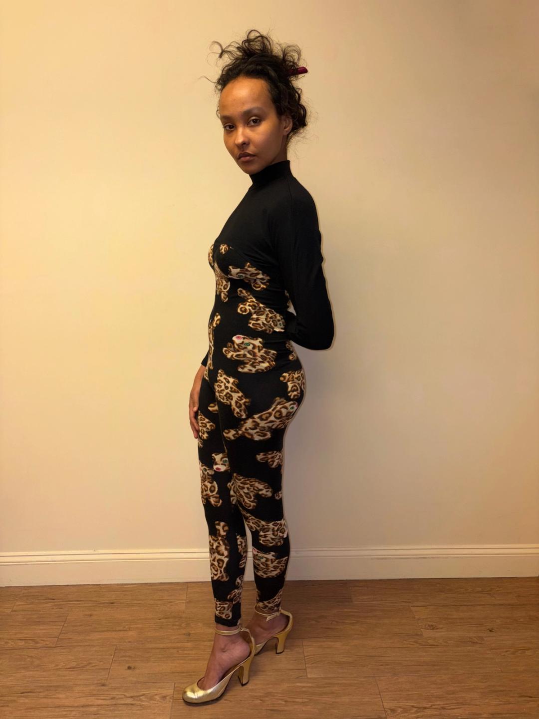 Rare 1980s Yvan & Marzia bodysuit. The bodysuit has a unique stuffed animal leopard print throughout. It has a mock neck and sweat heart neckline. It has a zipper closure on the back. Stretchy.