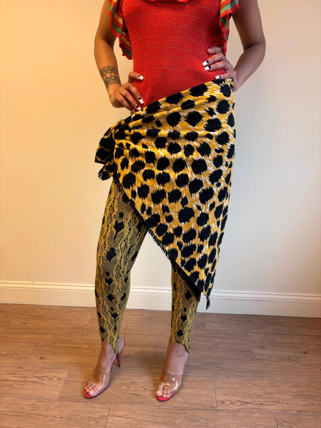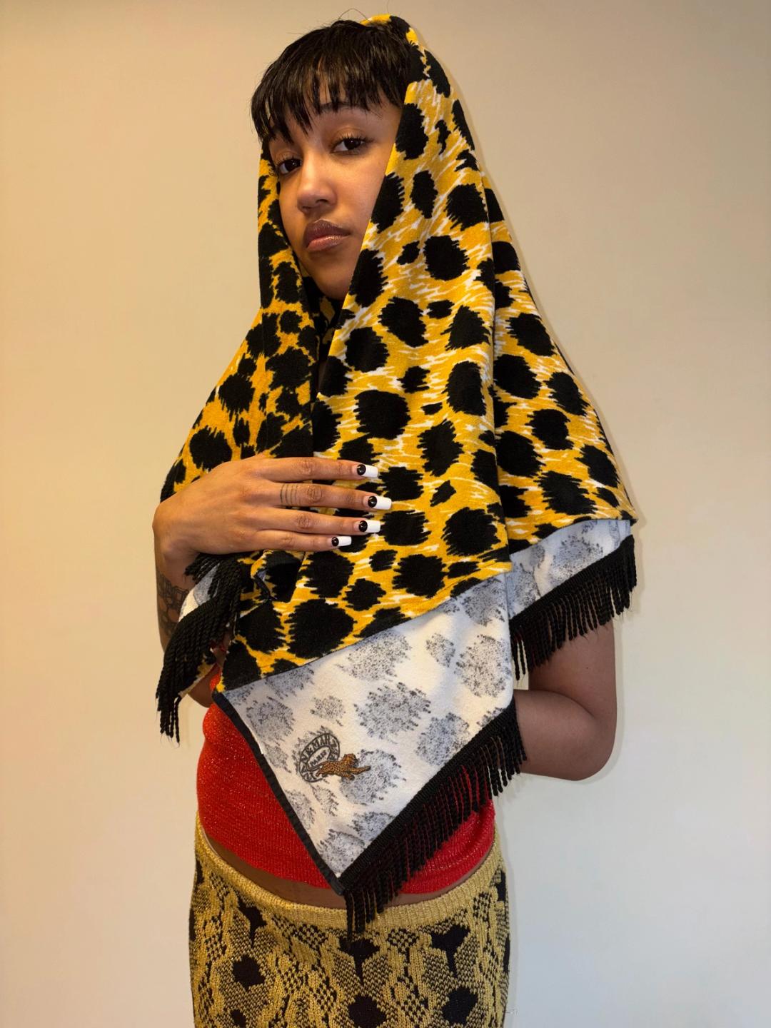 80s Yvan & Marzia large terrycloth shawl, skirt or towel. It is quite large -- large enough to be a beach towel and double as a fashion accessory. It has a vibrant leopard print and tassel fringe. In excellent condition!