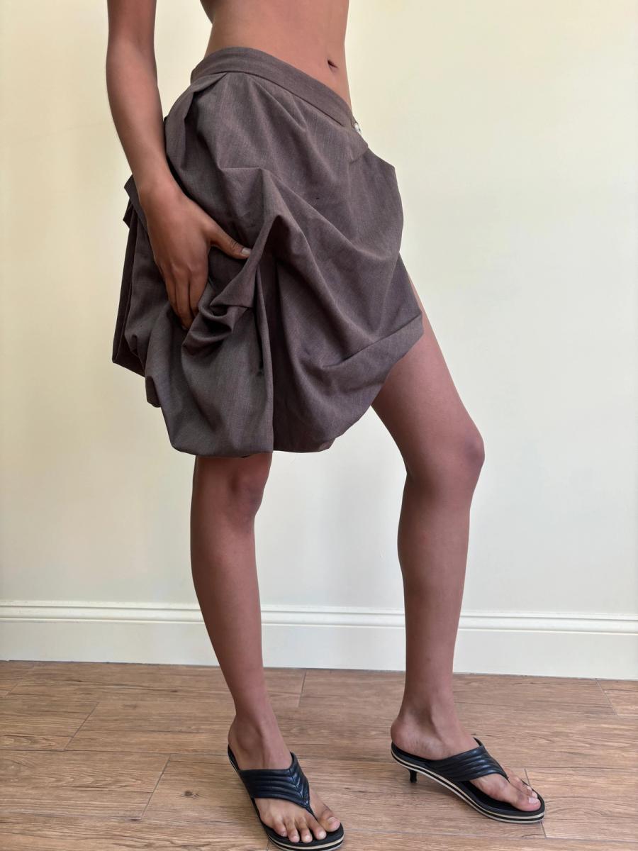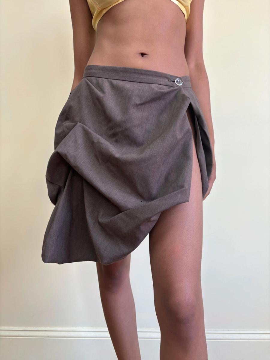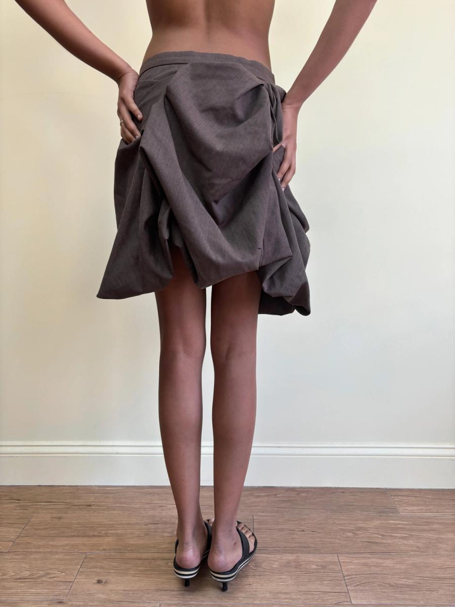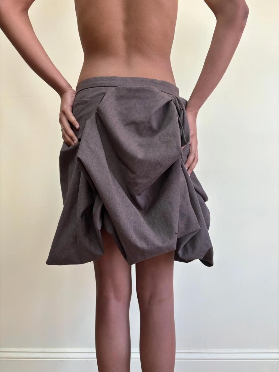 Rare 90s 20471120 skirt with all over ruched and deformed design. The skirt has a high slit on one side. Could be worn alone or layered over pants. There are some petite moth holes throughout the skirt -- otherwise in excellent condition. Unisex.